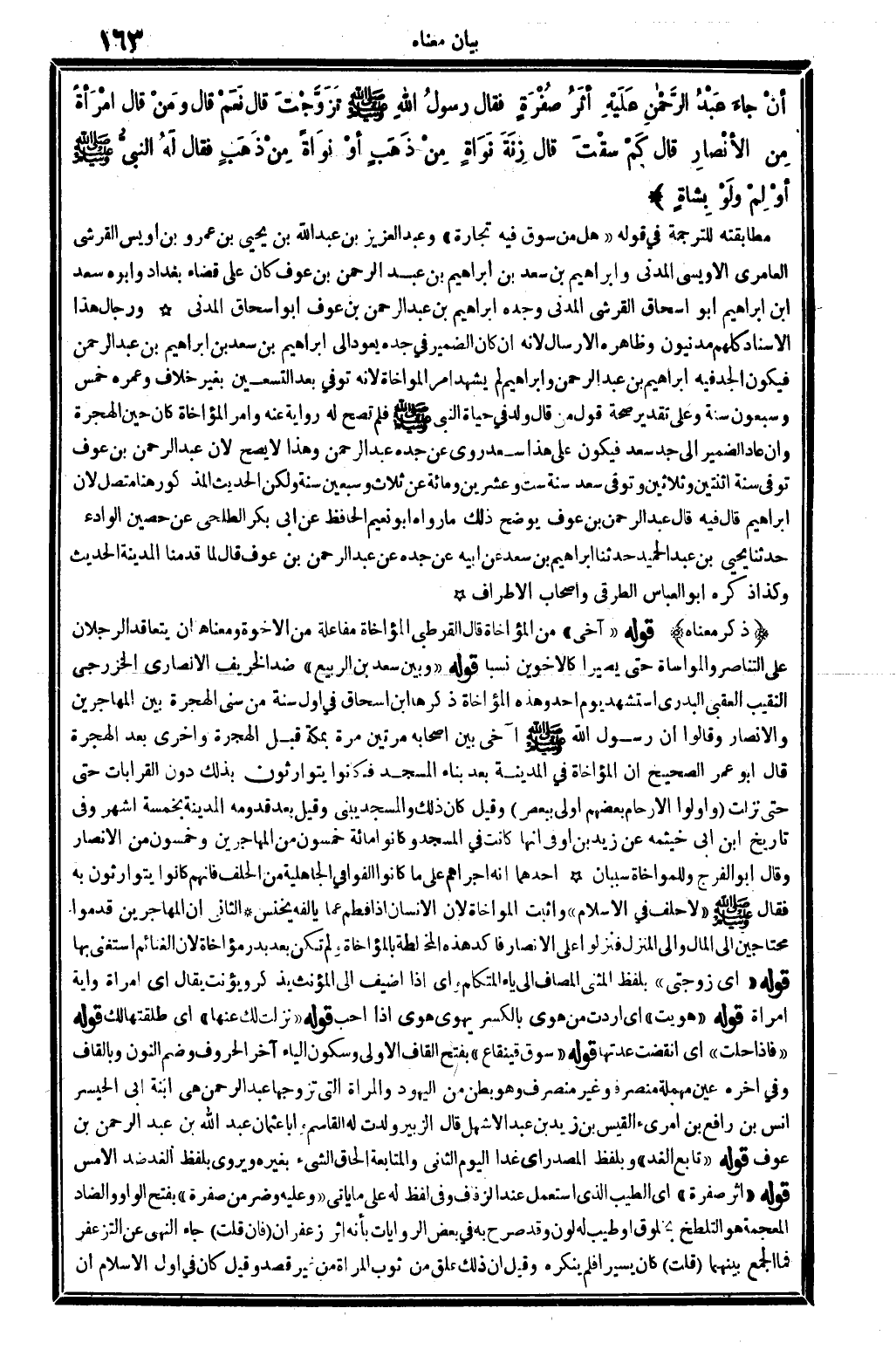 أنْ جاءَ عَبْدُ الرَّحْمانُ عَلَيْهِ أثَرُ صُفْرَةٍ فَقَالَ رسولُ الله صلى الله عَلَيْهِ وَسلم تَزَوَّجْتَ قالَ نَعَمْ قَالَ ومَنْ؟ قالَ امْرأةً مِنَ الأنْصَارِ قَالَ كَمْ سُقْتَ قَالَ زِنَةَ نَوَاةٍ مِنْ ذَهَبٍ أوْ نَواة مِنْ ذَهَبٍ فَقَالَ لَهُ النبيُّ صلى الله عَلَيْهِ وَسلم أوْلِمْ ولَوْ بِشَاةٍ. ا (لحَدِيث 8402 طرفه فِي: 0873) .
