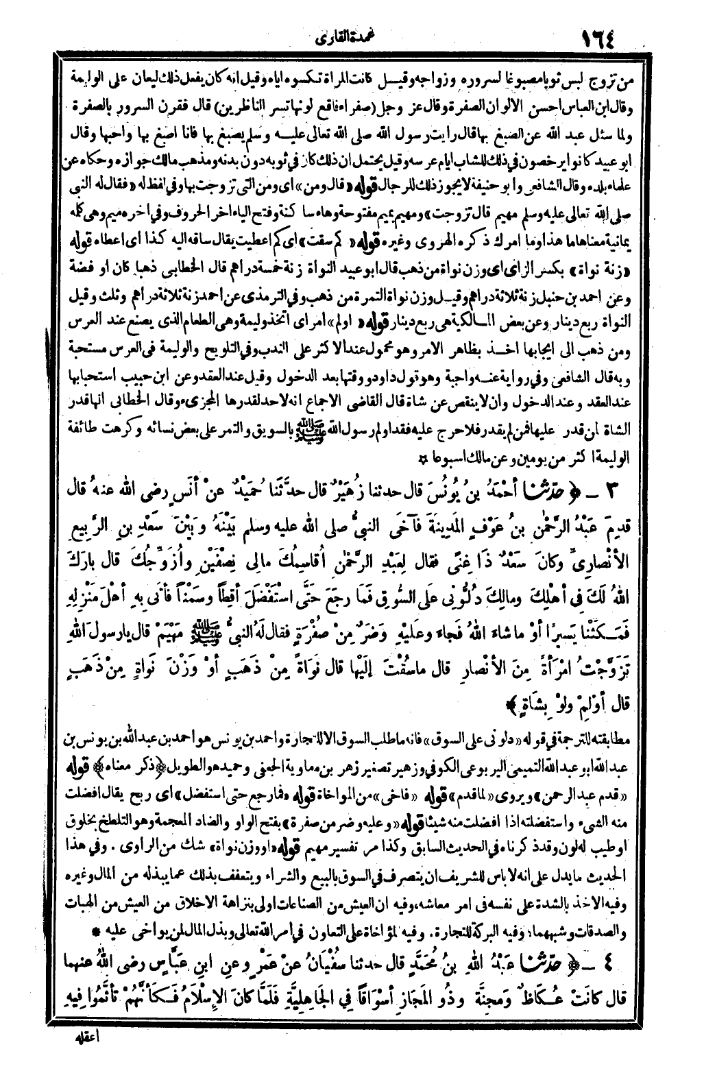 من تزوج لبس ثوبا مصبوغا لسرورة وزواجه. وَقيل: كَانَت الْمَرْأَة تكسوه إِيَّاه. وَقيل: إِنَّه كَانَ يفعل ذَلِك ليعان على الْوَلِيمَة. وَقَالَ ابْن الْعَبَّاس: أحسن الألوان الصُّفْرَة. وَقَالَ عز وَجل: {صفراء فَاقِع لَوْنهَا تسر الناظرين} (الْبَقَرَة: 96) قَالَ فقرن السرُور بالصفرة. وَلما سُئِلَ عبد الله عَن الصَّبْغ بهَا، قَالَ: رَأَيْت رَسُول الله، صلى الله عَلَيْهِ وَسلم، يصْبغ بهَا فَأَنا أصبغ بهَا وأحبها، وَقَالَ أَبُو عبيد: كَانُوا يرخصون فِي ذَلِك للشاب أَيَّام عرسه. وَقيل: يحْتَمل أَن ذَلِك كَانَ فِي ثَوْبه دون بدنه، وَمذهب مَالك جَوَازه، وَحَكَاهُ عَن عُلَمَاء بَلَده. وَقَالَ الشَّافِعِي وَأَبُو حنيفَة: لَا يجوز ذَلِك للرِّجَال. قَوْله: (قَالَ: وَمن؟) أَي: وَمن الَّتِي تزوجت بهَا؟ وَفِي لفظ لَهُ: (فَقَالَ لَهُ النَّبِي، صلى الله عَلَيْهِ وَسلم: مَهيم؟ قَالَ: تزوجت) و: مَهيم، بميم مَفْتُوحَة وهاء سَاكِنة وَفتح الْيَاء آخر الْحُرُوف وَفِي آخِره مِيم: وَهِي كلمة يَمَانِية مَعْنَاهَا: مَا هَذَا؟ وَمَا أَمرك؟ ذكره الْهَرَوِيّ وَغَيره. قَوْله: (كم سقت؟) أَي: كم أَعْطَيْت؟ يُقَال: سَاقه إِلَيْهِ كَذَا، أَي أعطَاهُ. قَوْله: (زنة نواة) ، بِكَسْر الزَّاي، أَي: وزن نواة من ذهب. قَالَ أَبُو عبيد: النواة زنة خَمْسَة دَرَاهِم. قَالَ الْخطابِيّ: ذَهَبا كَانَ أَو فضَّة. وَعَن أَحْمد بن حَنْبَل: زنة ثَلَاثَة دَرَاهِم، وَقيل: وزن نواة التَّمْر من ذهب. وَفِي التِّرْمِذِيّ عَن أَحْمد: زنة ثَلَاثَة دَرَاهِم وَثلث، وَقيل: النواة ربع دِينَار. وَعَن بعض الْمَالِكِيَّة: هِيَ ربع دِينَار. قَوْله: (أولم) أَمر، أَي: اتخذ وَلِيمَة، وَهِي الطَّعَام الَّذِي يصنع عِنْد الْعرس. وَمن ذهب إِلَى إِيجَابهَا أَخذ بِظَاهِر الْأَمر، وَهُوَ مَحْمُول عِنْد الْأَكْثَر على النّدب. وَفِي (التَّلْوِيح) : والوليمة فِي الْعرس مُسْتَحبَّة، وَبِه قَالَ الشَّافِعِي، وَفِي رِوَايَة عَنهُ: وَاجِبَة، وَهُوَ قَول دَاوُد، وَقتهَا بعد الدُّخُول، وَقيل: عِنْد العقد، وَعَن ابْن حبيب: استحبابها عِنْد العقد وَعند الدُّخُول، وَأَن لَا ينقص عَن شَاة. قَالَ القَاضِي: الْإِجْمَاع أَنه لَا حد لقدرها المجزىء. وَقَالَ الْخطابِيّ: إِنَّهَا قدر الشَّاة لمن قدر عَلَيْهَا، فَمن لم يقدر فَلَا حرج عَلَيْهِ، فقد أولم رَسُول الله صلى الله عَلَيْهِ وَسلم بالسويق وَالتَّمْر على بعض نِسَائِهِ، وكرهت طَائِفَة الْوَلِيمَة أَكثر من يَوْمَيْنِ، وَعَن مَالك أسبوعا.