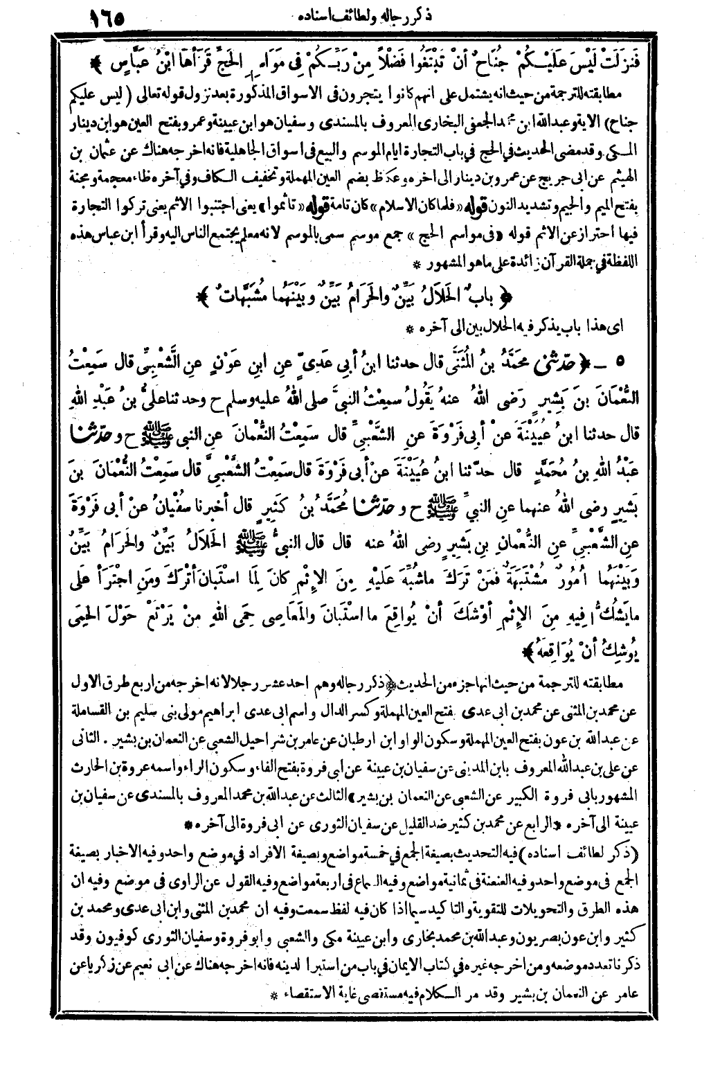 ذكر لطائف إِسْنَاده فِيهِ: التحديث بِصِيغَة الْجمع فِي خَمْسَة مَوَاضِع وبصيغة الْإِفْرَاد فِي مَوضِع وَاحِد. وَفِيه: الْإِخْبَار بِصِيغَة الْجمع فِي مَوضِع وَاجِد. وَفِيه: العنعنة فِي فِي ثَمَانِيَة مَوَاضِع. وَفِيه: السماع فِي أَرْبَعَة مَوَاضِع. وَفِيه: القَوْل عَن الرَّاوِي فِي مَوضِع. وَفِيه: أَن هَذِه الطّرق والتحويلات للتقوية والتأكيد، سِيمَا إِذا كَانَ فِيهِ لفظ سَمِعت وَفِيه: أَن مُحَمَّد بن الْمثنى وَابْن أبي عدي وَمُحَمّد بن كثير وَابْن عون بصريون، وَعبد الله بن مُحَمَّد بخاري وَابْن عُيَيْنَة مكي وَالشعْبِيّ وَأَبُو فَرْوَة وسُفْيَان الثَّوْريّ كوفيون.