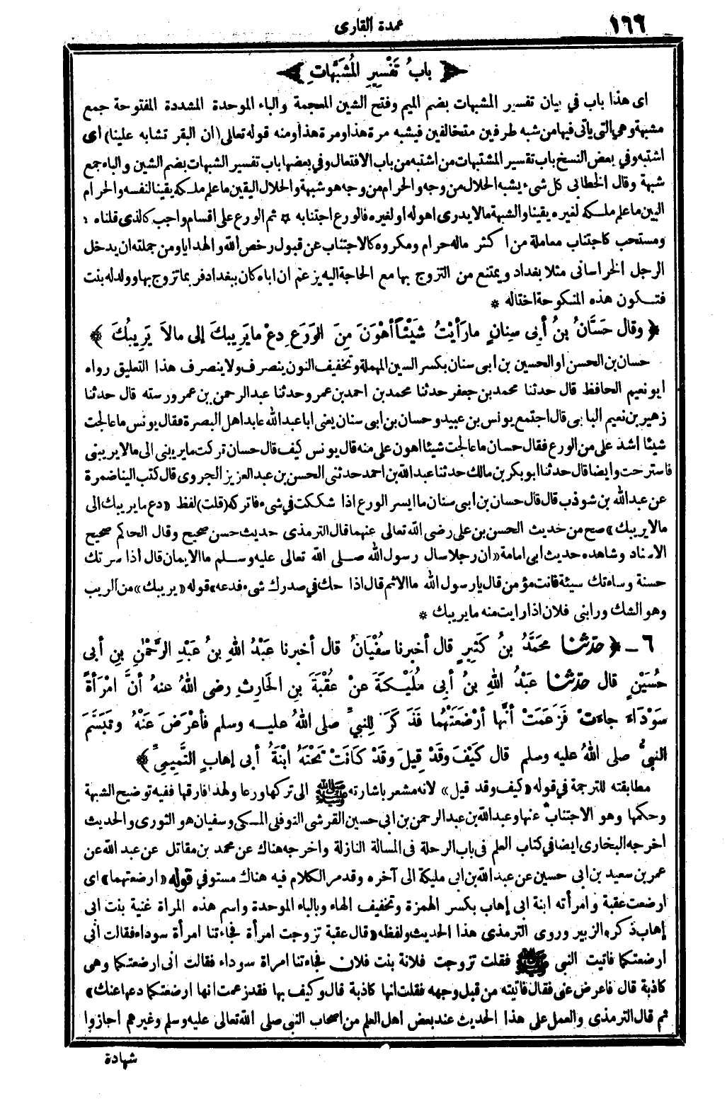 أَي: هَذَا بَاب فِي بَيَان تَفْسِير المشبهات، بِضَم الْمِيم وَفتح الشين الْمُعْجَمَة وَالْبَاء الْمُوَحدَة الْمُشَدّدَة الْمَفْتُوحَة: جمع مشبهة، وَهِي الَّتِي يَأْتِي فِيهَا من شبه طرفين متخالفين، فَيُشبه مرّة هَذَا وَمرَّة هَذَا، وَمِنْه قَوْله تَعَالَى: {إِن الْبَقر تشابه علينا} (الْبَقَرَة: 07) . أَي: اشْتبهَ، وَفِي بعض النّسخ: بَاب تَفْسِير المشتبهات، من اشْتبهَ من بَاب الافتعال، وَفِي بَعْضهَا: بَاب تَفْسِير الشُّبُهَات، بِضَم الشين وَالْبَاء، جمع شُبْهَة. وَقَالَ الْخطابِيّ: كل شَيْء يسبه الْحَلَال من وَجه وَالْحرَام من وَجه هُوَ شُبْهَة، والحلال الْيَقِين: مَا علم ملكه يَقِينا لنَفسِهِ، وَالْحرَام الْبَين مَا علم ملكه لغيره يَقِينا، والشبهة: مَا لَا يدْرِي أهوَ لَهُ أَو لغيره، فالورع اجتنابه. ثمَّ الْوَرع على أَقسَام: وَاجِب، كَالَّذي قُلْنَاهُ. ومستحب، كاجتناب مُعَاملَة من أَكثر مَاله حرَام، ومكروه كالاجتناب عَن قبُول رخص الله والهدايا، وَمن جملَته أَن يدْخل الرجل الْخُرَاسَانِي مثلا بَغْدَاد وَيمْتَنع من التَّزَوُّج بهَا مَعَ الْحَاجة إِلَيْهِ، يزْعم أَن أَبَاهُ كَانَ بِبَغْدَاد فَرُبمَا تزوج بهَا وَولد لَهُ بنت، فَتكون هَذِه الْمَنْكُوحَة أُخْتا لَهُ.