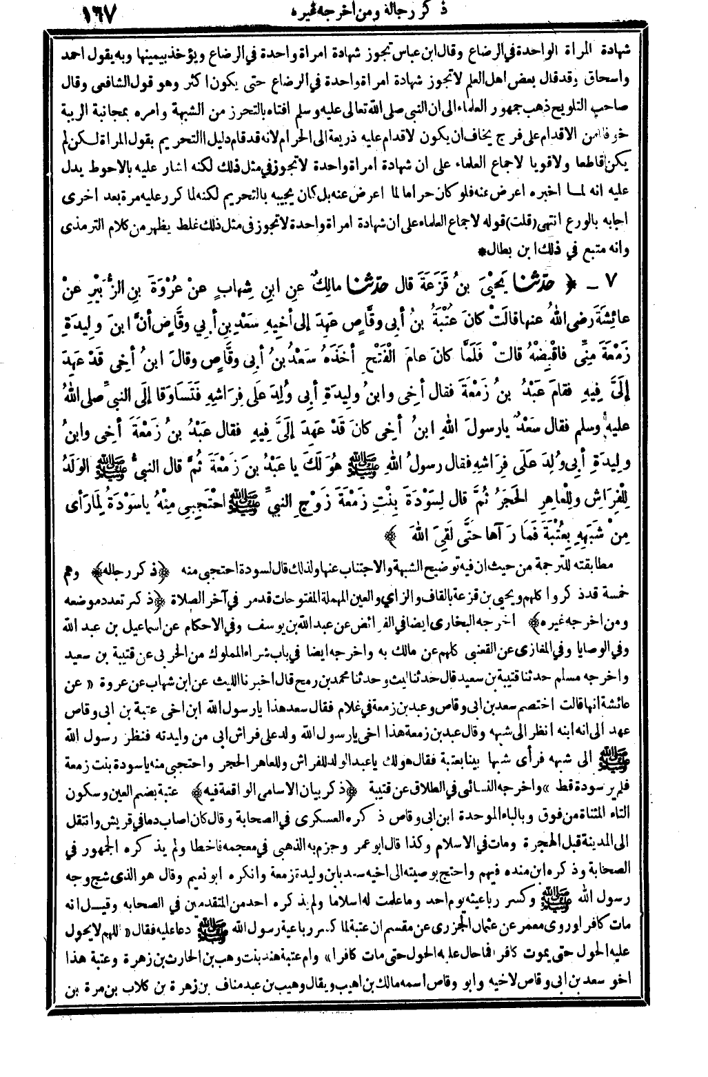 7 - (حَدثنَا يحيى بن قزعة قَالَ حَدثنَا مَالك عَن ابْن شهَاب عَن عُرْوَة بن الزبير عَن عَائِشَة رَضِي الله عَنْهَا قَالَت كَانَ عتبَة بن أبي وَقاص عهد إِلَى أَخِيه سعد بن أبي وَقاص أَن ابْن وليدة زَمعَة مني فاقبضه قَالَت فَلَمَّا كَانَ عَام الْفَتْح أَخذه سعد بن أبي وَقاص وَقَالَ ابْن أخي قد عهد إِلَيّ فِيهِ فَقَامَ عبد بن زَمعَة فَقَالَ أخي وَابْن وليدة أبي ولد على فرَاشه فتساوقا إِلَى النَّبِي - صَلَّى اللَّهُ عَلَيْهِ وَسَلَّم َ - فَقَالَ سعد يَا رَسُول الله ابْن أخي كَانَ قد عهد إِلَيّ فِيهِ فَقَالَ عبد بن زَمعَة أخي وَابْن وليدة أبي ولد على فرَاشه فَقَالَ رَسُول الله - صَلَّى اللَّهُ عَلَيْهِ وَسَلَّم َ - هُوَ لَك يَا عبد بن زَمعَة ثمَّ قَالَ النَّبِي - صَلَّى اللَّهُ عَلَيْهِ وَسَلَّم َ - الْوَلَد للْفراش وللعاهر الْحجر ثمَّ قَالَ لسودة بنت زَمعَة زوج النَّبِي - صَلَّى اللَّهُ عَلَيْهِ وَسَلَّم َ - احتجبي مِنْهُ يَا سَوْدَة لما رأى من شبهه بِعتبَة فَمَا رَآهَا حَتَّى لَقِي الله) مطابقته للتَّرْجَمَة من حَيْثُ أَن فِيهِ توضيح الشُّبْهَة والاجتناب عَنْهَا وَلذَلِك قَالَ لسودة احتجبي مِنْهُ. (ذكر رِجَاله) وهم خَمْسَة قد ذكرُوا كلهم وَيحيى بن قزعة بِالْقَافِ وَالزَّاي وَالْعين الْمُهْملَة المفتوحات قد مر فِي آخر الصَّلَاة. (ذكر تعدد مَوْضِعه وَمن أخرجه غَيره) أخرجه البُخَارِيّ أَيْضا فِي الْفَرَائِض عَن عبد الله بن يُوسُف وَفِي الْأَحْكَام عَن إِسْمَاعِيل بن عبد الله وَفِي الْوَصَايَا وَفِي الْمَغَازِي عَن القعْنبِي كلهم عَن مَالك بِهِ وَأخرجه أَيْضا فِي بَاب شِرَاء الْمَمْلُوك من الْحَرْبِيّ عَن قُتَيْبَة بن سعيد وَأخرجه مُسلم حَدثنَا قُتَيْبَة بن سعيد قَالَ حَدثنَا لَيْث وَحدثنَا مُحَمَّد بن رمح قَالَ أخبرنَا اللَّيْث عَن ابْن شهَاب عَن عُرْوَة " عَن عَائِشَة أَنَّهَا قَالَت اخْتصم سعد بن أبي وَقاص وَعبد بن زَمعَة فِي غُلَام فَقَالَ سعد هَذَا يَا رَسُول الله ابْن أخي عتبَة ابْن أبي وَقاص عهد إِلَى أَنه ابْنه انْظُر إِلَى شبهه وَقَالَ عبد بن زَمعَة هَذَا أخي يَا رَسُول الله ولد على فرَاش أبي من وليدته فَنظر رَسُول الله - صَلَّى اللَّهُ عَلَيْهِ وَسَلَّم َ - إِلَى شبهه فَرَأى شبها بَينا بِعتبَة فَقَالَ هُوَ لَك يَا عبد الْوَلَد للْفراش وللعاهر الْحجر واحتجبي مِنْهُ يَا سَوْدَة بنت زَمعَة فَلم ير سَوْدَة قطّ " وَأخرجه النَّسَائِيّ فِي الطَّلَاق عَن قُتَيْبَة. (ذكر بَيَان الْأَسَامِي الْوَاقِعَة فِيهِ) عتبَة بِضَم الْعين وَسُكُون التَّاء الْمُثَنَّاة من فَوق وبالباء الْمُوَحدَة ابْن أبي وَقاص ذكره العسكري فِي الصَّحَابَة وَقَالَ كَانَ أصَاب دَمًا فِي قُرَيْش وانتقل إِلَى الْمَدِينَة قبل الْهِجْرَة وَمَات فِي الْإِسْلَام وَكَذَا قَالَ أَبُو عمر وَجزم بِهِ الذَّهَبِيّ فِي مُعْجَمه فَأَخْطَأَ وَلم يذكرهُ الْجُمْهُور فِي الصَّحَابَة وَذكره ابْن مَنْدَه فيهم وَاحْتج بوصيته إِلَى أَخِيه سعد بِابْن وليدة زَمعَة وَأنْكرهُ أَبُو نعيم وَقَالَ هُوَ الَّذِي شج وَجه رَسُول الله - صَلَّى اللَّهُ عَلَيْهِ وَسَلَّم َ - وَكسر رباعيته يَوْم أحد وَمَا علمت لَهُ إسلاما وَلم يذكرهُ أحد من الْمُتَقَدِّمين فِي الصَّحَابَة وَقيل أَنه مَاتَ كَافِرًا وروى معمر عَن عُثْمَان الْجَزرِي عَن مقسم أَن عتبَة لما كسر ربَاعِية رَسُول الله - صَلَّى اللَّهُ عَلَيْهِ وَسَلَّم َ - دَعَا عَلَيْهِ فَقَالَ " اللَّهُمَّ لَا يحول عَلَيْهِ الْحول حَتَّى يَمُوت كَافِرًا فَمَا حَال عَلَيْهِ الْحول حَتَّى مَاتَ كَافِرًا " وَأم عتبَة هِنْد بنت وهب بن الْحَارِث بن زهرَة وَعتبَة هَذَا أَخُو سعد بن أبي وَقاص لِأَخِيهِ وَأَبُو وَقاص اسْمه مَالك بن أهيب وَيُقَال وهيب بن عبد منَاف بن زهرَة بن كلاب بن مرّة بن