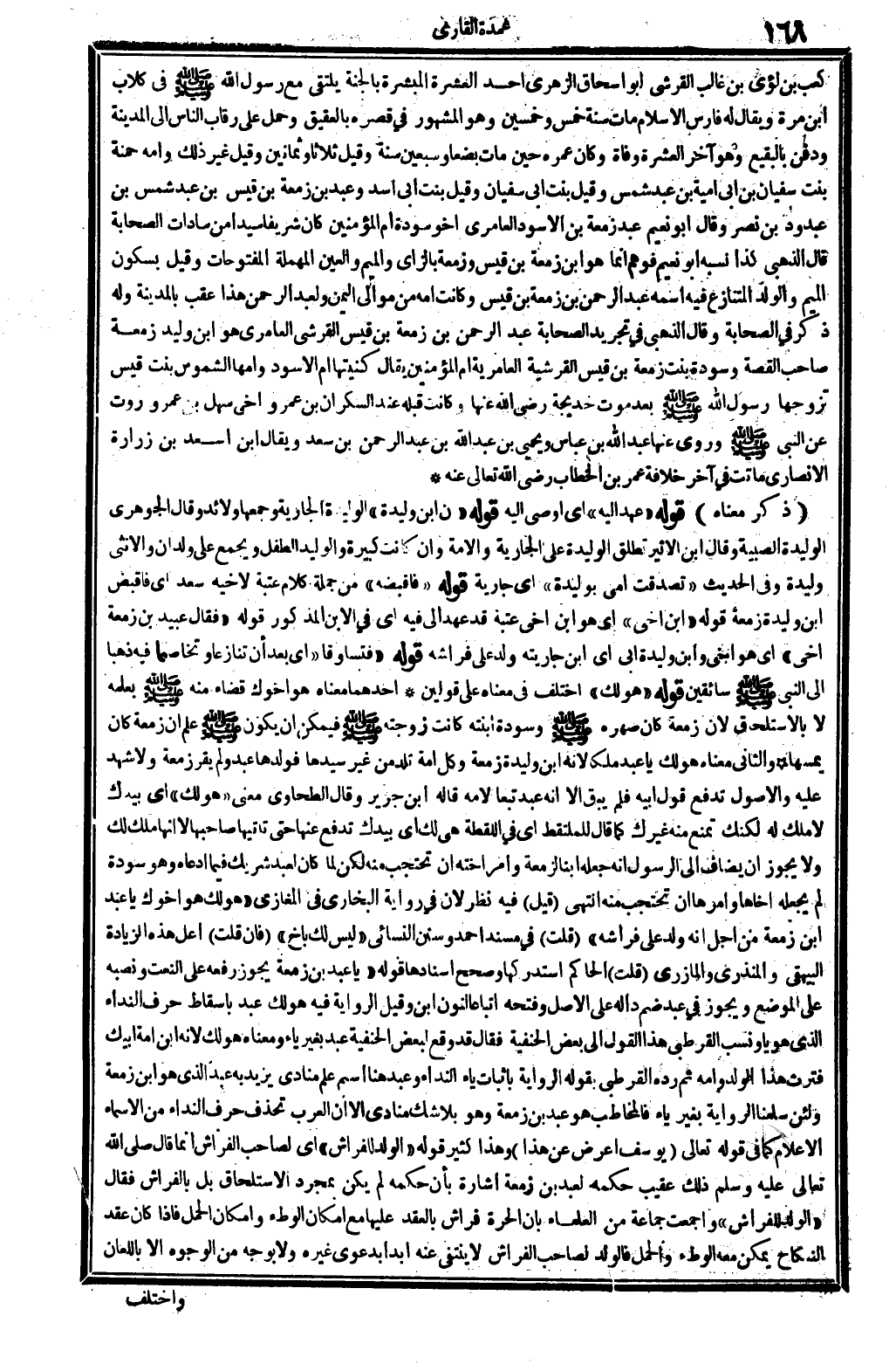 كَعْب بن لؤَي بن غَالب الْقرشِي أَبُو إِسْحَاق الزُّهْرِيّ أحد الْعشْرَة المبشرة بِالْجنَّةِ يلتقي مَعَ رَسُول الله - صَلَّى اللَّهُ عَلَيْهِ وَسَلَّم َ - فِي كلاب بن مرّة وَيُقَال لَهُ فَارس الْإِسْلَام مَاتَ سنة خمس وَخمسين وَهُوَ الْمَشْهُور فِي قصره بالعقيق وَحمل على رِقَاب النَّاس إِلَى الْمَدِينَة وَدفن بِالبَقِيعِ وَهُوَ آخر الْعشْرَة وَفَاة وَكَانَ عمره حينما مَاتَ بضعا وَسبعين سنة وَقيل ثَلَاثًا وَثَمَانِينَ وَقيل غير ذَلِك وَأمه حمْنَة بنت سُفْيَان بن أبي أُميَّة بن عبد شمس وَقيل بنت أبي سُفْيَان وَقيل بنت أبي أَسد وَعبد بن زَمعَة بن قيس بن عبد شمس بن عبد ود بن نصر وَقَالَ أَبُو نعيم عبد زَمعَة بن الْأسود العامري أَخُو سَوْدَة أم الْمُؤمنِينَ كَانَ شريفا سيدا من سَادَات الصَّحَابَة قَالَ الذَّهَبِيّ كَذَا نسبه أَبُو نعيم فَوَهم إِنَّمَا هُوَ ابْن زَمعَة بن قيس وَزَمعَة بالزاي وَالْمِيم وَالْعين الْمُهْملَة المفتوحات وَقيل بِسُكُون الْمِيم وَالْولد الْمُتَنَازع فِيهِ اسْمه عبد الرَّحْمَن بن زَمعَة بن قيس وَكَانَت أمه من موَالِي الْيمن ولعَبْد الرَّحْمَن هَذَا عقب بِالْمَدِينَةِ وَله ذكر فِي الصَّحَابَة وَقَالَ الذَّهَبِيّ فِي تَجْرِيد الصَّحَابَة عبد الرَّحْمَن بن زَمعَة بن قيس الْقرشِي العامري هُوَ ابْن وليد زَمعَة صَاحب الْقِصَّة وَسَوْدَة بنت زَمعَة بن قيس القرشية العامرية أم الْمُؤمنِينَ يُقَال كنيتها أم الْأسود وَأمّهَا الشموس بنت قيس تزَوجهَا رَسُول الله - صَلَّى اللَّهُ عَلَيْهِ وَسَلَّم َ - بعد موت خَدِيجَة رَضِي الله عَنْهَا وَكَانَت قبله عِنْد السَّكْرَان بن عمر وَأخي سهل بن عمر وروت عَن النَّبِي - صَلَّى اللَّهُ عَلَيْهِ وَسَلَّم َ - وروى عَنْهَا عبد الله بن عَبَّاس وَيحيى بن عبد الله بن عبد الرَّحْمَن بن سعد وَيُقَال ابْن أسعد بن زُرَارَة الْأنْصَارِيّ مَاتَت فِي آخر خلَافَة عمر بن الْخطاب رَضِي الله تَعَالَى عَنهُ (ذكر مَعْنَاهُ) قَوْله " عهد إِلَيْهِ " أَي أوصى إِلَيْهِ قَوْله " أَن ابْن وليدة " الوليدة الْجَارِيَة وَجَمعهَا ولائد وَقَالَ الْجَوْهَرِي الوليدة الصبية وَقَالَ ابْن الْأَثِير تطلق الوليدة على الْجَارِيَة وَالْأمة وَإِن كَانَت كَبِيرَة والوليد الطِّفْل وَيجمع على ولدان وَالْأُنْثَى وليدة وَفِي الحَدِيث " تَصَدَّقت أُمِّي بوليدة " أَي جَارِيَة قَوْله " فأقبضه " من جملَة كَلَام عتبَة لِأَخِيهِ سعد أَي فأقبض ابْن وليدة زَمعَة قَوْله " ابْن أخي " أَي هُوَ ابْن أخي عتبَة قد عهد إِلَيّ فِيهِ أَي فِي الابْن الْمَذْكُور قَوْله " فَقَالَ عبيد الله بن زَمعَة أخي " أَي هُوَ أخي وَابْن وليدة أبي أَي ابْن جَارِيَته ولد على فرَاشه قَوْله " فتساوقا " أَي بعد أَن تنَازعا وتخاصما فِيهِ ذَهَبا إِلَى النَّبِي - صَلَّى اللَّهُ عَلَيْهِ وَسَلَّم َ - سائقين قَوْله " هُوَ لَك " اخْتلف فِي مَعْنَاهُ على قَوْلَيْنِ أَحدهمَا مَعْنَاهُ هُوَ أَخُوك قَضَاء مِنْهُ - صَلَّى اللَّهُ عَلَيْهِ وَسَلَّم َ - بِعِلْمِهِ لَا بالإستلحاق لِأَن زَمعَة كَانَ صهره - صَلَّى اللَّهُ عَلَيْهِ وَسَلَّم َ - وَسَوْدَة ابْنَته كَانَت زَوجته - صَلَّى اللَّهُ عَلَيْهِ وَسَلَّم َ - فَيمكن أَن يكون - صَلَّى اللَّهُ عَلَيْهِ وَسَلَّم َ - علم أَن زَمعَة كَانَ يَمَسهَا وَالثَّانِي مَعْنَاهُ هُوَ لَك يَا عبد ملكا لِأَنَّهُ ابْن وليدة زَمعَة وكل أمة تَلد من غير سَيِّدهَا فولدها عبد وَلم يقر زَمعَة وَلَا شهد عَلَيْهِ وَالْأُصُول تدفع قَول أَبِيه فَلم يبْق إِلَّا أَنه عبد تبعا لأمه قَالَه ابْن جرير وَقَالَ الطَّحَاوِيّ معنى " هُوَ لَك " أَي بِيَدِك لَا ملك لَهُ لكنك تمنع مِنْهُ غَيْرك كَمَا قَالَ للملتقط أَي فِي اللّقطَة هِيَ لَك أَي بِيَدِك تدفع عَنْهَا حَتَّى تأتيها صَاحبهَا لَا أَنَّهَا ملك لَك وَلَا يجوز أَن يُضَاف إِلَى الرَّسُول أَنه جعله ابْنا ل