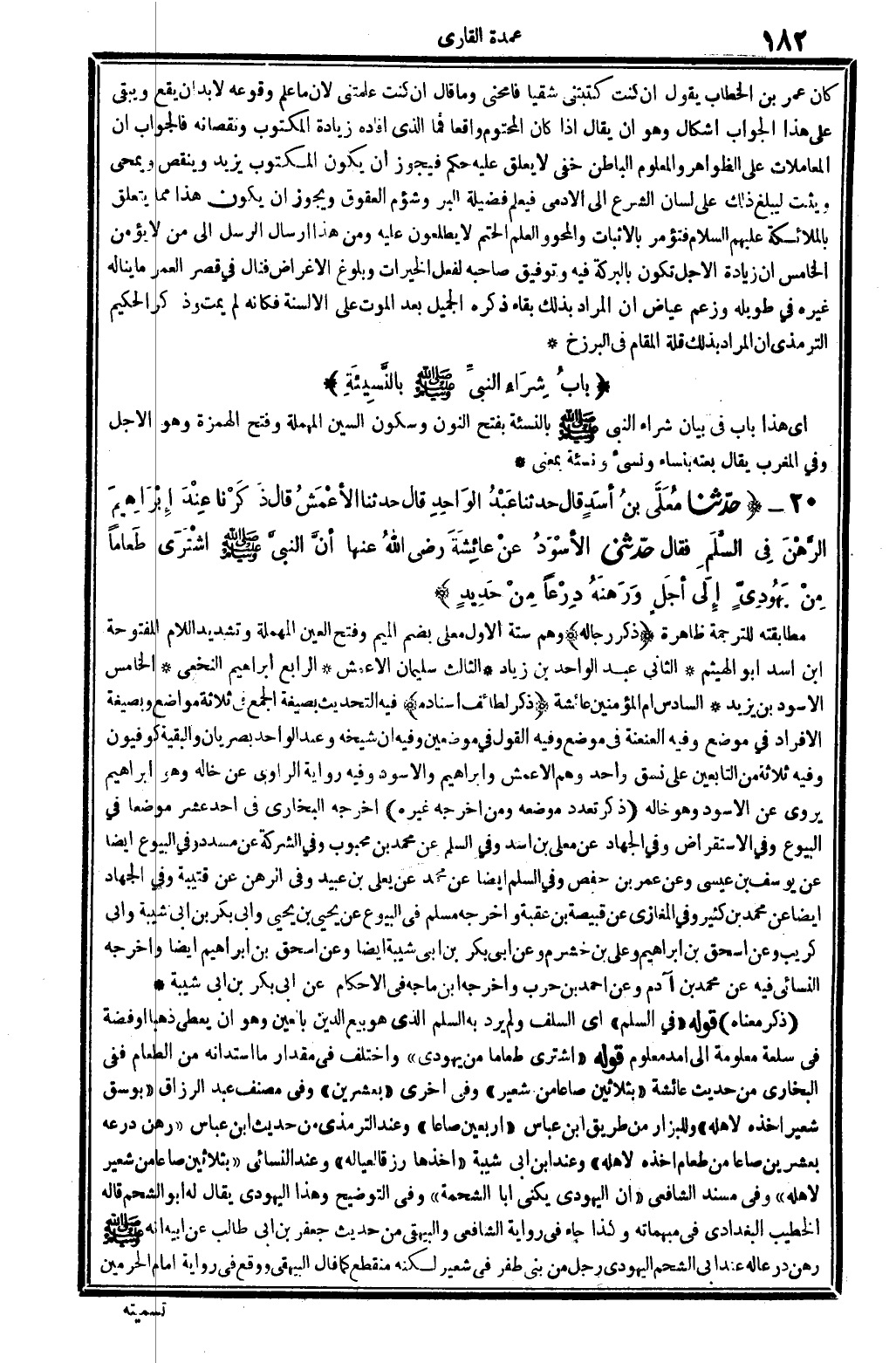 ذكر تعدد مَوْضِعه وَمن أخرجه غَيره: أخرجه البُخَارِيّ فِي أحد عشر موضعا فِي الْبيُوع وَفِي الاستقراض وَفِي الْجِهَاد عَن مُعلى بن أَسد، وَفِي السّلم عَن مُحَمَّد بن مَحْبُوب، وَفِي الشّركَة عَن مُسَدّد وَفِي الْبيُوع أَيْضا عَن يُوسُف بن عِيسَى وَعَن عمر بن حَفْص وَفِي السّلم أَيْضا عَن مُحَمَّد عَن يعلى بن عبيد وَفِي الرَّهْن عَن قُتَيْبَة وَفِي الْجِهَاد أَيْضا عَن مُحَمَّد بن كثير وَفِي الْمَغَازِي عَن قبيصَة بن عقبَة. وَأخرجه مُسلم فِي الْبيُوع عَن يحيى بن يحيى وَأبي بكر بن أبي شيبَة وَأبي كريب وَعَن إِسْحَاق بن إِبْرَاهِيم وَعلي بن خشرم وَعَن أبي بكر بن أبي شيبَة أَيْضا وَعَن إِسْحَاق بن إِبْرَاهِيم أَيْضا. وَأخرجه النَّسَائِيّ فِيهِ عَن مُحَمَّد بن آدم وَعَن أَحْمد بن حَرْب. وَأخرجه ابْن مَاجَه فِي الْأَحْكَام عَن أبي بكر بن أبي شيبَة.