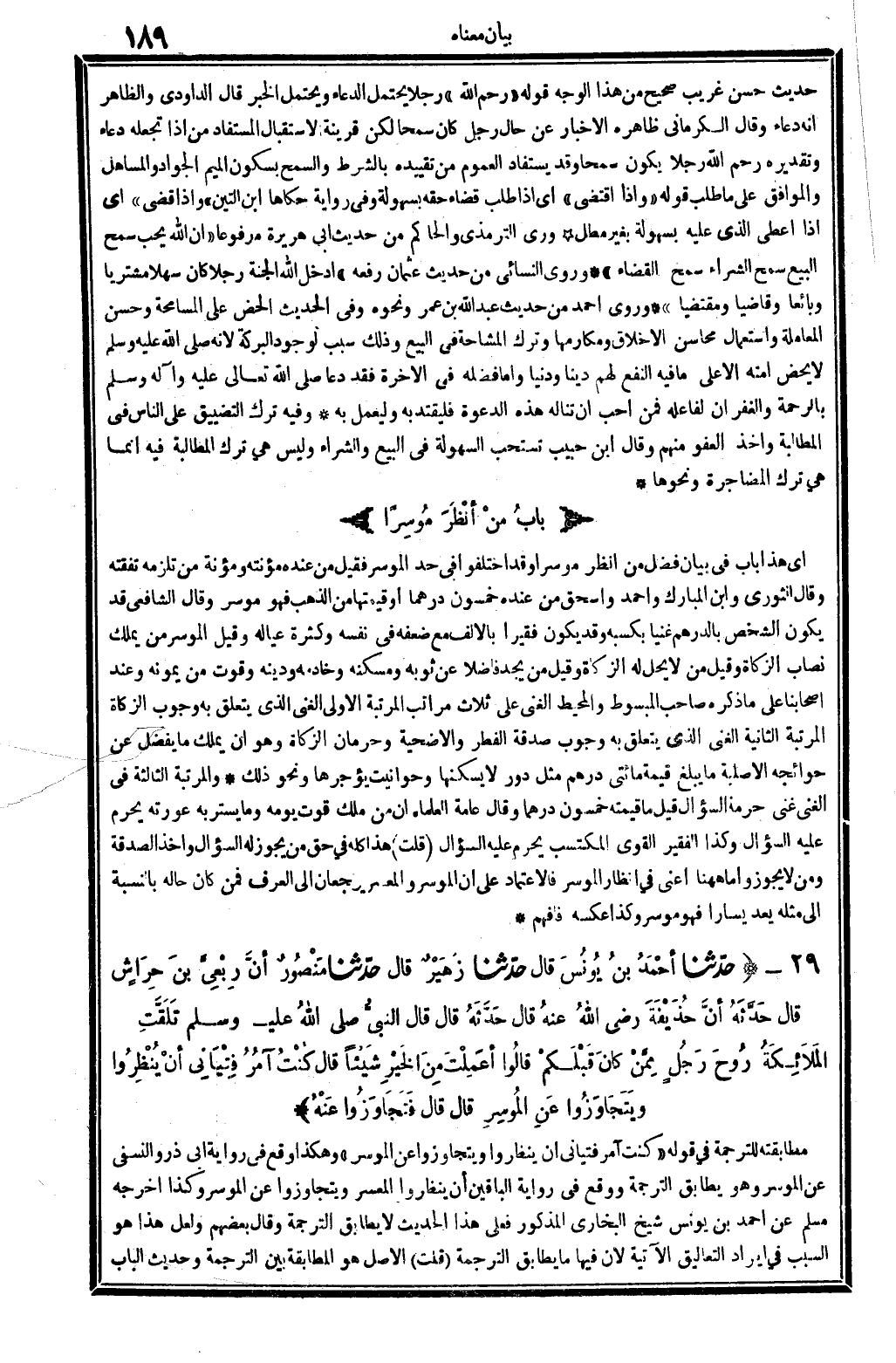وروى التِّرْمِذِيّ وَالْحَاكِم من حَدِيث أبي هُرَيْرَة مَرْفُوعا: (إِن الله يحب سمح البيع سمح الشِّرَاء سمح الْقَضَاء) . وروى النَّسَائِيّ من حَدِيث عُثْمَان رَفعه: (أَدخل الله الْجنَّة رجلا كَانَ سهلاً مُشْتَريا وبائعا وقاضيا ومقتضيا) . وروى أَحْمد من حَدِيث عبد الله بن عمر وَنَحْوه. وَفِي الحَدِيث الحض على الْمُسَامحَة وَحسن الْمُعَامَلَة وَاسْتِعْمَال محَاسِن الْأَخْلَاق ومكارمها وَترك المشاحة فِي البيع، وَذَلِكَ سَبَب لوُجُود الْبركَة، لِأَنَّهُ، صلى الله عَلَيْهِ وَسلم، لَا يحض أمته إلاَّ على مَا فِيهِ النَّفْع لَهُم دينا وَدُنْيا. وَأما فَضله فِي الْآخِرَة فقد دَعَا، صلى الله عَلَيْهِ وَسلم، بِالرَّحْمَةِ والغفران لفَاعِله، فَمن أحب أَن تناله هَذِه الدعْوَة فليقتد بِهِ وليعمل بِهِ.