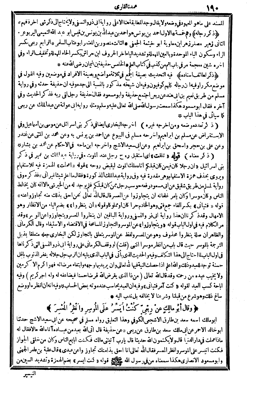 ذكر لطائف إِسْنَاده فِيهِ: التحديث بِصِيغَة الْجمع فِي ثَلَاثَة مَوَاضِع وبصيغة الْإِفْرَاد فِي موضِعين. وَفِيه: القَوْل فِي مَوضِع مكررا. وَفِيه: أَن رِجَاله كلهم كوفيون. وَفِيه: أَن شَيْخه مَذْكُور بِالنِّسْبَةِ إِلَى جده. وَفِيه: أَن حُذَيْفَة حَدثهُ وَفِي رِوَايَة مُسلم من طَرِيق نعيم بن أبي هِنْد عَن ربعي: اجْتمع حُذَيْفَة وَأَبُو مَسْعُود فَقَالَ حُذَيْفَة: رجل لَقِي ربه ... فَذكر الحَدِيث، وَفِي آخِره: فَقَالَ أَبُو مَسْعُود: هَكَذَا سَمِعت رَسُول الله، صلى الله عَلَيْهِ وَسلم، وَمثله رِوَايَة أبي عوَانَة عَن عبد الْملك عَن ربعي، كَمَا سَيَأْتِي فِي هَذَا الْبَاب.