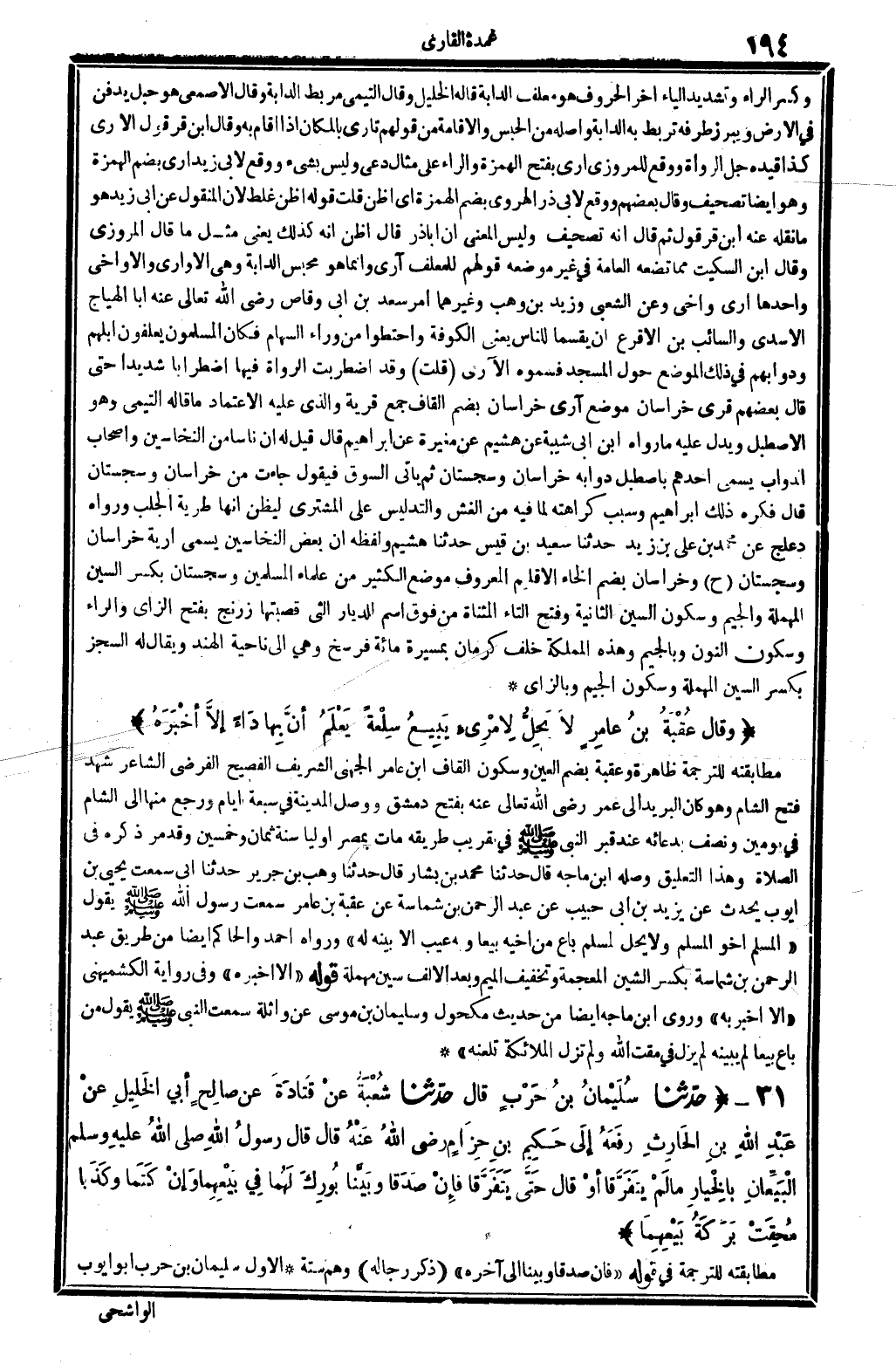 31 - (حَدثنَا سُلَيْمَان بن حَرْب قَالَ حَدثنَا شُعْبَة عَن قَتَادَة عَن صَالح أبي الْخَلِيل عَن عبد الله بن الْحَارِث رَفعه إِلَى حَكِيم بن حزَام رَضِي الله عَنهُ قَالَ قَالَ رَسُول الله - صَلَّى اللَّهُ عَلَيْهِ وَسَلَّم َ - البيعان بِالْخِيَارِ مَا لم يَتَفَرَّقَا أَو قَالَ حَتَّى يَتَفَرَّقَا فَإِن صدقا وَبينا بورك لَهما فِي بيعهمَا وَإِن كتما وكذبا محقت بركَة بيعهمَا) مطابقته للتَّرْجَمَة فِي قَوْله " فَإِن صدقا وَبينا إِلَى آخِره " (ذكر رِجَاله) وهم سِتَّة. الأول سُلَيْمَان بن حَرْب أَبُو أَيُّوب -