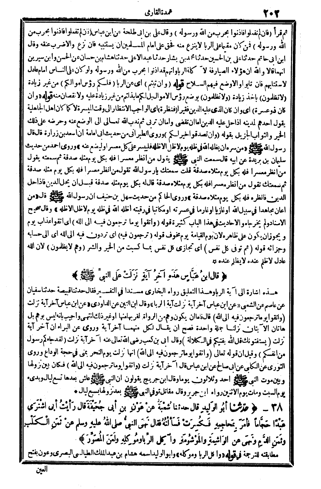 هَذِه إِشَارَة إِلَى آيَة الرِّبَا، وَهَذَا التَّعْلِيق رَوَاهُ البُخَارِيّ مُسْندًا فِي التَّفْسِير، فَقَالَ: حَدثنَا قبيصَة حَدثنَا سُفْيَان عَن عَاصِم عَن الشّعبِيّ عَن ابْن عَبَّاس: آخر آيَة نزلت آيَة الرِّبَا) . وَقَالَ ابْن التِّين عَن الدَّاودِيّ (عَن ابْن عَبَّاس: آخر آيَة نزلت {اتَّقوا يَوْمًا ترجعون فِيهِ إِلَى الله} (الْبَقَرَة: 872) . قَالَ: فإمَّا أَن يكون وهم من الروَاة لقربها مِنْهَا، أَو غير ذَلِك. انْتهى. وَأجِيب: بِأَنَّهُ لَيْسَ بوهم، بل هَاتَانِ الْآيَتَانِ نزلتا جملَة وَاحِدَة، فصح أَن يُقَال لكل مِنْهُمَا آخر آيَة. وروى عَن الْبَراء أَن آخر آيَة نزلت: {يستفتونك! قل الله يفتيكم فِي الْكَلَالَة} (النِّسَاء: 672) . وَقَالَ أبي بن كَعْب، رَضِي الله تَعَالَى عَنهُ: آخر آيَة نزلت: {لقد جَاءَكُم رَسُول من أَنفسكُم} (التَّوْبَة: 821) . وَقيل: إِن قَوْله تَعَالَى: {وَاتَّقوا يَوْمًا ترجعون فِيهِ إِلَى الله} (الْبَقَرَة: 872) . إِنَّهَا نزلت يَوْم النَّحْر بمنى فِي حجَّة الْوَدَاع، وروى الثَّوْريّ عَن الْكَلْبِيّ عَن أبي صَالح عَن ابْن عَبَّاس، قَالَ: آخر آيَة نزلت: {وَاتَّقوا يَوْمًا ترجعون فِيهِ إِلَى الله} (الْبَقَرَة: 872) . فَكَانَ بَين نُزُولهَا وَبَين موت النَّبِي صلى الله عَلَيْهِ وَسلم أحد وَثَلَاثُونَ يَوْمًا. وَقَالَ ابْن جريج: يَقُولُونَ إِن النَّبِي صلى الله عَلَيْهِ وَسلم عَاشَ بعْدهَا تسع لَيَال، وبدىء يَوْم السبت وَمَات يَوْم الْإِثْنَيْنِ، رَوَاهُ ابْن جرير، وَقَالَ مقَاتل: توفّي النَّبِي صلى الله عَلَيْهِ وَسلم بعد نُزُولهَا بِسبع ليالٍ.