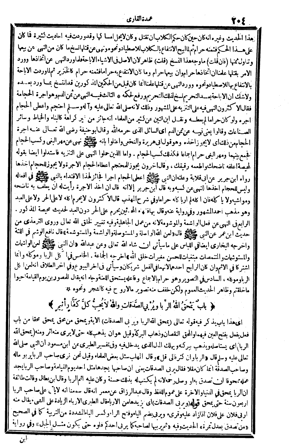 أَي: هَذَا بَاب يذكر فِيهِ قَوْله تَعَالَى: {يمحق الله الرِّبَا ويربي الصَّدقَات} (الْبَقَرَة: 672) . الْآيَة. ويمحق: من محق يمحق محقا من بَاب فعل يفعل بِفَتْح الْعين فيهمَا، والمحق النُّقْصَان وَذَهَاب الْبركَة. وَقيل: هُوَ أَن يذهب كُله حَتَّى لَا يرى مِنْهُ أثر. وَمِنْه: {يمحق الله الرِّبَا} (الْبَقَرَة: 672) . أَي: يستأصله وَيذْهب ببركته وَيهْلك المَال الَّذِي يدْخل فِيهِ. وَفِي تَفْسِير الطَّبَرِيّ عَن ابْن مَسْعُود: أَن النَّبِي، صلى الله عَلَيْهِ وَسلم، قَالَ: (الرِّبَا وَإِن كثر فَإلَى قل) . وَقَالَ الْمُهلب: سُئِلَ بعض الْعلمَاء، وَقيل: نَحن نرى صَاحب الرِّبَا يَرْبُو مَاله، وَصَاحب الصَّدَقَة إِنَّمَا كَانَ مقلاً. فَقَالَ: يُربي الصَّدقَات، يَعْنِي: أَن صَاحبهَا يجدهَا مثل أحد يَوْم الْقِيَامَة، وَصَاحب الرِّبَا يجد عمله ممحوقا إِن تصدق بِهِ أَو وصل رَحمَه، لِأَنَّهُ لم يكْتب لَهُ بذلك حَسَنَة، وَكَانَ عَلَيْهِ إِثْم الرِّبَا. وَقَالَ ابْن بطال: وَقَالَت طَائِفَة إِن الرِّبَا يمحق فِي الدُّنْيَا وَالْآخِرَة على عُمُوم اللَّفْظ. وَقَالَ عبد الرَّزَّاق عَن معمر: أَنه قَالَ: سمعنَا أَنه لَا يَأْتِي على صَاحب الرِّبَا أَرْبَعُونَ سنة حَتَّى يمحق. قَوْله: {يُربي الصَّدقَات} (الْبَقَرَة: 672) . أَي: يزيدها من الإرباء. قَالَ الطَّبَرِيّ: الإرباء: الزِّيَادَة على الشَّيْء. يُقَال مِنْهُ: أربى فلَان على فلَان إِذا زَاد عَلَيْهِ، وقرىء: ويربِّي، بِضَم الْيَاء وَفتح الرَّاء وَكسر الْبَاء الْمُشَدّدَة من التربية، كَمَا فِي (الصَّحِيح) : (من تصدق بِعدْل تَمْرَة) الحَدِيث، وَفِيه: (ثمَّ يُرَبِّيهَا لصَاحبه كَمَا يُربي أحدكُم فلوه حَتَّى يكون مثل الْجَبَل) . وَفِي