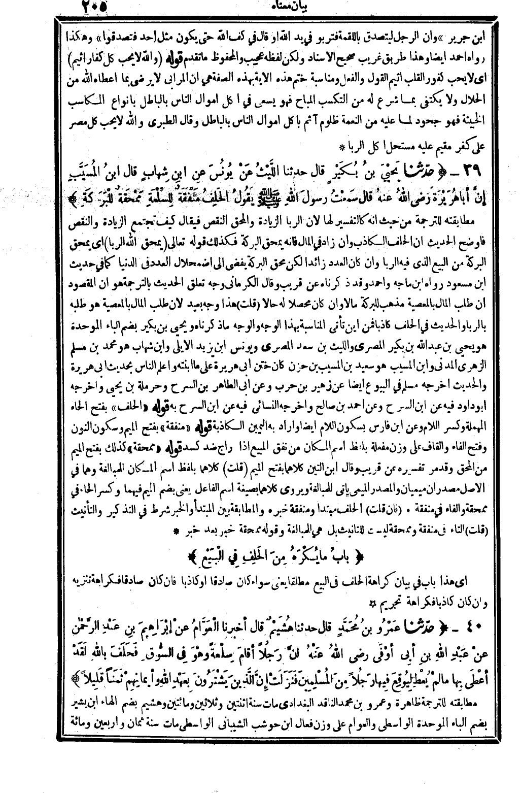 8802 - حدَّثنا عَمْرُو بنُ مُحَمَّدٍ قَالَ حَدثنَا هُشَيْمٌ قَالَ أخبرنَا الْعَوَّامُ عنْ إبْرَاهِيمَ بنِ عَبْدِ الرَّحْمان عنْ عَبْدِ الله بنِ أبِي أوفى رَضِي الله تَعَالَى عنهُ أنَّ رَجُلاً أقامَ سِلْعَةً وَهْوَ فِي السُّوقِ فَحَلَفَ بِاللَّه لَقَدْ أعْطَى بِهَا مَا لَمْ يُعْطَ لِيُوقِعَ فِيها رَجُلاً مِنَ المُسْلِمِينَ فنَزَلَتْ {إنَّ الَّذِينَ يَشْتَرُونَ بِعَهْدِ الله وأيْمَانِهِمْ ثَمَنا قَلِيلاً} (آل عمرَان: 77) .