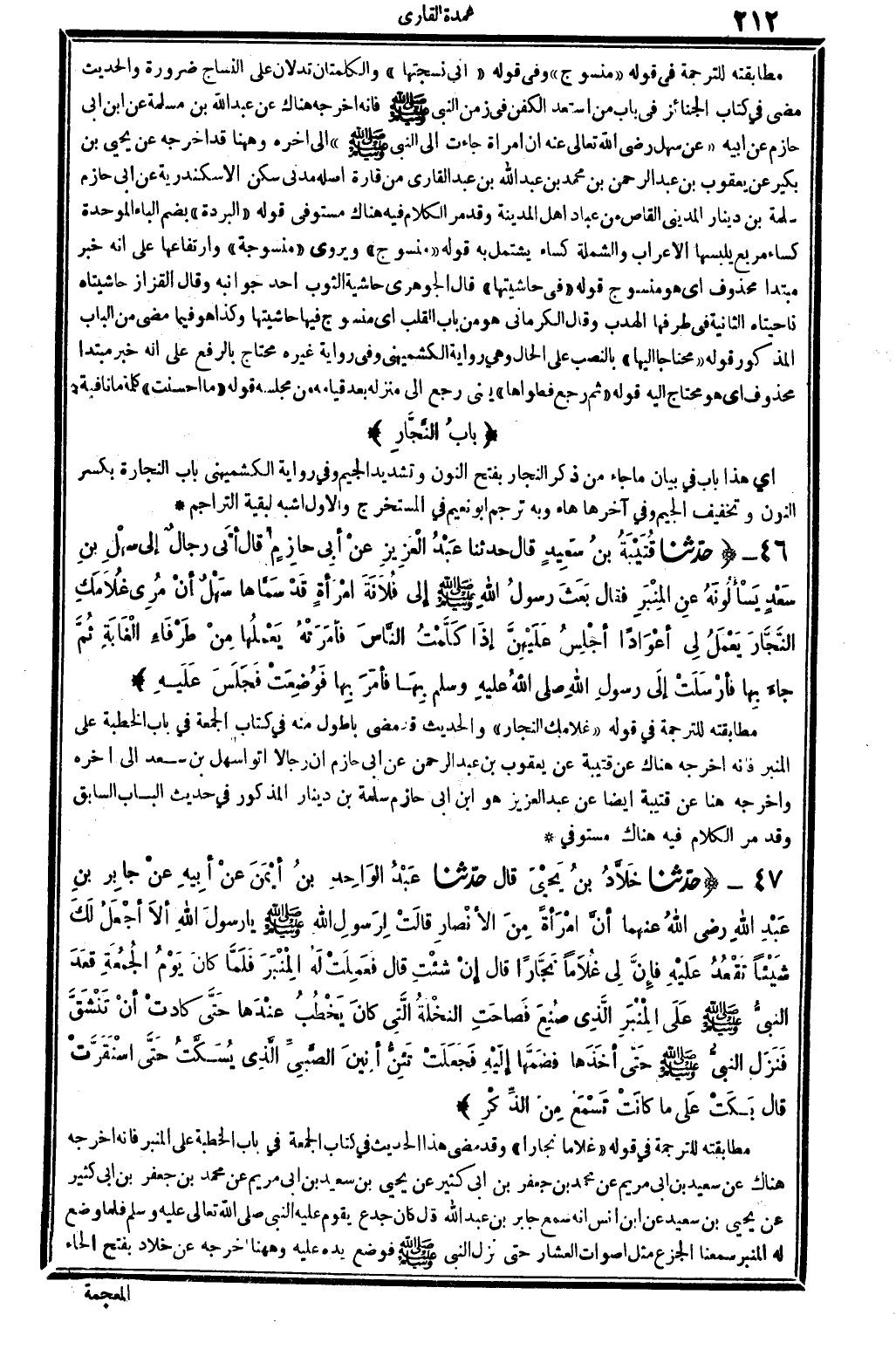 4902 - حدَّثنا قُتَيْبَةُ بنُ سَعِيدٍ قَالَ حدَّثنا عَبْدُ العَزِيزِ عنْ أبِي حازِمٍ قَالَ أتَى رِجالٌ إِلَى سَهْلِ بنِ سَعْدٍ يَسْألُونَهُ عنِ المِنْبَرِ فَقَالَ بَعَثَ رسولُ الله صلى الله عَلَيْهِ وَسلم إِلَى فُلانَةَ امْرَأةٍ قَدْ سَمَهَا سَهْلٌ أنْ مُرِي غُلامَكِ النَّجَّارَ يَعْمَلُ لِي أعْوَادا أجْلِسُ عَلَيْهِنَّ إذَا كَلَّمْتُ النَّاسَ فأمَرَتْهُ يَعْملُهَا مِنْ طَرْفَاءِ الْغَابَةِ ثُمَّ جاءَ بِها فأرْسَلَتْ إلَى رسولِ الله صلى الله عَلَيْهِ وَسلم بِهَا فأمَرَ بِهَا فَوُضِعَتْ فجَلَسَ عَلَيْهِ. .