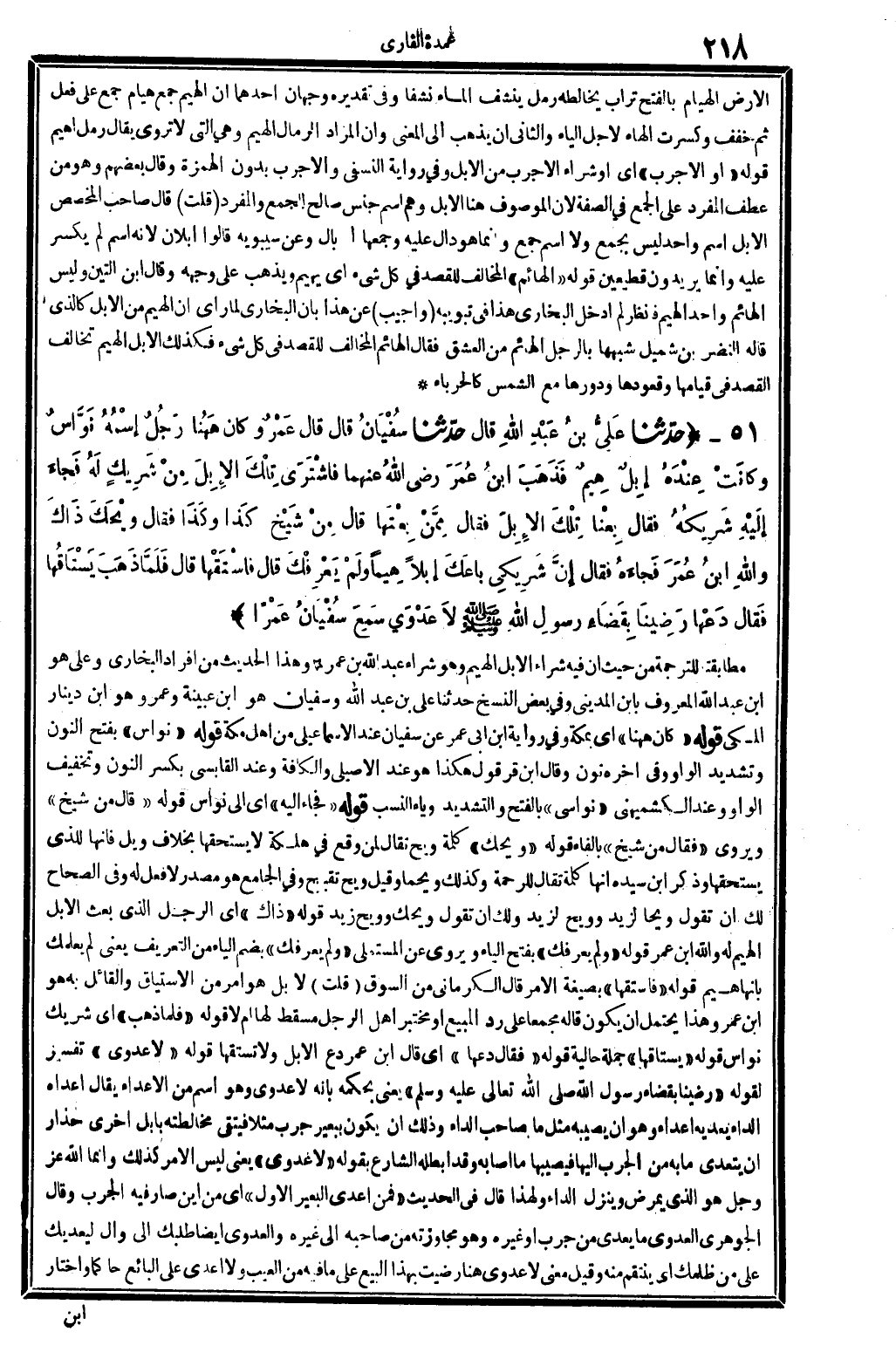 9902 - حدَّثنا عَلِيُّ بنُ عَبْدِ الله قَالَ حدَّثنا سُفْيانُ قَالَ قَالَ عَمْرٌ وَكَانَ هَهُنا رَجُلٌ إسْمُهُ نَوَّاسٌ وكانَتْ عِنْدَهُ إبِلٌ هِيمٌ فَذَهَبَ ابنُ عُمَرَ رَضِي الله تَعَالَى عَنْهُمَا فاشْتَرَى تِلْكَ الإبِلَ مِنُ شَرِيكٍ لَهُ فَجاءَ إلَيْهِ شَرِيكُهُ فَقَالَ بِعْنَا تِلْكَ الإِبِلَ فَقَالَ مِمَّنْ بِعْتَها قَالَ من شَيْخٍ كذَا وكَذا فَقَالَ ويْحَكَ ذَاكَ وَالله ابنُ عُمَرَ فَجَاءَهُ فَقَالَ إنَّ شَرِيكِي باعَكَ إبِلاً هِيما ولَمْ يعْرِفْكَ قَالَ فاسْتَقْها قَالَ فَلَمَّا ذَهَبَ يَسْتَاقُها فَقال دَعْها رَضِينا بِقَضَاءِ رَسولِ الله صلى الله عَلَيْهِ وَسلم لاَ عَدْوَى سَمِعَ سُفْيَانُ عَمْرا. .