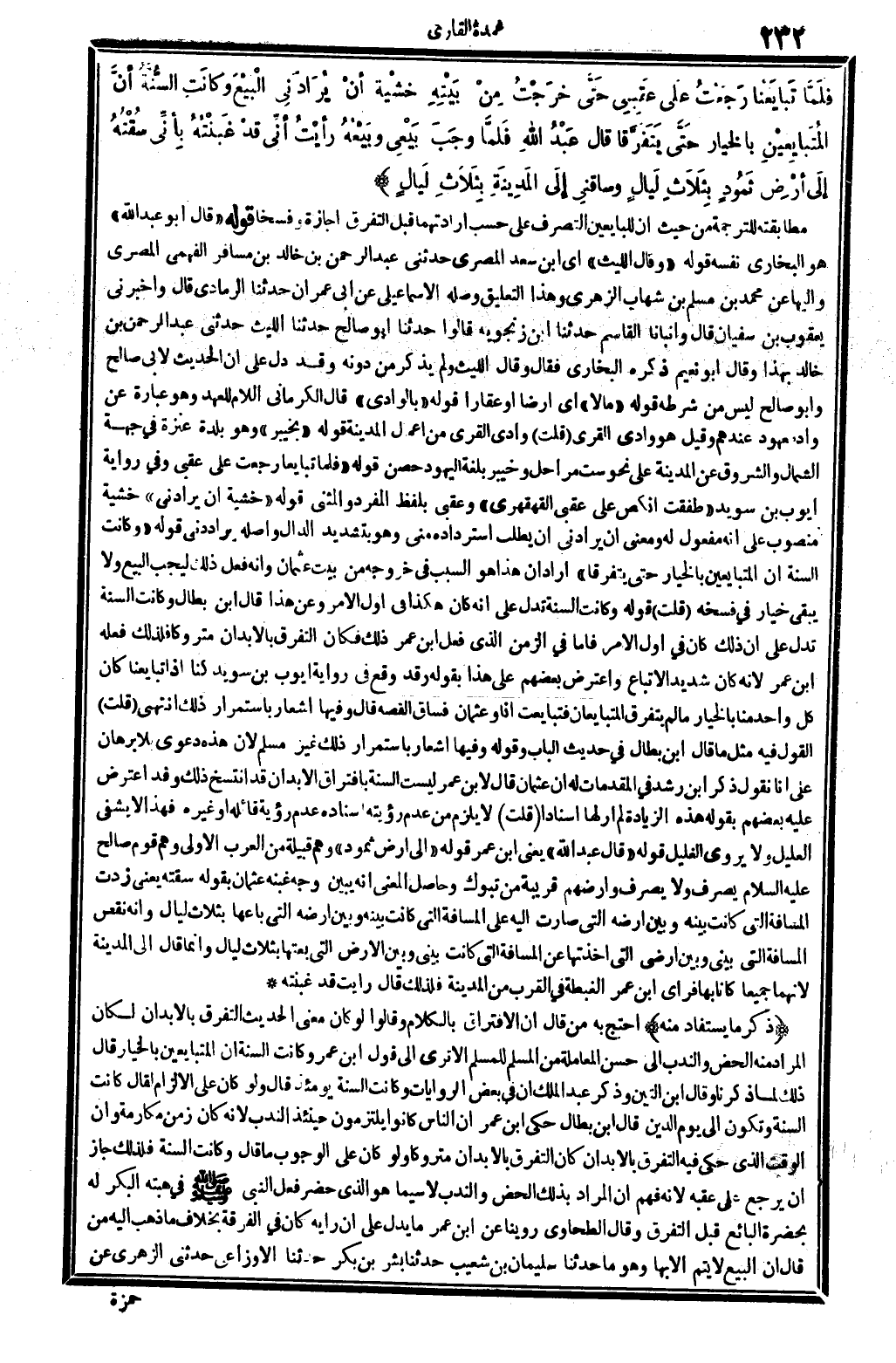 ذكر مَا يُسْتَفَاد مِنْهُ احْتج بِهِ من قَالَ: إِن الِافْتِرَاق بالْكلَام. وَقَالُوا: لَو كَانَ معنى الحَدِيث التَّفَرُّق بالأبدان لَكَانَ المُرَاد مِنْهُ الحض وَالنَّدْب إِلَى حسن الْمُعَامَلَة من الْمُسلم للْمُسلمِ، ألاَ ترى إِلَى قَول ابْن عمر: وَكَانَت السّنة أَن الْمُتَبَايعين بِالْخِيَارِ؟ قَالَ ذَلِك لما ذكرنَا. وَقَالَ ابْن التِّين: وَذكر عبد الْملك أَن فِي بعض الرِّوَايَات: وَكَانَت السّنة يَوْمئِذٍ. قَالَ: وَلَو كَانَ على الْإِلْزَام لقَالَ: كَانَت السّنة، وَتَكون إِلَى يَوْم الدّين. قَالَ ابْن بطال: حكى ابْن عمر أَن النَّاس كَانُوا يلتزمون حِينَئِذٍ النّدب لِأَنَّهُ كَانَ زمن مكارمة، وَأَن الْوَقْت الَّذِي حكى فِيهِ التَّفَرُّق بالأبدان كَانَ التَّفَرُّق بالأبدان متروكا، وَلَو كَانَ على الْوُجُوب مَا قَالَ: وَكَانَت السّنة، فَلذَلِك جَازَ أَن يرجع على عقبه، لِأَنَّهُ فهم أَن المُرَاد بذلك الحض وَالنَّدْب، لَا سِيمَا هُوَ الَّذِي حضر فعل النَّبِي صلى الله عَلَيْهِ وَسلم فِي هِبته الْبكر لَهُ بِحَضْرَة البَائِع قبل التَّفَرُّق. وَقَالَ الطَّحَاوِيّ: روينَا عَن ابْن عمر مَا يدل على أَن رَأْيه كَانَ فِي الْفرْقَة بِخِلَاف مَا ذهب إِلَيْهِ من قَالَ: إِن البيع لَا يتم إلاَّ بهَا، وَهُوَ مَا حَدثنَا سُلَيْمَان بن شُعَيْب حَدثنَا بشر بن بكر حَدثنَا الْأَوْزَاعِيّ حَدثنِي الزُّهْرِيّ عَن