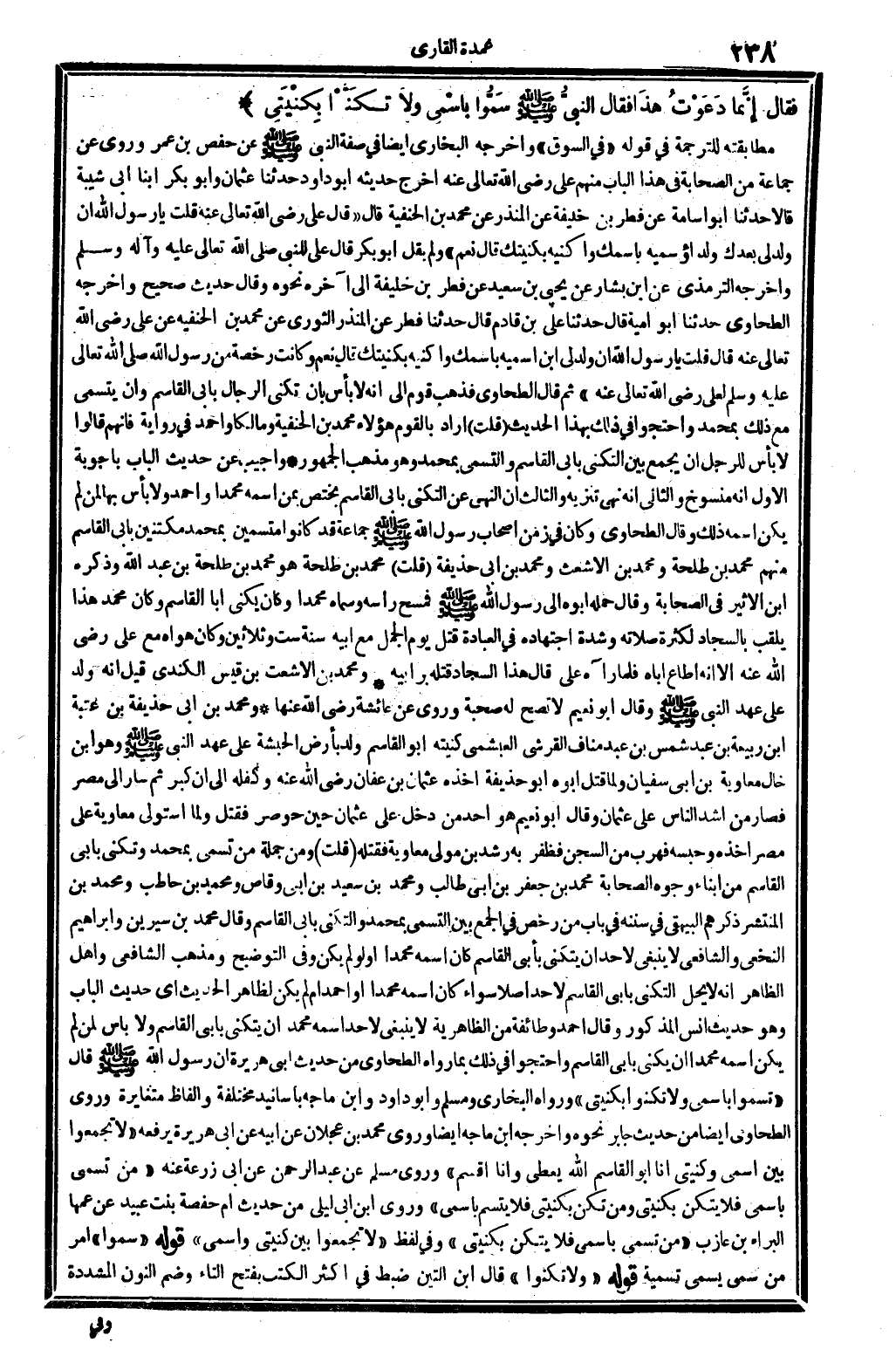 وَقَالَ الطَّحَاوِيّ: وَكَانَ فِي زمن أَصْحَاب رَسُول الله صلى الله عَلَيْهِ وَسلم جمَاعَة قد كَانُوا متسمين بِمُحَمد مكتنين بِأبي الْقَاسِم، مِنْهُم: مُحَمَّد بن طَلْحَة، وَمُحَمّد بن الْأَشْعَث، وَمُحَمّد بن أبي حُذَيْفَة قلت: مُحَمَّد بن طَلْحَة هُوَ مُحَمَّد بن طَلْحَة بن عبد الله، وَذكره ابْن الْأَثِير فِي الصَّحَابَة، وَقَالَ: حمله أَبوهُ إِلَى رَسُول الله صلى الله عَلَيْهِ وَسلم فَمسح رَأسه وَسَماهُ مُحَمَّدًا، وَكَانَ يكنى أَبَا الْقَاسِم، وَكَانَ مُحَمَّد هَذَا يلقب بالسجاد لِكَثْرَة صلَاته وَشدَّة اجْتِهَاده فِي الْعِبَادَة، قتل يَوْم الْجمل مَعَ أَبِيه سنة سِتّ وَثَلَاثِينَ، وَكَانَ هَوَاهُ مَعَ عَليّ، رَضِي الله تَعَالَى عَنهُ، إلاَّ أَنه أطَاع أَبَاهُ، فَلَمَّا رَآهُ عَليّ قَالَ: هَذَا السَّجَّاد قَتله بر أَبِيه. وَمُحَمّد بن الْأَشْعَث بن قيس الْكِنْدِيّ قيل: إِنَّه ولد على عهد النَّبِي صلى الله عَلَيْهِ وَسلم، وَقَالَ أَبُو نعيم: لَا تصح لَهُ صُحْبَة، وروى عَن عَائِشَة، رَضِي الله تَعَالَى عَنْهَا. وَمُحَمّد بن أبي حُذَيْفَة بن عتبَة ابْن ربيعَة بن عبد شمس بن عبد منَاف الْقرشِي العبشمي، كنيته أَبُو الْقَاسِم، ولد بِأَرْض الْحَبَشَة على عهد النَّبِي صلى الله عَلَيْهِ وَسلم وَهُوَ ابْن خَال مُعَاوِيَة بن أبي سُفْيَان، وَلما قتل أَبوهُ أَبُو حُذَيْفَة أَخذه عُثْمَان بن عَفَّان، رَضِي الله تَعَالَى عَنهُ، وكفله إِلَى أَن كبر، ثمَّ سَار إِلَى مصر فَصَارَ من أَشد النَّاس على عُثْمَان، وَقَالَ أَبُو نعيم: هُوَ أحد من دخل على عُثْمَان حِين حوصر فَقتل، وَلما استولى مُعَاوِيَة على مصر أَخذه وحبسه فهرب من السجْن، فظفر بِهِ رشد بن مولى مُعَاوِيَة فَقتله. قلت: وَمن جملَة من تسمى بِمُحَمد وتكنى بِأبي الْقَاسِم من أَبنَاء وُجُوه الصَّحَابَة: مُحَمَّد بن جَعْفَر بن أبي طَالب، وَمُحَمّد بن سعيد بن أبي وَقاص، وَمُحَمّد بن حَاطِب، وَمُحَمّد بن الْمُنْتَشِر ذكرهم الْبَيْهَقِيّ فِي (سنَنه) فِي: بَاب من رخص فِي الْجمع بَين التسمي بِمُحَمد والتكني بِأبي الْقَاسِم. وَقَالَ مُحَمَّد بن سِيرِين وَإِبْرَاهِيم النَّخعِيّ وَالشَّافِعِيّ: لَا يَنْبَغِي لأحد أَن يتكنى بِأبي الْقَاسِم كَانَ اسْمه مُحَمَّدًا أَو لم يكن. وَفِي (التَّوْضِيح) : وَمذهب الشَّافِعِي وَأهل الظَّاهِر أَنه لَا يحل التكني بِأبي الْقَاسِم لأحد أصلا، سَوَاء كَانَ اسْمه مُحَمَّدًا أم لم يكن لظَاهِر الحَدِيث أَي: حَدِيث الْبَاب وَهُوَ حَدِيث أنس الْمَذْكُور. وَقَالَ أَحْمد وَطَائِفَة من الظَّاهِرِيَّة: لَا يَنْبَغِي لأحد اسْمه مُحَمَّد أَن يتكنى بِأبي الْقَاسِم، وَلَا بَأْس لمن لم يكن اسْمه مُحَمَّدًا أَن يكنى بِأبي الْقَاسِم، وَاحْتَجُّوا فِي ذَلِك بِمَا رَوَاهُ الطَّحَاوِيّ من حَدِيث أبي هُرَيْرَة: أَن رَسُول الله صلى الله عَلَيْهِ وَسلم قَالَ: (تسموا باسمي وَلَا تكنوا بكنيتي) ، وَرَوَاهُ البُخَارِيّ وَمُسلم وَأَبُو دَاوُد وَابْن مَاجَه بأسانيد مُخْتَلفَة، وألفاظ مُتَغَايِرَة، وروى الطَّحَاوِيّ أَيْضا من حَدِيث جَابر نَحوه، وَأخرجه ابْن مَاجَه أَيْضا، وروى مُحَمَّد بن عجلَان عَن أَبِيه عَن أبي هُرَيْرَة يرفعهُ: (لَا تجمعُوا بَين اسْمِي وكنيتي، أَنا أَبُو الْقَاسِم الله يُعْطي وَأَنا أقسم) . وروى مُسلم عَن عبد الرَّحْمَن عَن أبي زرْعَة عَنهُ: (من تسمى باسمي فَلَا يتكنَّ بكنيتي، وَمن تكنَّ بكنيتي فَلَا يتسمَّ باسمي) . وروى ابْن أبي ليلى من حَدِيث أم حَفْصَة بنت عبيد عَن عَمها الْبَراء بن عَازِب: (من تسمى باسمي فَلَا يتكنَّ بكنيتي) . وَفِي لفظ: (لَا تجمعُوا بَين كنيتي وإسمي) .