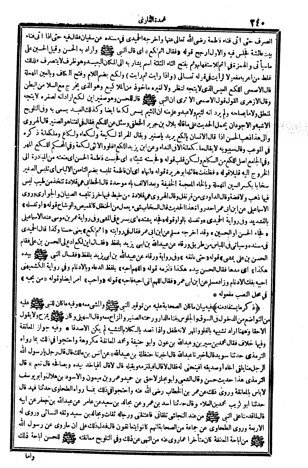 انْصَرف حَتَّى أَتَى فنَاء فَاطِمَة، رَضِي الله تَعَالَى عَنْهَا، وَأخرجه الْحميدِي فِي (مُسْنده) عَن سُفْيَان، فَقَالَ فِيهِ: حَتَّى إِذا أَتَى فنَاء بَيت عَائِشَة فَجَلَسَ فِيهِ. وَالْأول أرجح. قَوْله: (فَقَالَ أَثم لكع؟) أَي: قَالَ النَّبِي صلى الله عَلَيْهِ وَسلم، وَأَرَادَ بِهِ الْحسن، وَقيل: الْحُسَيْن على مَا سَيَأْتِي، والهمزة فِي: إِثْم؟ للاستفهام، و: ثمَّ، بِفَتْح الثَّاء الْمُثَلَّثَة: اسْم يشار بِهِ إِلَى الْمَكَان الْبعيد وَهُوَ ظرف لَا يتَصَرَّف، فَلذَلِك غلط من أعربه مَفْعُولا لرأيت فِي قَوْله تَعَالَى: {وَإِذا رَأَيْت ثمَّ رَأَيْت} (الْإِنْسَان: 02) . ولكع، بِضَم اللاَّم وَفتح الْكَاف وبالعين الْمُهْملَة. قَالَ الْأَصْمَعِي: الكلع العيس الَّذِي لَا يتَّجه لنظر وَلَا لغيره، مَأْخُوذ من الملاكيع، وَهُوَ الَّذِي يخرج مَعَ السلا من الْبَطن. وَقَالَ الْأَزْهَرِي: القَوْل قَول الْأَصْمَعِي، أَلا ترى أَن النَّبِي صلى الله عَلَيْهِ وَسلم قَالَ لِلْحسنِ وَهُوَ صَغِير: أَيْن لكع؟ أَرَادَ أَنه لصغره لَا يتَّجه لمنطق وَلَا مَا يصلحه، وَلم يرد أَنه لئيم وَلَا عبد، وَعلم مِنْهُ أَن اللَّئِيم يُسمى لكعا أَيْضا، وَكَذَلِكَ العَبْد يُسمى بِهِ. وَفِي (التَّلْوِيح) الْأَشْبَه والأجود أَن يحمل الحَدِيث على مَا قَالَه بِلَال بن جرير الخطفي، وَسُئِلَ عَن اللكع؟ فَقَالَ: فِي لغتنا هُوَ الصَّغِير. قَالَ الْهَرَوِيّ: وَإِلَى هَذَا ذهب الْحسن، إِذا قَالَ الْإِنْسَان: لَا يكع، يُرِيد: يَا صَغِير وَيُقَال للْمَرْأَة: لكيعة ولكعاء ولكاع وملكعانة، ذكره فِي (الموعب) . وَقَالَ سِيبَوَيْهٍ: لَا يُقَال ملكعانة إلاَّ فِي النداء، وَعَن ابْن يزِيد، اللكع الغلو، وَالْأُنْثَى لكعة. وَفِي (الْمُحكم) : اللكع الْمهْر. وَفِي (الْجَامِع) : أصل اللكع من اللكع وَلَكِن قلب. قَوْله: (فحسبته شَيْئا) أَي: فحبست فَاطِمَة الْحسن، أَي: منعته من الْمُبَادرَة إِلَى الْخُرُوج إِلَيْهِ قَلِيلا. قَوْله: (فَظَنَنْت) ، قَائِله أَبُو هُرَيْرَة. (أَنَّهَا) ، أَي: أَن فَاطِمَة (تلبسه) بِضَم التَّاء من الإلباس أَي: تلبس الصَّغِير (سخابا) ، بِكَسْر السِّين الْمُهْملَة وبالخاء الْمُعْجَمَة الْخَفِيفَة وَبعد الْألف بَاء مُوَحدَة، قَالَ الْخطابِيّ: هِيَ قلادة تتَّخذ من طيب لَيْسَ فِيهَا ذهب وَلَا فضَّة. وَقَالَ الدَّاودِيّ: من قرنفل. وَقَالَ الْهَرَوِيّ: هِيَ قلادة من خيط فِيهَا خرز تلبسه الصّبيان والجواري، وروى الْإِسْمَاعِيلِيّ عَن ابْن أبي عمر أحد رُوَاة هَذَا الحَدِيث قَالَ: السخاب شَيْء يعْمل من الحنظل كالقميص والوشاح. قَوْله: (أَو تغسله) بِالتَّشْدِيدِ، وَفِي رِوَايَة الْحميدِي: (وتغسله) بِالْوَاو. قَوْله: (فجَاء يشْتَد) أَي: يسْرع فِي الْمَشْي، وَفِي رِوَايَة عمر بن مُوسَى عِنْد الْإِسْمَاعِيلِيّ: (فجَاء الْحسن أَو الْحُسَيْن) ، وَقد أخرجه مُسلم عَن ابْن أبي عمر، فَقَالَ فِي رِوَايَته: (أثَمَّ لُكَّعْ؟) يَعْنِي: حسنا، وَكَذَا قَالَ الْحميدِي فِي (مُسْنده) ، وَسَيَأْتِي فِي اللبَاس من طَرِيق وَرْقَاء عَن عبيد الله بن أبي يزِيد بِلَفْظ: (فَقَالَ: أَيْن لكع؟ أدع لي الْحسن بن عَليّ، فَقَامَ الْحسن بن عَليّ يمشي) . قَوْله: (حَتَّى عانقه) ، وَفِي رِوَايَة وَرْقَاء عَن عبيد الله بن أبي يزِيد بِلَفْظ: (فَقَالَ النَّبِي صلى الله عَلَيْهِ وَسلم بِيَدِهِ هَكَذَا) ، أَي: مدها. فَقَالَ الْحسن بِيَدِهِ هَكَذَا، فَالْتَزمهُ قَوْله: (أللهم أحبه) ، بِلَفْظ الدُّعَاء وبالإدغام، وَفِي رِوَايَة الْكشميهني: أحببه، بفك الْإِدْغَام، وَزَاد مُسلم عَن ابْن أبي عمر: (فَقَالَ: أللهم إِنِّي أحبه فَأَحبهُ) . قَوْله: (وَأحب) أَمر أَيْضا. وَقَوله: (من يُحِبهُ) ، فِي مَحل النصب مَفْعُوله.
