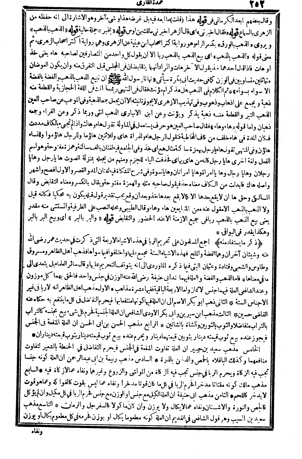ذكر مَا يُسْتَفَاد مِنْهُ: أجمع الْمُسلمُونَ على تَحْرِيم الرِّبَا فِي هَذِه الْأَشْيَاء الْأَرْبَعَة الَّتِي ذكرت فِي حَدِيث عمر، رَضِي الله تَعَالَى عَنهُ، وشيئان آخرَانِ وهما: الْفضة وَالْملح، فَهَذِهِ الْأَشْيَاء السِّتَّة مجمع عَلَيْهَا، وَاخْتلفُوا فِيمَا سواهَا، فَذهب أهل الظَّاهِر ومسروق وطاووس وَالشعْبِيّ وَقَتَادَة وَعُثْمَان البتي فِيمَا ذكره الْمَاوَرْدِيّ: إِلَى أَنه يتَوَقَّف التَّحْرِيم عَلَيْهَا. وَقَالَ سَائِر الْعلمَاء: بل يتَعَدَّى إِلَى مَا فِي مَعْنَاهَا. فَأَما الذَّهَب وَالْفِضَّة، وَالْعلَّة فيهمَا عِنْد أبي حنيفَة، رَضِي الله تَعَالَى عَنهُ، الْوَزْن فِي جنس وَاحِد، فَالْحق بهما كل مَوْزُون. وَعند الشَّافِعِي: الْعلَّة فيهمَا جنس الْأَثْمَان وَأما الْأَرْبَعَة الْبَاقِيَة فَفِيهَا عشرَة مَذَاهِب. الأول: مَذْهَب أهل الظَّاهِر أَنه: لَا رَبًّا فِي غير الْأَجْنَاس السِّتَّة. الثَّانِي: ذهب أَبُو بكر الْأَصَم: إِلَى أَن الْعلَّة فِيهَا كَونهَا مُنْتَفعا بهَا، فَيحرم التَّفَاضُل فِي كل مَا ينْتَفع بِهِ، حَكَاهُ عَنهُ القَاضِي حُسَيْن. الثَّالِث: مَذْهَب ابْن سِيرِين وَأبي بكر الأودي الشَّافِعِي: أَن الْعلَّة الجنسية، فَحرم كل شَيْء بيع بِجِنْسِهِ: كالتراب بِالتُّرَابِ مُتَفَاضلا، وَالثَّوْب بالثوبين وَالشَّاة بالشاتين. الرَّابِع: مَذْهَب الْحسن بن أبي الْحسن: أَن الْعلَّة الْمَنْفَعَة فِي الْجِنْس، فَيجوز عِنْده بيع ثوب قِيمَته دِينَار بثوبين قيمتهمَا دِينَار، وَيحرم عِنْده بيع ثوب قِيمَته دِينَار بِثَوْب قِيمَته دِينَارَانِ. الْخَامِس: مَذْهَب سعيد بن جُبَير: أَن الْعلَّة تفَاوت الْمَنْفَعَة فِي الْجِنْس، فَيحرم التَّفَاضُل فِي الْحِنْطَة بِالشَّعِيرِ لتَفَاوت منافعهما، وَكَذَلِكَ الباقلاء بالحمص والدخن بالذرة. السَّادِس: مَذْهَب ربيعَة بن أبي عبد الرَّحْمَن: أَن الْعلَّة كَونه جِنْسا تجب فِيهِ الزَّكَاة، وَيحرم الرِّبَا فِي جنس تجب فِيهِ الزَّكَاة من الْمَوَاشِي والزروع وَغَيرهمَا، ونفاه عَمَّا لَا زَكَاة فِيهِ. السَّابِع: مَذْهَب مَالك: كَونه مقتاتا مدخرا، فَحرم الرِّبَا فِي كل مَا كَانَ قوتا مدخرا، ونفاه عَمَّا لَيْسَ بقوت: كالفواكه، وَعَما هُوَ قوت لَا يدّخر: كَاللَّحْمِ. الثَّامِن: مَذْهَب أبي حنيفَة: أَن الْعلَّة الْكَيْل مَعَ جنس، أَو الْوَزْن مَعَ جنس، فَحرم الرِّبَا فِي كل مَكِيل وَإِن لم يُؤْكَل: كالجص والنورة والأشنان، ونفاه عَمَّا لَا يُكَال وَلَا يُوزن وَإِن كَانَ مَأْكُولا: كالسفرجل وَالرُّمَّان. التَّاسِع: مَذْهَب سعيد بن الْمسيب، وَهُوَ قَول الشَّافِعِي فِي الْقَدِيم: أَن الْعلَّة كَونه مطعوما يُكَال أَو يُوزن فحرمه فِي كل مطعوم يُكَال أَو يُوزن،