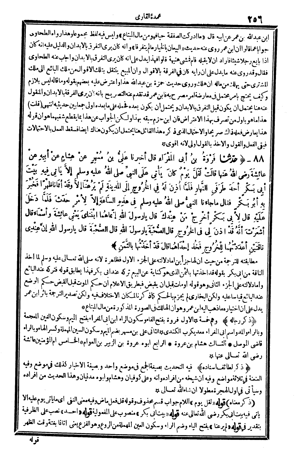 ابْن عبد الله بن عمر عَن أَبِيه، قَالَ: (مَا أدْركْت الصَّفْقَة حَيا فَهُوَ من مَال الْمُبْتَاع) وَلَيْسَ فِيهِ لفظ: مجموعا، وَهَذَا رَوَاهُ الطَّحَاوِيّ جَوَابا عَمَّا قَالُوا: إِن ابْن عمر روى عَنهُ حَدِيث: (البيعان بِالْخِيَارِ مَا لم يَتَفَرَّقَا) ، وَأَنه كَانَ يرى التَّفَرُّق بالأبدان، وَالدَّلِيل عَلَيْهِ أَنه كَانَ إِذا بَايع رجلا شَيْئا فَأَرَادَ أَن لَا يقبله قَامَ فَمشى هنيهة، قَالُوا: فَهَذَا يدل على أَنه كَانَ يرى التَّفَرُّق بالأبدان، وَأجَاب عَنهُ الطَّحَاوِيّ فَقَالَ: وَقد رُوِيَ عَنهُ مَا يدل على أَن رَأْيه كَانَ فِي الْفرْقَة بالأقوال، وَأَن الْمَبِيع ينْتَقل بِتِلْكَ الْأَقْوَال من ملك البَائِع إِلَى ملك المُشْتَرِي حَتَّى يهْلك من مَالك إِن هلك، وروى حَدِيث حَمْزَة بن عبد الله هَذَا، وَاعْترض عَلَيْهِ بَعضهم بقوله: وَمَا قَالَه لَيْسَ بِلَازِم، وَكَيف يحْتَج بِأَمْر مُحْتَمل فِي مُعَارضَة أَمر مُصَرح بِهِ؟ فَابْن عمر قد تقدم عَنهُ التَّصْرِيح بِأَنَّهُ كَانَ يرى الْفرْقَة بالأبدان، وَالْمَنْقُول عَنهُ هُنَا يحْتَمل أَن يكون قبل التَّفَرُّق بالأبدان، وَيحْتَمل أَن يكون بعده، فَحَمله على مَا بعده أولى جمعا بَين حديثيه. انْتهى. قلت: هَذَا مَا هُوَ بِأول من تصرف بِهَذَا الِاعْتِرَاض، فَإِن ابْن حزم سبقه بِهَذَا، وَلَكِن الْجَواب عَن هَذَا بِمَا يقطع شغبهما هُوَ: أَن قَوْله هَذَا يُعَارض فعله ذَاك صَرِيحًا، وَالِاحْتِمَال الَّذِي ذكره هَذَا الْقَائِل هُنَا يحْتَمل أَن يكون هُنَاكَ أَيْضا، فَسقط الْعَمَل بالاحتمالات فَبَقيَ الْفِعْل وَالْقَوْل، وَالْأَخْذ بالْقَوْل أولى لِأَنَّهُ أقوى.
