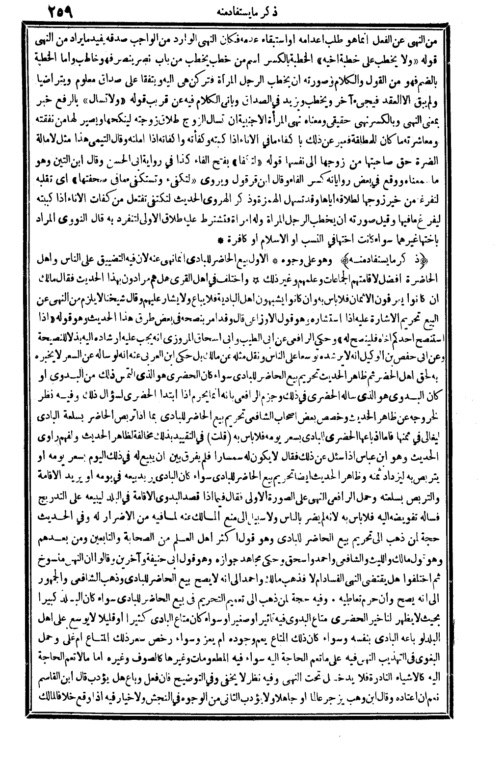 الأول: بيع الْحَاضِر للبادي إِنَّمَا نهى عَنهُ لِأَن فِيهِ التَّضْيِيق على النَّاس، وَأهل الْحَاضِرَة أفضل لإقامتهم الْجَمَاعَات وعلمهم وَغير ذَلِك. وَاخْتلف فِي أهل الْقرى: هَل هم مرادون بِهَذَا الحَدِيث؟ فَقَالَ مَالك: إِن كَانُوا يعْرفُونَ الْأَثْمَان فَلَا بَأْس بِهِ، وَإِن كَانُوا يشبهون أهل الْبَادِيَة فَلَا يُبَاع وَلَا يشار عَلَيْهِم، وَقَالَ شَيخنَا: لَا يلْزم من النَّهْي عَن البيع تَحْرِيم الْإِشَارَة عَلَيْهِ إِذا استشاره، وَهُوَ قَول الْأَوْزَاعِيّ، قَالَ: وَقد أَمر بنصحه فِي بعض طرق هَذَا الحَدِيث: وَهُوَ قَوْله: (إِذا استنصح أحدكُم أَخَاهُ فلينصح لَهُ) ، وَحكى الرَّافِعِيّ عَن أبي الطّيب وَأبي إِسْحَاق الْمروزِي: أَنه يجب عَلَيْهِ إرشاده إِلَيْهِ بذلاً للنصيحة. وَعَن أبي حَفْص بن الْوَكِيل: أَنه لَا يرشده توسعا على النَّاس، وَنقل مثله عَن مَالك، بل حكى ابْن الْعَرَبِيّ عَنهُ أَنه: لَو سَأَلَهُ عَن السّعر لَا يُخبرهُ بِهِ لحق أهل الْحَضَر، ثمَّ ظَاهر الحَدِيث تَحْرِيم بيع الْحَاضِر للبادي، سَوَاء كَانَ الحضري هُوَ الَّذِي التمس ذَلِك من البدوي أَو كَانَ البدوي هُوَ الَّذِي سَأَلَهُ الحضري فِي ذَلِك، وَجزم الرَّافِعِيّ: بِأَنَّهُ إِنَّمَا يحرم إِذا ابْتَدَأَ الحضري لسؤال ذَلِك، وَفِيه نظر لِخُرُوجِهِ عَن ظَاهر الحَدِيث، وخصص بعض أَصْحَاب الشَّافِعِي تَحْرِيم بيع الْحَاضِر للبادي بِمَا إِذا تربص الْحَاضِر بسلعة البادي ليغالي فِي ثمنهَا، فَأَما إِذا بَاعهَا الحضري للبادي بِسعْر يَوْمه فَلَا بَأْس بِهِ. قلت: فِي التَّقْيِيد بذلك مُخَالفَة لظَاهِر الحَدِيث ولفهم رَاوِي الحَدِيث وَهُوَ ابْن عَبَّاس إِذا سُئِلَ عَن ذَلِك، فَقَالَ: لَا يكون لَهُ سمسارا، فَلم يفرق بَين أَن يَبِيع لَهُ فِي ذَلِك الْيَوْم بِسعْر يَوْمه أَو يتربص بِهِ لِيَزْدَادَ ثمنه، وَظَاهر الحَدِيث أَيْضا تَحْرِيم بيع الْحَاضِر للبادي سَوَاء كَانَ البادي يُرِيد بَيْعه فِي يَوْمه أَو يُرِيد الْإِقَامَة والتربص بسلعته، وَحمل الرَّافِعِيّ النَّهْي على الصُّورَة الأولى فَقَالَ: فِيمَا إِذا قصد البدوي الْإِقَامَة فِي الْبَلَد ليَبِيعهُ على التدريج، فَسَأَلَهُ تفويضه إِلَيْهِ فَلَا بَأْس بِهِ، لِأَنَّهُ لم يضر بِالنَّاسِ وَلَا سَبِيل إِلَى منع الْمَالِك عَنهُ، لما فِيهِ من الْإِضْرَار لَهُ. وَفِي الحَدِيث حجَّة لمن ذهب إِلَى تَحْرِيم بيع الْحَاضِر للبادي، وَهُوَ قَول أَكثر أهل الْعلم من الصَّحَابَة وَالتَّابِعِينَ، وَمن بعدهمْ، وَهُوَ قَول مَالك وَاللَّيْث وَالشَّافِعِيّ وَأحمد وَإِسْحَاق. وَحكى مُجَاهِد جَوَازه، وَهُوَ قَول أبي حنيفَة وَآخَرين، وَقَالُوا: إِن النَّهْي مَنْسُوخ، ثمَّ اخْتلفُوا: هَل يَقْتَضِي النَّهْي الْفساد أم لَا؟ فَذهب مَالك وَأحمد إِلَى أَنه لَا يَصح بيع الْحَاضِر للبادي، وَذهب الشَّافِعِي وَالْجُمْهُور إِلَى أَنه يَصح وَإِن حرم تعاطيه. وَفِيه: حجَّة لمن ذهب إِلَى تَعْمِيم التَّحْرِيم فِي بيع الْحَاضِر للبادي، سَوَاء كَانَ الْبَلَد كَبِيرا بِحَيْثُ لَا يظْهر لنا خير الحضري مَتَاع البدوي فِيهِ تَأْثِير أَو صَغِير، أَو سَوَاء كَانَ مَتَاع البادي كثيرا أَو قَلِيلا لَا يُوسع على أهل الْبَلَد لَو بَاعه البادي بِنَفسِهِ، وَسَوَاء كَانَ ذَلِك الْمَتَاع يعم وجوده أم يعز، وَسَوَاء رخص سعر ذَلِك الْمَتَاع أم غلى، وَحمل الْبَغَوِيّ فِي (التَّهْذِيب) النَّهْي فِيهِ على مَا تعم الْحَاجة إِلَيْهِ، سَوَاء فِيهِ المطعومات وَغَيرهَا كالصوف وَغَيره، أما مَا لَا تعم الْحَاجة إِلَيْهِ كالأشياء النادرة فَلَا يدْخل تَحت النَّهْي، وَفِيه نظر لَا يخفى، وَفِي (التَّوْضِيح) فَإِن فعل وَبَاعَ هَل يُؤَدب؟ قَالَ ابْن الْقَاسِم: نعم إعتاده، وَقَالَ ابْن وهب: يزْجر عَالما أَو جَاهِلا وَلَا يُؤَدب.