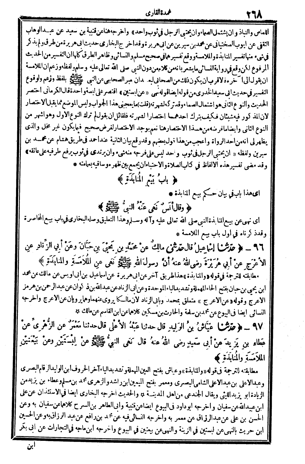 اللماس والنباذ، وَأَن يشْتَمل الصماء، وَأَن يحتبي الرجل فِي ثوب وَاحِد) . وَأخرجه هُنَا: عَن قُتَيْبَة بن سعيد عَن عبد الْوَهَّاب الثَّقَفِيّ عَن أَيُّوب السّخْتِيَانِيّ عَن مُحَمَّد بن سِيرِين عَن أبي هُرَيْرَة. وَقد أخرج البُخَارِيّ حَدِيث أبي هُرَيْرَة من طرق، وَلم يذكر فِي شَيْء مِنْهَا تَفْسِير الْمُنَابذَة وَالْمُلَامَسَة. وَوَقع فِي تفسيرهما فِي (صَحِيح مُسلم) وَالنَّسَائِيّ، وَظَاهر الطّرق كلهَا أَن التَّفْسِير من الحَدِيث الْمَرْفُوع، لَكِن وَقع فِي رِوَايَة النَّسَائِيّ مَا يشْعر بِأَنَّهُ من كَلَام من دون النَّبِي، صلى الله عَلَيْهِ وَسلم، وَلَفظه: وَزعم أَن الْمُلَامسَة أَن يَقُول ... إِلَى آخِره فَالْأَقْرَب أَن يكون ذَلِك من الصَّحَابِيّ لبعد أَن يعبر الصَّحَابِيّ عَن النَّبِي صلى الله عَلَيْهِ وَسلم بِلَفْظ وَزعم، ولوقوع التَّفْسِير فِي حَدِيث أبي سعيد الْخُدْرِيّ من قَوْله أَيْضا: (نهى عَن لبستين) اقْتصر على لبسة وَاحِدَة، قَالَ الْكرْمَانِي: اختصر الحَدِيث. وَالنَّوْع الثَّانِي هُوَ اشْتِمَال الصماء، وَقد تَركه لشهرته. قلت: مَا يُعجبنِي هَذَا الْجَواب، وَلَيْسَ الْموضع مِمَّا يقبل الِاخْتِصَار، لِأَن الْمَذْكُور فِيهِ شَيْئَانِ، فَكيف يتْرك أَحدهمَا اختصارا لشهرته؟ فلقائل أَن يَقُول: لِمَ ترك النَّوْع الأول وَهُوَ أشهر من النَّوْع الثَّانِي؟ وَأَيْضًا مَا غَرَضه من هَذَا الِاخْتِصَار هُنَا؟ نعم، يُوجد الِاخْتِصَار لغَرَض صَحِيح فِيمَا يكون غير مخل، وَالَّذِي يظْهر لي أَنه من أحد الروَاة، وأعجب من هَذَا قَول بَعضهم، وَقد وَقع بَيَان الثَّانِيَة عِنْد أَحْمد فِي طَرِيق هِشَام عَن مُحَمَّد بن سِيرِين، وَلَفظه: (أَن يحتبي الرجل فِي ثوب وَاحِد لَيْسَ على فرجه مِنْهُ شَيْء، وَأَن يرتدي فِي ثوب يرفع طَرفَيْهِ على عَاتِقه) . وَقد مضى تَفْسِير هَذِه الْأَلْفَاظ فِي كتاب الصَّلَاة، والاحتباء أَن يجمع بَين ظَهره وساقيه بعمامته.