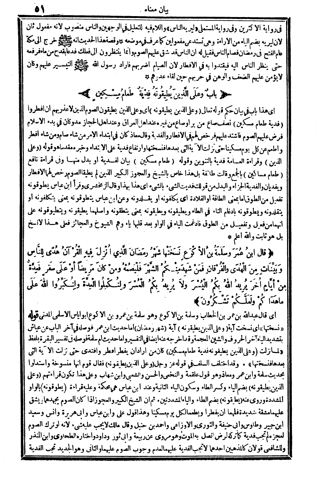 أَي: هَذَا بَاب فِي بَيَان حكم قَوْله تَعَالَى: {وعَلى الَّذين يطيقُونَهُ} (الْبَقَرَة: 481) . أَي: وعَلى الَّذين يُطِيقُونَ الصَّوْم الَّذين لَا عذر بهم إِن أفطروا: {فديَة طَعَام مِسْكين} (الْبَقَرَة: 481) . نصف صَاع من بر، أَو صَاع من غَيره عِنْد أهل الْعرَاق، وَعند أهل الْحجاز مد، وَكَانَ فِي بَدْء الْإِسْلَام فرض عَلَيْهِم الصَّوْم، فَاشْتَدَّ عَلَيْهِم فَرخص لَهُم فِي الْإِفْطَار والفدية. وَقَالَ معَاذ: كَانَ فِي ابْتِدَاء الْأَمر: من شَاءَ صَامَ وَمن شَاءَ أفطر وَأطْعم عَن كل يَوْم مِسْكينا حَتَّى نزلت الْآيَة الَّتِي بعْدهَا، فنسختها وارتفاع فديَة، على الِابْتِدَاء وَخَبره مقدما هُوَ قَوْله {وعَلى الَّذين} وَقِرَاءَة عَامَّة فديَة بِالتَّنْوِينِ وَقَوله: {طَعَام مِسْكين} (الْبَقَرَة: 581) . بَيَان: لفدية، أَو: بدل مِنْهَا، وَفِي قِرَاءَة نَافِع: {طَعَام مَسَاكِين} بِالْجمعِ، وَقَالَت طَائِفَة: بل هَذَا خَاص بالشيخ والعجوز الْكَبِير الَّذين لم يطيقا الصَّوْم رخص لَهما الْإِفْطَار ويفديان، والفدية الْجَزَاء، وَالْبدل من قَوْلك: فديت الشَّيْء بالشَّيْء أَي: هَذَا بِهَذَا. وَقَالَ الزَّمَخْشَرِيّ: وَقَرَأَ ابْن عَبَّاس: يطوقونه، تفعيل من الطوق، إِمَّا بِمَعْنى الطَّاقَة أَو القلادة، أَي: يكلفونه أَو يقلدونه، وَعَن ابْن عَبَّاس: يتطوقونه بِمَعْنى: يتكلفونه، أَو يتقلدونه ويطوقونه بإدغام التَّاء فِي الطَّاء، ويطيقونه ويطيقونه بِمَعْنى يتطقونه، وأصلهما: يطيقُونَهُ ويتطيوقونه، على أَنَّهُمَا من فعيل، وتفعيل من الطوق، فأدغمت الْيَاء فِي الْوَاو بعد قَلبهَا يَاء، وهم الشُّيُوخ والعجائز، فعلى هَذَا لَا نسخ بل هُوَ ثَابت، وَالله أعلم.