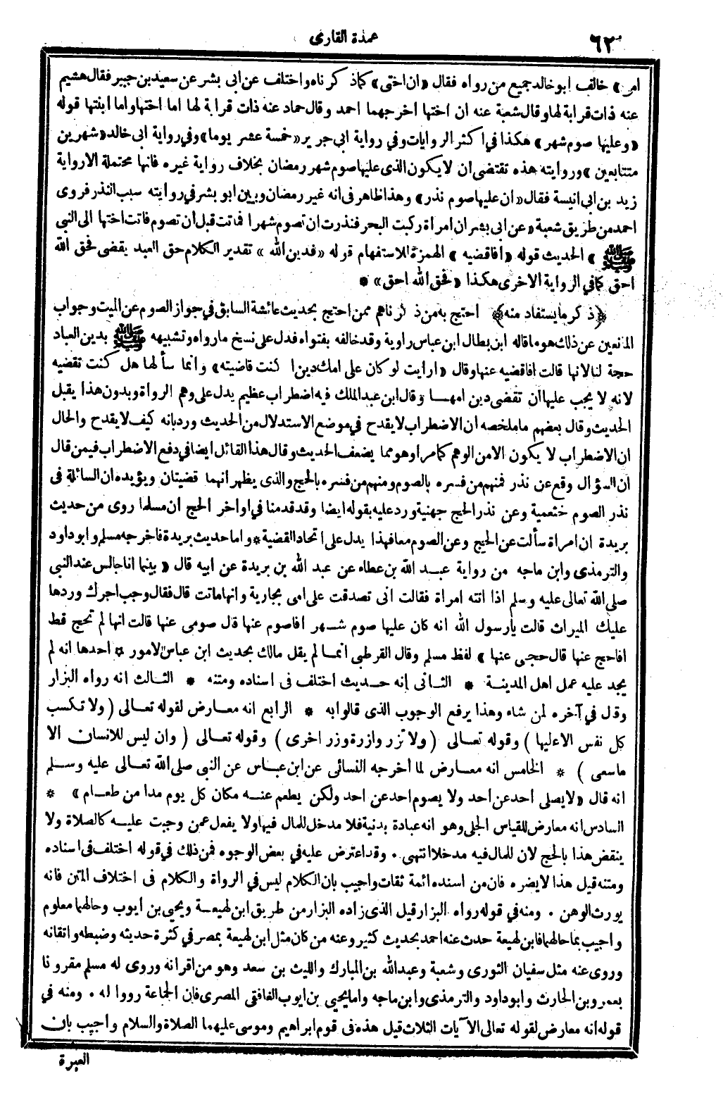 وَقَالَ الْقُرْطُبِيّ: إِنَّمَا لم يقل مَالك بِحَدِيث ابْن عَبَّاس لأمور: أَحدهَا: أَنه لم يجد عَلَيْهِ عمل أهل الْمَدِينَة. الثَّانِي: أَنه حَدِيث اخْتلف فِي إِسْنَاده وَمَتنه. الثَّالِث: أَنه رَوَاهُ الْبَزَّار وَقَالَ فِي آخِره: لمن شَاءَ، وَهَذَا يرفع الْوُجُوب الَّذِي قَالُوا بِهِ. الرَّابِع: أَنه معَارض لقَوْله تَعَالَى {وَلَا تكسب كل نفس إِلَّا عَلَيْهَا} (الْأَنْعَام: 461) . وَقَوله تَعَالَى: {وَلَا تزر وَازِرَة وزر أُخْرَى} (الْأَنْعَام، 461، الْإِسْرَاء: 51، فاطر: 81، وَالزمر: 7) . وَقَوله تَعَالَى: {وَإِن لَيْسَ للْإنْسَان إِلَّا مَا سعى} (النَّجْم: 93) . الْخَامِس: أَنه معَارض لما أخرجه النَّسَائِيّ عَن ابْن عَبَّاس عَن النَّبِي، صلى الله عَلَيْهِ وَسلم، أَنه قَالَ: (لَا يُصَلِّي أحد عَن أحدٍ وَلَا يَصُوم أحدٌ عَن أحدٍ، وَلَكِن يطعم عَنهُ مَكَان كل يَوْم مدا من طَعَام) . السَّادِس: أَنه معَارض للْقِيَاس الْجَلِيّ، وَهُوَ أَنه عبَادَة بدنية، فَلَا مدْخل لِلْمَالِ فِيهَا، وَلَا يفعل عَمَّن وَجب عَلَيْهِ كَالصَّلَاةِ، وَلَا ينْقض هَذَا بِالْحَجِّ، لِأَن لِلْمَالِ فِيهِ مدخلًا انْتهى.