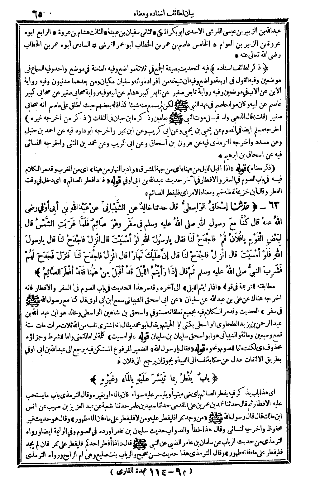 ذكر لطائف إِسْنَاده فِيهِ: التحديث بِصِيغَة الْجمع فِي ثَلَاثَة مَوَاضِع. وَفِيه: العنعنة فِي مَوضِع وَاحِد. وَفِيه: السماع فِي موضِعين. وَفِيه: القَوْل فِي أَرْبَعَة مَوَاضِع. وَفِيه: أَن شَيْخه من أَفْرَاده وَأَنه وسُفْيَان مكيان وَمن بعدهمَا مدنيون. وَفِيه: رِوَايَة الابْن عَن الْأَب فِي موضِعين. وَفِيه: رِوَايَة تَابِعِيّ صَغِير عَن تَابِعِيّ كَبِير هِشَام عَن أَبِيه. وَفِيه: رِوَايَة صَحَابِيّ صَغِير عَن صَحَابِيّ كَبِير عَاصِم عَن أَبِيه، وَكَانَ مولد عَاصِم فِي عهد النَّبِي صلى الله عَلَيْهِ وَسلم لَكِن لم يسمع مِنْهُ شَيْئا، كَذَا قَالَه بَعضهم حَيْثُ أطلق على عَاصِم أَنه صَحَابِيّ صَغِير قلت: قَالَ الذَّهَبِيّ: ولد قبل موت النَّبِي صلى الله عَلَيْهِ وَسلم بعامين، وَذكره ابْن حبَان فِي الثِّقَات.
