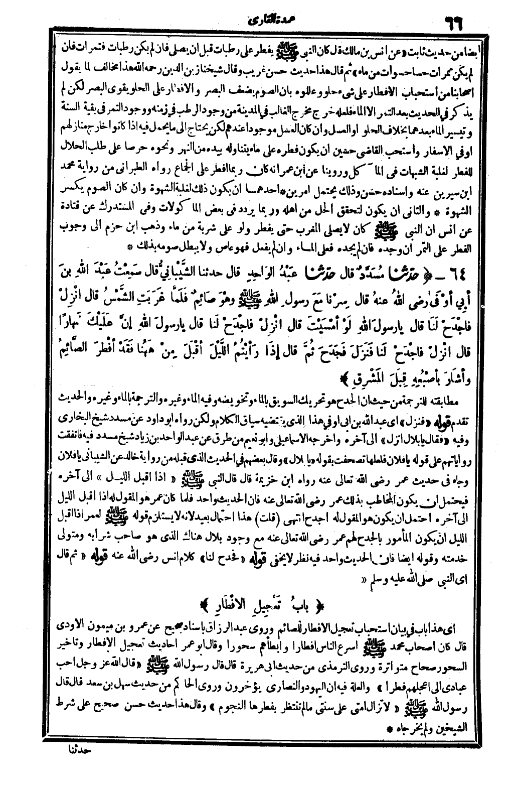 أَيْضا من حَدِيث ثَابت (عَن أنس بن مَالك، قَالَ: كَانَ النَّبِي صلى الله عَلَيْهِ وَسلم يفْطر على رطبات قبل أَن يُصَلِّي، فَإِن لم يكن رطبات فتمرات، فَإِن لم يكن تمرات حسا حسوات من مَاء) . ثمَّ قَالَ: هَذَا حَدِيث حسن غَرِيب، وَقَالَ شَيخنَا زين الدّين، رَحمَه الله، هَذَا مُخَالف لما يَقُول أَصْحَابنَا من اسْتِحْبَاب الْإِفْطَار على شَيْء حُلْو، وعللوه بِأَن الصَّوْم يضعف الْبَصَر والإفطار على الحلو يُقَوي الْبَصَر، لَكِن لم يذكر فِي الحَدِيث بعد التَّمْر إلاَّ المَاء، فَلَعَلَّهُ خرج مخرج الْغَالِب فِي الْمَدِينَة من وجود الرطب فِي زَمَنه، وَوُجُود التَّمْر فِي بَقِيَّة السّنة، وتيسير المَاء بعدهمَا بِخِلَاف الحلو أَو الْعَسَل، وَإِن كَانَ الْعَسَل مَوْجُودا عِنْدهم لَكِن يحْتَاج إِلَى مَا يحمل فِيهِ إِذا كَانُوا خَارج مَنَازِلهمْ، أَو فِي الْأَسْفَار. وَاسْتحبَّ القَاضِي حُسَيْن أَن يكون فطره على مَاء يتَنَاوَلهُ بِيَدِهِ من النَّهر وَنَحْوه حرصا على طلب الْحَلَال للفطر لغَلَبَة الشُّبُهَات فِي المآكل. وروينا عَن ابْن عمر أَنه كَانَ رُبمَا أفطر على الْجِمَاع، رَوَاهُ الطَّبَرَانِيّ من رِوَايَة مُحَمَّد ابْن سِيرِين عَنهُ، وَإِسْنَاده حسن، وَذَلِكَ يحْتَمل أَمريْن: أَحدهمَا: أَن يكون ذَلِك لغَلَبَة الشَّهْوَة وَإِن كَانَ الصَّوْم يكسر الشَّهْوَة. وَالثَّانِي: أَن يكون لتحَقّق الْحل من أَهله، وَرُبمَا يردد فِي بعض المأكولات. وَفِي (الْمُسْتَدْرك) : عَن قَتَادَة عَن أنس أَن النَّبِي صلى الله عَلَيْهِ وَسلم كَانَ لَا يُصَلِّي الْمغرب حَتَّى يفْطر، وَلَو على شربة من مَاء، وَذهب ابْن حزم إِلَى وجوب الْفطر على التَّمْر إِن وجده. فَإِن لم يجده فعلى المَاء، وَإِن لم يفعل فَهُوَ عاصٍ، وَلَا يبطل صَوْمه بذلك.