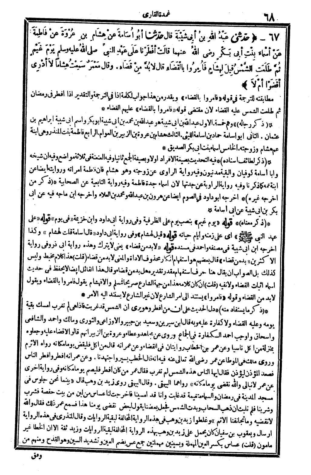 ذكر لطائف إِسْنَاده فِيهِ: التحديث بِصِيغَة الْإِفْرَاد أَولا وبصيغة الْجمع ثَانِيًا. وَفِيه: العنعنة فِي ثَلَاثَة مَوَاضِع. وَفِيه: أَن شَيْخه وَأَبا أُسَامَة كوفيان والبقية مدنيون. وَفِيه: رِوَايَة الرَّاوِي عَن زَوجته وَهُوَ هِشَام فَإِن فَاطِمَة امْرَأَته وَرِوَايَته أَيْضا عَن ابْنة عَمه كَمَا ذكرنَا. وَفِيه: رِوَايَة الراوية عَن جدَّتهَا لِأَن أَسمَاء جدة فَاطِمَة. وَفِيه: رِوَايَة التابعية عَن الصحابية.
