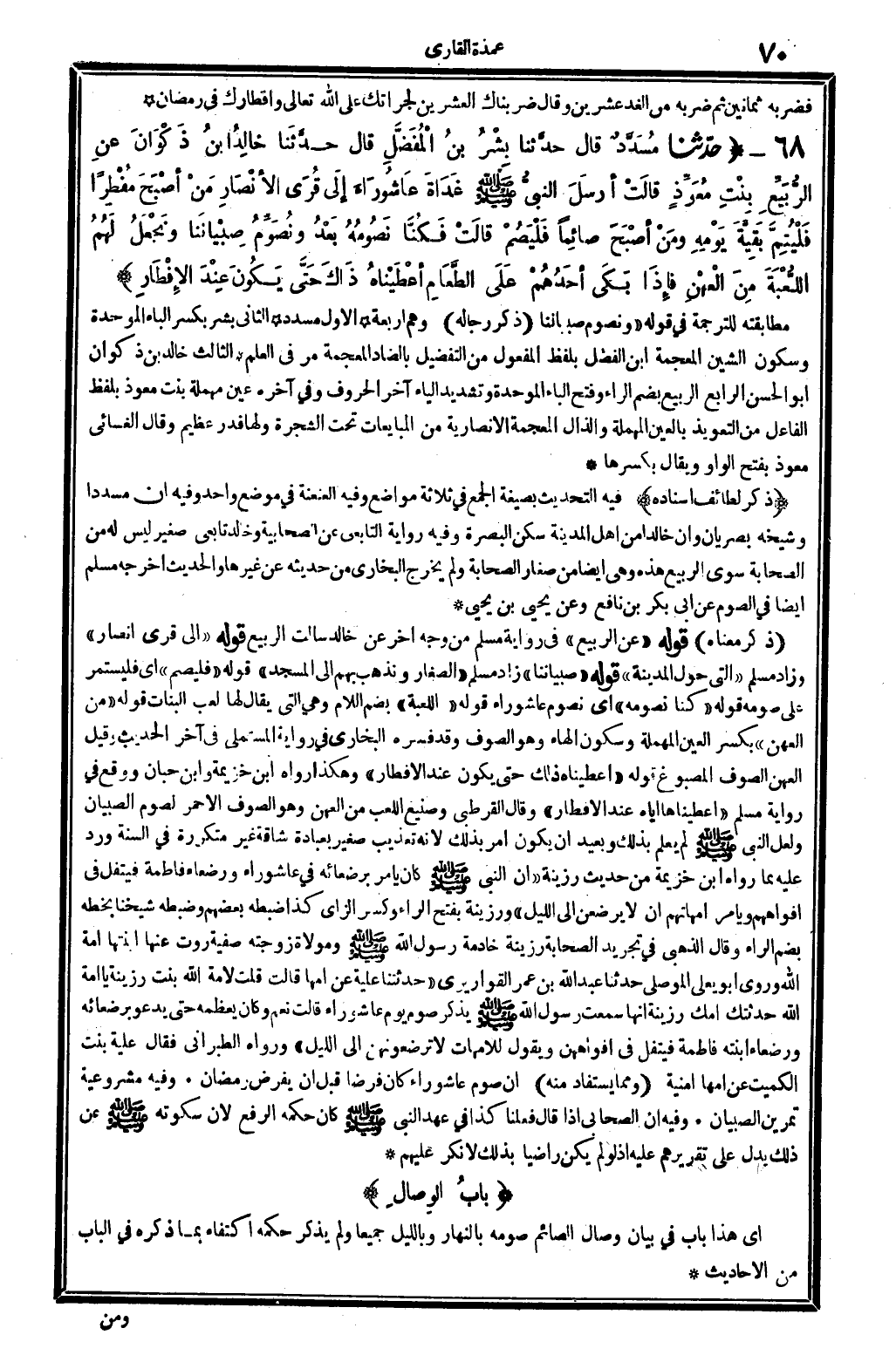 0691 - حدَّثنا مُسَدَّدٌ قَالَ حدَّثنا بِشْرُ بنُ المُفَضَّلِ قَالَ حدَّثنا خالِدُ ابنُ ذَكْوَانَ عنِ الرُّبَيْعِ بِنْتِ مُعَوَّذٍ قالَتْ أرْسَلَ النبيُّ صلى الله عَلَيْهِ وَسلم غَدَاةَ عاشُورَاءَ إلَى قُرى الأنْصَارِ مَنْ أصْبَحَ مُفْطِرا فَلْيُتِمَّ بَقِيَّةَ يَوْمِهِ ومَنْ أصْبَحَ صائِما فَلْيَصُمْ قالَتْ فَكُنَّا نَصُومُهُ بَعْد ونُصَوِّمُ صِبْيَانَنا ونَجْعَلُ لَهُمُ اللُّعْبَةَ مِنَ الْعِهْنِ فإذَا بَكَى أحَدُهُمْ عَلَى الطَّعَامِ أعْطَيْناهُ ذَاكَ حَتَّى يَكُونَ عِنْدَ الإفْطَارِ.