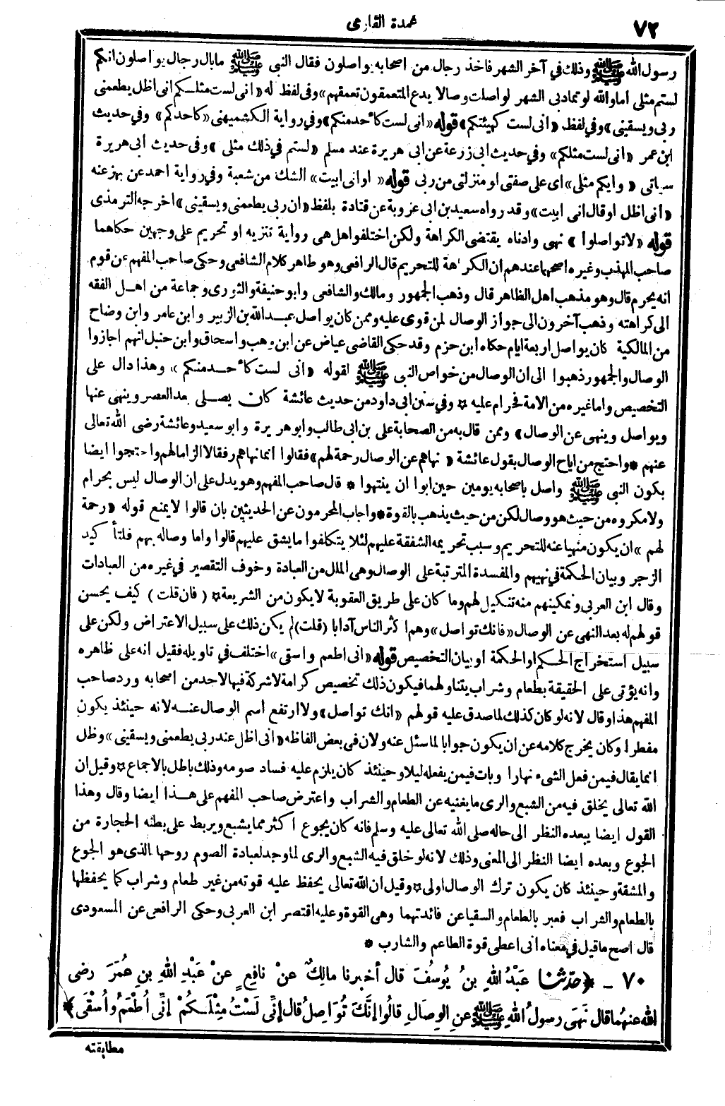 رَسُول الله صلى الله عَلَيْهِ وَسلم، وَذَلِكَ فِي آخر الشَّهْر، فَأخذ رجال من أَصْحَابه يواصلون، فَقَالَ النَّبِي صلى الله عَلَيْهِ وَسلم: مَا بَال رجال يواصلون؟ إِنَّكُم لَسْتُم مثلي. أما وَالله! لَو تماد بِي الشَّهْر لواصلت وصالاً يدع المتعمقون تعمقهم) . وَفِي لفظ لَهُ: (إِنِّي لست مثلكُمْ، إِنِّي أظل يطعمني رَبِّي ويسقيني) ، وَفِي لفظ: (إِنِّي لست كهيئتكم.