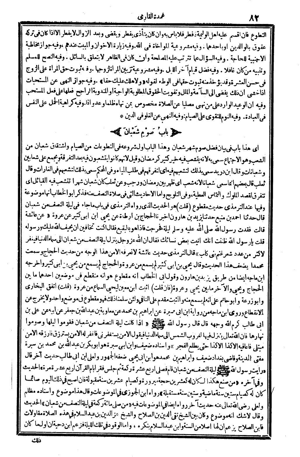 وروى ابْن مَاجَه من رِوَايَة ابْن أبي سُبْرَة عَن إِبْرَاهِيم بن مُحَمَّد عَن مُعَاوِيَة بن عبد الله بن جَعْفَر عَن أَبِيه عَن عَليّ بن أبي طَالب، كرم الله وَجهه، قَالَ: قَالَ رَسُول الله صلى الله عَلَيْهِ وَسلم: (إِذا كَانَت لَيْلَة النّصْف من شعْبَان فَقومُوا لَيْلهَا وصوموا نَهَارهَا، فَإِن الله تَعَالَى ينزل فِيهَا لغروب الشَّمْس إِلَى سَمَاء الدُّنْيَا فَيَقُول: ألاَ مَن يستغفرني فَأغْفِر لَهُ؟ أَلا من يسترزق فأرزقه؟ ألاَ من مبتلَى فأعافيه؟ ألاَ كَذَا؟ ألاَ كَذَا؟ حَتَّى يطلع الْفجْر) . وَإِسْنَاده ضَعِيف، وَابْن أبي سُبْرَة هُوَ أَبُو بكر بن عبد الله بن مُحَمَّد بن سُبْرَة مفتي الْمَدِينَة وقاضي بَغْدَاد ضَعِيف، وَإِبْرَاهِيم بن مُحَمَّد هُوَ ابْن أبي يحيى ضعفه الْجُمْهُور، ولعلي بن أبي طَالب حَدِيث آخر، قَالَ: (رَأَيْت رَسُول الله صلى الله عَلَيْهِ وَسلم لَيْلَة النّصْف من شعْبَان قَامَ فصلى أَربع عشرَة رَكْعَة، ثمَّ جلس، فَقَرَأَ بِأم الْقُرْآن أَربع عشرَة مرّة) الحَدِيث. وَفِي آخِره: (من صنع هَكَذَا لَكَانَ لَهُ كعشرين حجَّة مبرورة، وكصيام عشْرين سنة مَقْبُولَة، فَإِن أصبح فِي ذَلِك الْيَوْم صَائِما كَانَ لَهُ كصيام سِتِّينَ سنة مَاضِيَة، وَسِتِّينَ سنة مُسْتَقْبلَة) . رَوَاهُ ابْن الْجَوْزِيّ فِي (الموضوعات) وَقَالَ: هَذَا مَوْضُوع، وَإِسْنَاده مظلم. ولعلي، رَضِي الله تَعَالَى عَنهُ، حَدِيث آخر رَوَاهُ أَيْضا فِي (الموضوعات) فِيهِ: (من صلى مائَة رَكْعَة فِي لَيْلَة النّصْف من شعْبَان) الحَدِيث، وَقَالَ: لَا شكّ أَنه مَوْضُوع، وَكَانَ بَين الشَّيْخ تَقِيّ الدّين بن الصّلاح وَالشَّيْخ عز الدّين بن عبد السَّلَام فِي هَذِه الصَّلَاة مقاولات، فَابْن الصّلاح يزْعم أَن لَهَا أصلا من السّنة، وَابْن عبد السَّلَام يُنكره.