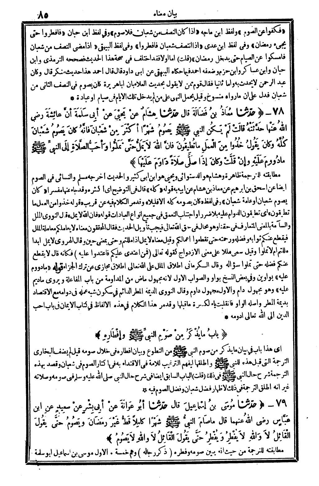 0791 - حدَّثنا مُعاذُ بنُ فَضَالَةَ قَالَ حدَّثنا هِشَامٌ عنُ يَحْيَى عنْ أبِي سَلَمَةَ أنَّ عائِشَةَ رَضِي الله تَعَالَى عَنْهَا حدَّثَتْهُ قالَتْ لَمْ يَكُنْ النبيُّ صلى الله عَلَيْهِ وَسلم يَصُومُ شَهْرا أكْثَرَ مِنْ شَعْبانَ فإنَّهُ كانَ يَصُومُ شَعْبانَ كُلَّهُ وكانَ يَقُولُ خُذُوا مِنَ العَمَلِ مَا تُطِيقُونَ فإنَّ الله لاَ يَمَلُّ حَتَّى تَمَلُّوا وَأحَبُّ الصَّلاةِ إلَى النبيِّ صلى الله عَلَيْهِ وَسلم مَا دُووِمَ عَلَيْهِ وإنْ قَلَّتْ وكانَ إذَا صَلَّى صَلاَةً دَاوَمَ عَلَيْهَا. (انْظُر الحَدِيث 9691 وطرفه) .