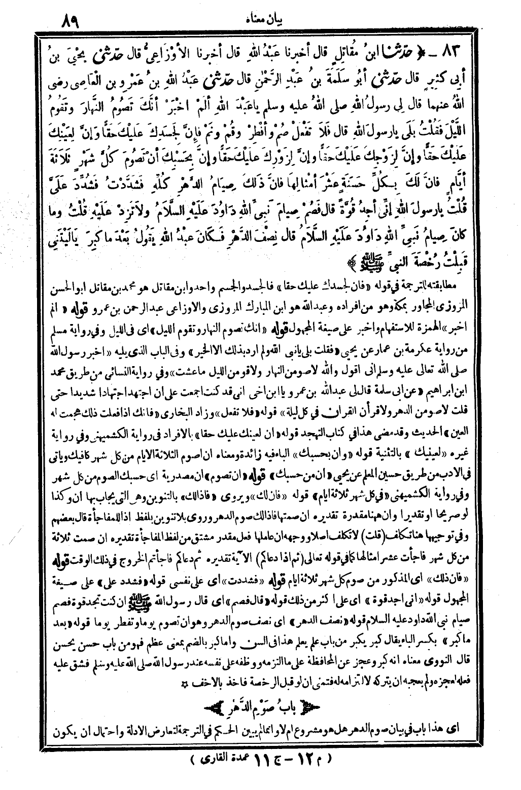 5791 - حدَّثنا ابنُ مقَاتِلٍ قَالَ أخبرنَا عَبْدُ الله قَالَ أخبرنَا الأوْزَاعِيُّ قَالَ حدَّثني يحْيَى بنُ أبِي كَثِيرٍ قَالَ حدَّثني أبُو سلَمَةَ بنُ عَبْدِ الراحْمانِ قَالَ حدَّثني عَبْدُ الله بنُ عَمْرِو بنِ الْعَاصِ رَضِي الله تَعَالَى عَنْهُمَا قَالَ لِي رسولُ الله صلى الله عَلَيْهِ وَسلم يَا عَبْدَ الله ألَمْ اخْبَرْ أنَّكَ تَصُومُ النَّهَارَ وتَقُومُ اللَّيْلَ فَقُلْتُ بَلَى يَا رسولَ الله قَالَ فَلاَ تَفْعَلْ صُمْ وأفْطِرْ وقُمْ ونَمْ فإنَّ لِجَسَدِكَ عَلَيْكَ حَقّا وَإنَّ لِعَيْنِكَ عَلَيْكَ حَقّا وإنَّ لِزَوْجَتِكَ علَيْكَ حَقّا وإنَّ لِزَوْرِكَ عليْكَ حَقّا وإنَّ بِحَسْبِكَ أنْ تَصُومَ كُلَّ شَهْرٍ ثَلاَثَةَ أيَّامَ فإنَّ لَكَ بِكُلِّ حَسَنَةٍ عَشْرَ أمْثَالِهَا فإنَّ ذَلِكَ صِيَامُ الدَّهْرِ كُلِّهِ فَشَدَّدْتُ فَشُدِّدَ علَيَّ قُلْتُ يَا رسولَ الله إنِّي أجِدُ قُوَّةً قَالَ فَصُمْ صِيامَ نَبِيَّ الله دَاوُدَ عَلَيْهِ السَّلامَ وَلَا تَزِدْ عَلَيْهِ قُلْتُ وَمَا كانَ صِيَامُ نَبيِّ الله دَاوُدَ عليْهِ السَّلاَمُ قَالَ نِصْفُ الدَّهْرِ فَكانَ عَبْدُ الله يَقُولُ بَعْدَ مَا كَبِرَ يَا لَيْتَنِي قَبِلْتُ رُخْصَةَ النبيِّ صلى الله عَلَيْهِ وَسلم. .