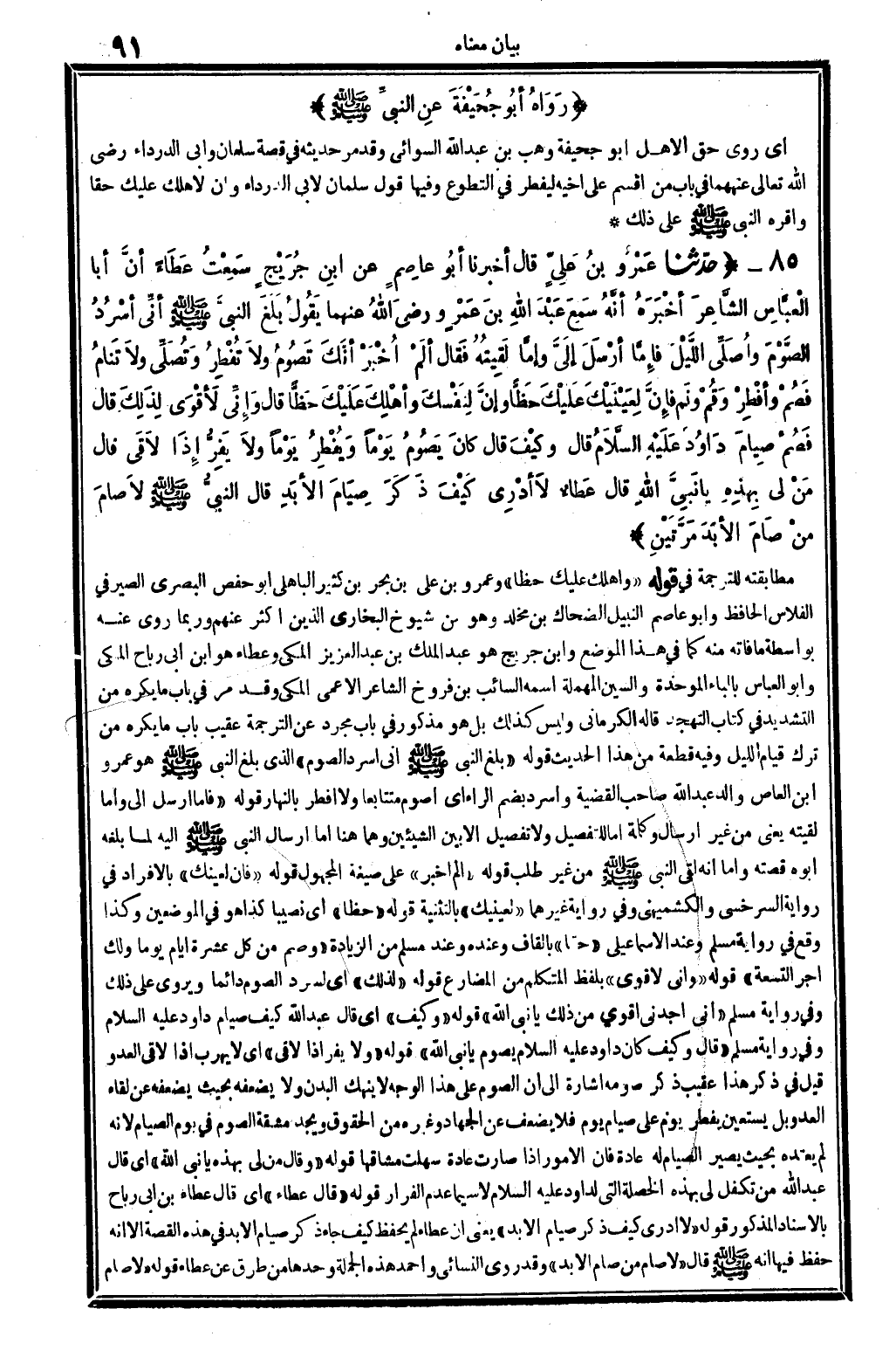 85 - (حَدثنَا عَمْرو بن عَليّ قَالَ أخبرنَا أَبُو عَاصِم عَن ابْن جريج سَمِعت عَطاء أَن أَبَا الْعَبَّاس الشَّاعِر أخبرهُ أَنه سمع عبد الله بن عَمْرو رَضِي الله عَنْهُمَا يَقُول بلغ النَّبِي - صَلَّى اللَّهُ عَلَيْهِ وَسَلَّم َ - أَنِّي أسرد الصَّوْم وأصلي اللَّيْل فإمَّا أرسل إِلَيّ وَإِمَّا لَقيته فَقَالَ ألم أخبر أَنَّك تَصُوم وَلَا تفطر وَتصلي وَلَا تنام فَصم وَأفْطر وقم ونم فَإِن لعينيك عَلَيْك حظا وَإِن لنَفسك وَأهْلك عَلَيْك حظا قَالَ وَإِنِّي لأقوى لذَلِك قَالَ فَصم صِيَام دَاوُد عَلَيْهِ السَّلَام قَالَ وَكَيف قَالَ كَانَ يَصُوم يَوْمًا وَيفْطر يَوْمًا وَلَا يفر إِذا لَاقَى قَالَ من لي بِهَذِهِ يَا نَبِي الله قَالَ عَطاء لَا أَدْرِي كَيفَ ذكر صِيَام الْأَبَد قَالَ النَّبِي - صَلَّى اللَّهُ عَلَيْهِ وَسَلَّم َ - لَا صَامَ من صَامَ الْأَبَد مرَّتَيْنِ) مطابقته للتَّرْجَمَة فِي قَوْله " وَأهْلك عَلَيْك حظا " وَعَمْرو بن عَليّ بن بَحر بن كثير الْبَاهِلِيّ أَبُو حَفْص الْبَصْرِيّ الصَّيْرَفِي الفلاس الْحَافِظ وَأَبُو عَاصِم النَّبِيل الضَّحَّاك بن مخلد وَهُوَ من شُيُوخ البُخَارِيّ الَّذين أَكثر عَنْهُم وَرُبمَا روى عَنهُ بِوَاسِطَة مَا فَاتَهُ مِنْهُ كَمَا فِي هَذَا الْموضع وَابْن جريج هُوَ عبد الْملك بن عبد الْعَزِيز الْمَكِّيّ وَعَطَاء هُوَ ابْن أبي رَبَاح الْمَكِّيّ وَأَبُو الْعَبَّاس بِالْبَاء الْمُوَحدَة وَالسِّين الْمُهْملَة اسْمه السَّائِب بن فروخ الشَّاعِر الْأَعْمَى الْمَكِّيّ وَقد مر فِي بَاب مَا يكره من التَّشْدِيد فِي كتاب التَّهَجُّد قَالَه الْكرْمَانِي وَلَيْسَ كَذَلِك بل هُوَ مَذْكُور فِي بَاب مُجَرّد عَن التَّرْجَمَة عقيب بَاب مَا يكره من ترك قيام اللَّيْل وَفِيه قِطْعَة من هَذَا الحَدِيث قَوْله " بلغ النَّبِي - صَلَّى اللَّهُ عَلَيْهِ وَسَلَّم َ - أَنِّي أسرد الصَّوْم " الَّذِي بلغ النَّبِي - صَلَّى اللَّهُ عَلَيْهِ وَسَلَّم َ - هُوَ عَمْرو بن الْعَاصِ وَالِد عبد الله صَاحب الْقَضِيَّة وأسرد بِضَم الرَّاء أَي أَصوم مُتَتَابِعًا وَلَا أفطر بِالنَّهَارِ قَوْله " فإمَّا أرسل إِلَيّ وَإِمَّا لَقيته " يَعْنِي من غير إرْسَال وَكلمَة إِمَّا للتفصيل وَلَا تَفْصِيل إِلَّا بَين الشَّيْئَيْنِ وهما هُنَا إِمَّا إرْسَال النَّبِي - صَلَّى اللَّهُ عَلَيْهِ وَسَلَّم َ - إِلَيْهِ لما بلغه أَبوهُ قصَّته وَإِمَّا أَنه لَقِي النَّبِي - صَلَّى اللَّهُ عَلَيْهِ وَسَلَّم َ - من غير طلب قَوْله " ألم أخبر " على صِيغَة الْمَجْهُول قَوْله " فَإِن لعينك " بِالْإِفْرَادِ فِي رِوَايَة السَّرخسِيّ والكشميهني وَفِي رِوَايَة غَيرهمَا " لعينيك " بالتثنية قَوْله " حظا " أَي نَصِيبا كَذَا هُوَ فِي الْمَوْضِعَيْنِ وَكَذَا وَقع فِي رِوَايَة مُسلم وَعند الْإِسْمَاعِيلِيّ " حَقًا " بِالْقَافِ وَعِنْده وَعند مُسلم من الزِّيَادَة " وصم من كل عشرَة أَيَّام يَوْمًا وَلَك أجر التِّسْعَة " قَوْله " وَإِنِّي لأقوى " بِلَفْظ الْمُتَكَلّم من الْمُضَارع قَوْله " لذَلِك " أَي لسرد الصَّوْم دَائِما ويروى على ذَلِك وَفِي رِوَايَة مُسلم " إِنِّي أجدني أقوى من ذَلِك يَا نَبِي الله " قَوْله " وَكَيف " أَي قَالَ عبد الله كَيفَ صِيَام دَاوُد عَلَيْهِ السَّلَام وَفِي رِوَايَة مُسلم " قَالَ وَكَيف كَانَ دَاوُد عَلَيْهِ السَّلَام يَصُوم يَا نَبِي الله " قَوْله " وَلَا يفر إِذا لَاقَى " أَي لَا يهرب إِذا لَاقَى الْعَدو قيل فِي ذكر هَذَا عقيب ذكر صَوْمه إِشَارَة إِلَى أَن الصَّوْم على هَذَا الْوَجْه لَا ينهك الْبدن وَلَا يُضعفهُ بِحَيْثُ يُضعفهُ عَن لِقَاء الْعَدو بل يَسْتَعِين يفْطر يَوْم على صِيَام يَوْم فَلَا يضعف عَن الْجِهَاد وَغَيره من الْحُقُوق ويجد مشقة الصَّوْم فِي يَوْم الصّيام لِأَنَّهُ لم يعتده بِحَيْثُ يصير الصّيام لَهُ عَادَة فَإِن الْأُمُور إِذا صَار