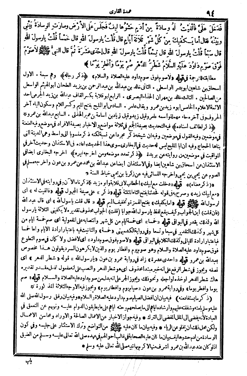 فَدَخَلَ عَلَيَّ فألْقَيْتُ لَهُ وِسادَةً مِنْ أدَمٍ حَشْوُها لِيفٌ فجَلَسَ عَلَى الأرْضِ وصارَتِ الوِسَادَةُ بَيْنِي وبَيْنَهُ فَقَالَ أما يَكْفِيكَ مِنْ كُلِّ شَهْرٍ ثَلاَثَةَ أيَّامٍ قَالَ قُلْتُ يَا رسولَ الله قَالَ خَمْسا قُلْتُ يَا رسولَ الله قَالَ سبْعا قُلْتُ يَا رسولَ الله قَالَ تِسْعا قُلْتُ يَا رسولَ الله قالَ إحْدَى عَشَرَةَ ثُمَّ قالَ النبيُّ صلى الله عَلَيْهِ وَسلم لاَ صَوْمَ فَوْقَ صَوْمِ دَاوُدَ عَلَيْهِ السَّلامُ شَطْر الدَّهْرِ صُمْ يَوْما وأفْطِر يوْما. .