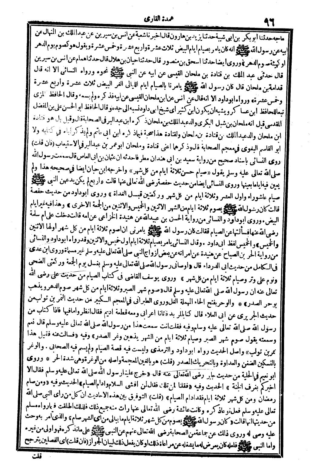 مَاجَه: حَدثنَا أَبُو بكر بن أبي شيبَة، حَدثنَا يزِيد بن هَارُون قَالَ: أخبرنَا شُعْبَة عَن أنس بن سِيرِين عَن عبد الْملك بن الْمنْهَال عَن أَبِيه عَن رَسُول الله صلى الله عَلَيْهِ وَسلم أَنه كَانَ يَأْمر بصيام أَيَّام الْبيض: ثَلَاث عشرَة وَأَرْبع عشرَة وَخمْس عشرَة، وَيَقُول: (هُوَ كَصَوْم يَوْم الدَّهْر. أَو كَهَيئَةِ صَوْم الدَّهْر) وروى أَيْضا: حَدثنَا إِسْحَاق بن مَنْصُور، قَالَ: حَدثنَا حَيَّان بن هِلَال، قَالَ: حَدثنَا همام عَن أنس بن سِيرِين قَالَ: حَدثنِي عبد الْملك بن قَتَادَة بن ملْحَان الْقَيْسِي عَن أَبِيه عَن النَّبِي صلى الله عَلَيْهِ وَسلم نَحوه، وَرَوَاهُ النَّسَائِيّ إلاَّ أَنه قَالَ: قدامَة بن ملْحَان قَالَ: (كَانَ رَسُول الله صلى الله عَلَيْهِ وَسلم يَأْمُرنَا بالصيام أَيَّام اللَّيَالِي الغر الْبيض: ثَلَاث عشرَة وَأَرْبع عشرَة وَخمْس عشرَة) وَرَوَاهُ أَبُو دَاوُد إلاَّ أَنه قَالَ: عَن أنس عَن ابْن ملْحَان الْقَيْسِي عَن أَبِيه ... فَذكره وَلم يسمه، وَقَالَ الْحَافِظ الْمزي تبعا لِلْحَافِظِ ابْن عَسَاكِر: وَيُشبه أَن يكون ابْن كثير أَي شيخ أبي دَاوُد نسبه إِلَى جده، وَقَالَ الْحَافِظ أَبُو الْحسن عَليّ بن الْمفضل الْمَقْدِسِي: قيل: إِنَّه ملْحَان بن شبْل الْبكْرِيّ وَالِد عبد الْملك بن ملْحَان، ذكره ابْن عبد الْبر فِي الصَّحَابَة، قَالَ: وَقيل: بل هُوَ قَتَادَة ابْن ملْحَان وَالِد عبد الْملك بن قَتَادَة بن ملْحَان، ولقتادة هَذَا صُحْبَة فِيمَا ذكره ابْن أبي حَاتِم وَلم يذكر أَبَاهُ فِي كِتَابه، وَلَا أَبُو الْقَاسِم البقوي فِي (مُعْجم الصَّحَابَة) ، قَالَ: وذكرهما أَعنِي: قَتَادَة وملحان أَبُو عمر بن عبد الْبر فِي (الِاسْتِيعَاب) فَإِن قلت: روى النَّسَائِيّ بِإِسْنَاد صَحِيح من رِوَايَة سعيد بن أبي هِنْد أَن مطرفا حَدثهُ أَن عُثْمَان بن أبي الْعَاصِ، قَالَ: سَمِعت رَسُول الله صلى الله عَلَيْهِ وَسلم، يَقُول: (صيامٌ حسنٌ ثَلَاثَة أَيَّام من كل شهر) وَأخرجه ابْن حبَان أَيْضا فِي (صَحِيحه) هَذَا وَلم يعين فِيهِ أَيَّامًا بِعَينهَا، وروى النَّسَائِيّ أَيْضا من حَدِيث حَفْصَة، رَضِي الله تَعَالَى عَنْهَا، قَالَت: (أَربع لم يكن يدعهن النَّبِي صلى الله عَلَيْهِ وَسلم: صِيَام عَاشُورَاء، وَأول الْعشْر، وَثَلَاثَة أَيَّام من كل شهر، وَرَكْعَتَيْنِ قبل الْغَدَاة) . وروى أَبُو دَاوُد من حَدِيث حَفْصَة قَالَت: كَانَ رَسُول الله صلى الله عَلَيْهِ وَسلم يَصُوم ثَلَاثَة أَيَّام من الشَّهْر: الِاثْنَيْنِ وَالْخَمِيس والإثنين من الْجُمُعَة الْأُخْرَى) . وَهَذَا فِيهِ غير أَيَّام الْبيض.