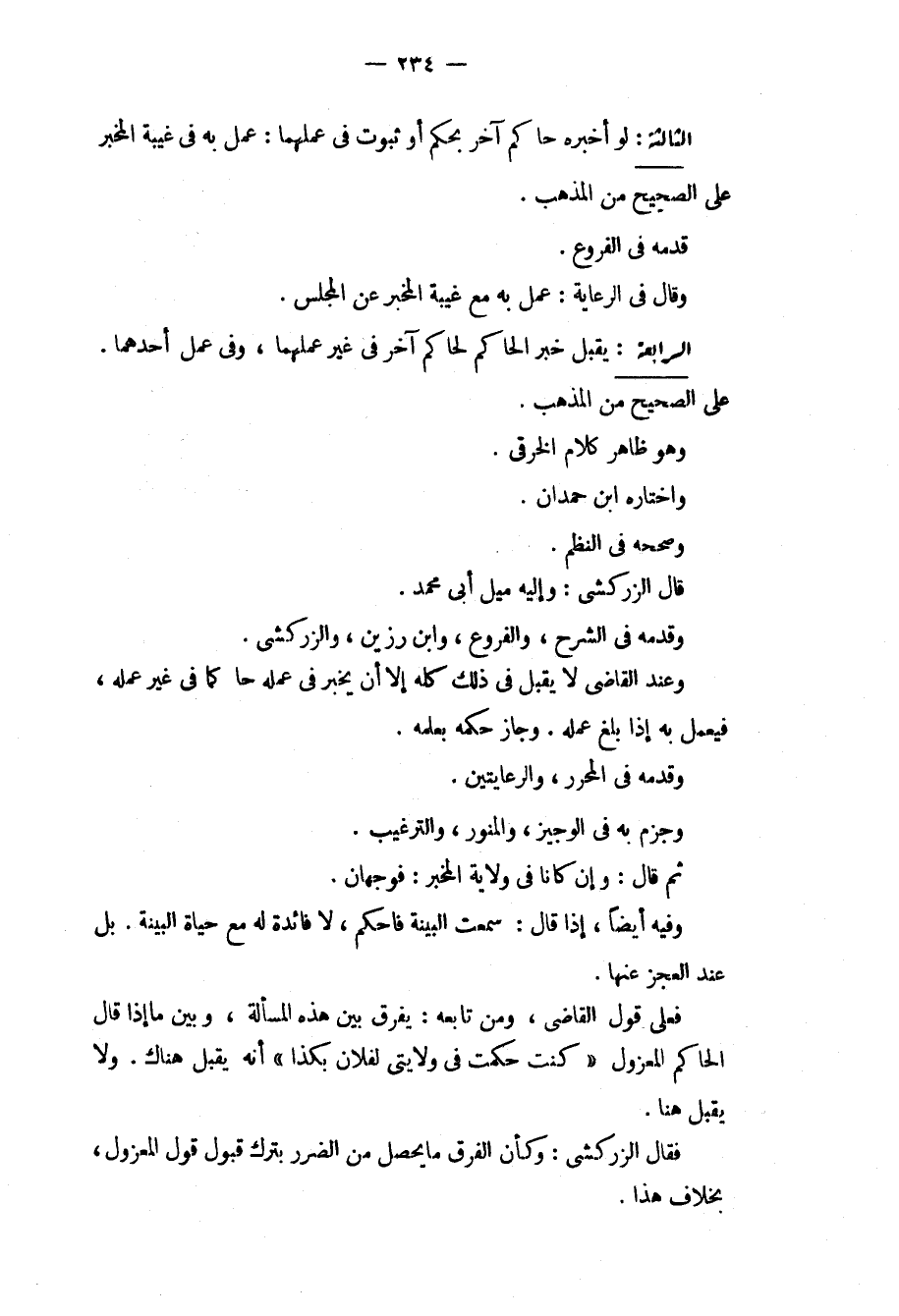 الرَّابِعَةُ: يُقْبَلُ خَبَرُ الْحَاكِمِ لِحَاكِمٍ آخَرَ فِي غَيْرِ عَمَلِهِمَا، وَفِي عَمَلِ أَحَدِهِمَا. عَلَى الصَّحِيحِ مِنْ الْمَذْهَبِ. وَهُوَ ظَاهِرُ كَلَامِ الْخِرَقِيِّ. وَاخْتَارَهُ ابْنُ حَمْدَانَ. وَصَحَّحَهُ فِي النَّظْمِ. قَالَ الزَّرْكَشِيُّ: وَإِلَيْهِ مَيْلُ أَبِي مُحَمَّدٍ. وَقَدَّمَهُ فِي الشَّرْحِ، وَالْفُرُوعِ. وَابْنِ رَزِينٍ، وَالزَّرْكَشِيِّ. وَعِنْدَ الْقَاضِي لَا يُقْبَلُ فِي ذَلِكَ كُلِّهِ إلَّا أَنْ يُخْبِرَ فِي عَمَلِهِ حَاكِمًا فِي غَيْرِ عَمَلِهِ، فَيَعْمَلُ بِهِ إذَا بَلَغَ عَمَلُهُ. وَجَازَ حُكْمُهُ بِعِلْمِهِ. وَقَدَّمَهُ فِي الْمُحَرَّرِ، وَالرِّعَايَتَيْنِ. وَجَزَمَ بِهِ فِي الْوَجِيزِ، وَالْمُنَوِّرِ، وَالتَّرْغِيبِ. ثُمَّ قَالَ: وَإِنْ كَانَا فِي وِلَايَةِ الْمُخْبِرِ: فَوَجْهَانِ. وَفِيهِ أَيْضًا، إذَا قَالَ: سَمِعْت الْبَيِّنَةَ فَاحْكُمْ، لَا فَائِدَةَ لَهُ مَعَ حَيَاةِ الْبَيِّنَةِ. بَلْ عِنْدَ الْعَجْزِ عَنْهَا. فَعَلَى قَوْلِ الْقَاضِي، وَمَنْ تَابَعَهُ: يُفَرَّقُ بَيْنَ هَذِهِ الْمَسْأَلَةِ، وَبَيْنَ مَا إذَا قَالَ الْحَاكِمُ الْمَعْزُولُ " كُنْت حَكَمْت فِي وِلَايَتِي لِفُلَانٍ بِكَذَا " أَنَّهُ يُقْبَلُ هُنَاكَ. وَلَا يُقْبَلُ هُنَا. فَقَالَ الزَّرْكَشِيُّ: وَكَأَنَّ الْفَرْقَ مَا يَحْصُلُ مِنْ الضَّرَرِ بِتَرْكِ قَبُولِ قَوْلِ الْمَعْزُولِ. بِخِلَافِ هَذَا.