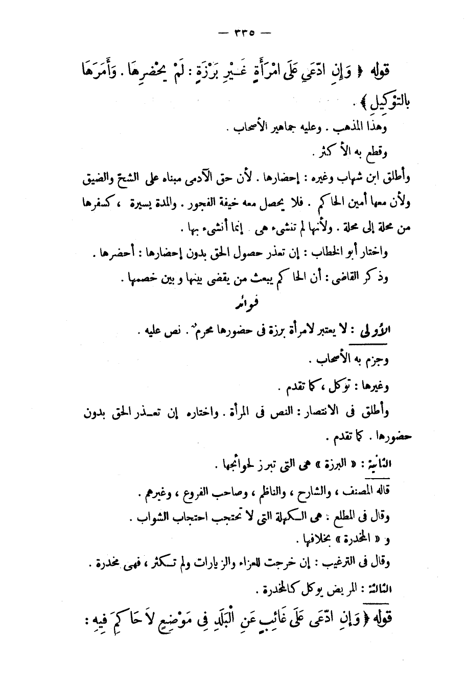 قَوْلُهُ (وَإِنْ ادَّعَى عَلَى امْرَأَةٍ غَيْرِ بَرْزَةٍ: لَمْ يُحْضِرْهَا. وَأَمَرَهَا بِالتَّوْكِيلِ) . وَهَذَا الْمَذْهَبُ. وَعَلَيْهِ جَمَاهِيرُ الْأَصْحَابِ. وَقَطَعَ بِهِ الْأَكْثَرُ. وَأَطْلَقَ ابْنُ شِهَابٍ وَغَيْرُهُ: إحْضَارَهَا. لِأَنَّ حَقَّ الْآدَمِيِّ مَبْنَاهُ عَلَى الشُّحِّ وَالضِّيقِ وَلِأَنَّ مَعَهَا أَمِينَ الْحَاكِمِ. فَلَا يَحْصُلُ مَعَهُ خِيفَةُ الْفُجُورِ. وَالْمُدَّةُ يَسِيرَةٌ، كَسَفَرِهَا مِنْ مَحَلَّةٍ إلَيَّ مَحَلَّةٍ. وَلِأَنَّهَا لَمْ تُنْشِئْ هِيَ إنَّمَا أُنْشِئَ بِهَا. وَاخْتَارَ أَبُو الْخَطَّابِ: إنْ تَعَذَّرَ حُصُولُ الْحَقِّ بِدُونِ إحْضَارِهَا: أَحْضَرَهَا. وَذَكَرَ الْقَاضِي: أَنَّ الْحَاكِمَ يَبْعَثُ مَنْ يَقْضِي بَيْنَهَا وَبَيْنَ خَصْمِهَا. فَوَائِدُ