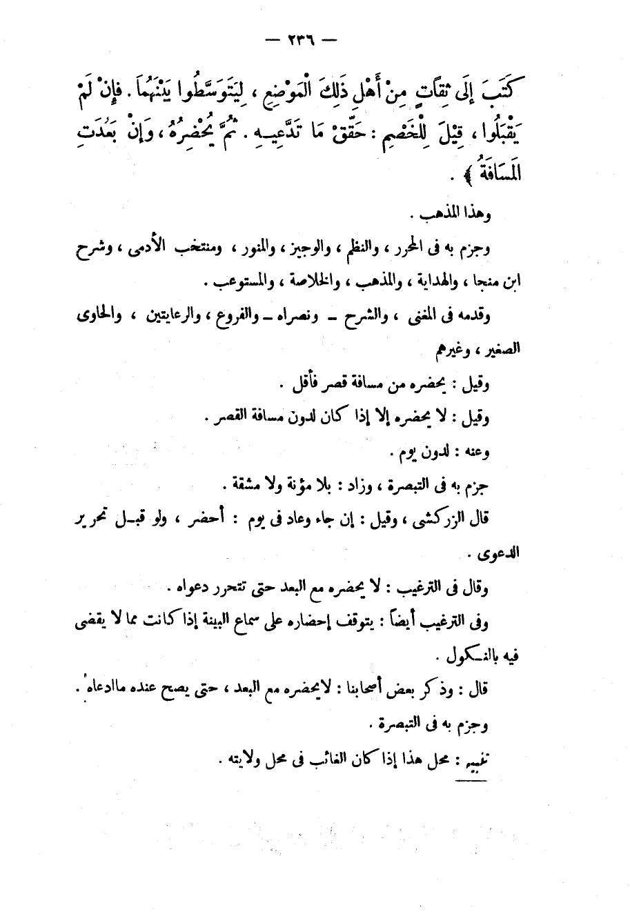 كَتَبَ إلَى ثِقَاتٍ مِنْ أَهْلِ ذَلِكَ الْمَوْضِعِ، لِيَتَوَسَّطُوا بَيْنَهُمَا. فَإِنْ لَمْ يَقْبَلُوا، قِيلَ لِلْخَصْمِ: حَقِّقْ مَا تَدَّعِيهِ. ثُمَّ يُحْضِرُهُ، وَإِنْ بَعُدَتْ الْمَسَافَةُ) . وَهَذَا الْمَذْهَبُ. وَجَزَمَ بِهِ فِي الْمُحَرَّرِ، وَالنَّظْمِ، وَالْوَجِيزِ، وَالْمُنَوِّرِ، وَمُنْتَخَبِ الْأَدَمِيِّ، وَشَرْحِ ابْنِ مُنَجَّا، وَالْهِدَايَةِ، وَالْمُذَهَّبِ، وَالْخُلَاصَةِ، وَالْمُسْتَوْعِبِ. وَقَدَّمَهُ فِي الْمُغْنِي، وَالشَّرْحِ وَنَصَرَاهُ وَالْفُرُوعِ، وَالرِّعَايَتَيْنِ، وَالْحَاوِي الصَّغِيرِ، وَغَيْرِهِمْ وَقِيلَ: يُحْضِرُهُ مِنْ مَسَافَةِ قَصْرٍ فَأَقَلَّ. وَقِيلَ: لَا يُحْضِرُهُ إلَّا إذَا كَانَ لِدُونِ مَسَافَةِ الْقَصْرِ. وَعَنْهُ: لِدُونِ يَوْمٍ جَزَمَ بِهِ فِي التَّبْصِرَةِ، وَزَادَ: بِلَا مُؤْنَةٍ وَلَا مَشَقَّةٍ. قَالَ الزَّرْكَشِيُّ، وَقِيلَ: إنْ جَاءَ وَعَادَ فِي يَوْمٍ: أُحْضِرَ، وَلَوْ قَبْلَ تَحْرِيرِ الدَّعْوَى. وَقَالَ فِي التَّرْغِيبِ: لَا يُحْضِرُهُ مَعَ الْبُعْدِ حَتَّى تَتَحَرَّرَ دَعْوَاهُ. وَفِي التَّرْغِيبِ أَيْضًا: يَتَوَقَّفُ إحْضَارُهُ عَلَى سَمَاعِ الْبَيِّنَةِ إذَا كَانَتْ مِمَّا لَا يَقْضِي فِيهِ بِالنُّكُولِ. قَالَ: وَذَكَرَ بَعْضُ أَصْحَابِنَا: لَا يُحْضِرُهُ مَعَ الْبُعْدِ، حَتَّى يَصِحَّ عِنْدَهُ مَا ادَّعَاهُ. وَجَزَمَ بِهِ فِي التَّبْصِرَةِ.