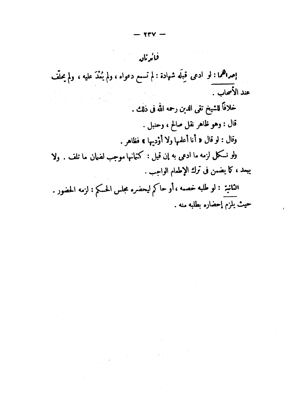 إحْدَاهُمَا: لَوْ ادَّعَى قَبْلَهُ شَهَادَةً: لَمْ تُسْمَعْ دَعْوَاهُ، وَلَمْ يُعْدَ عَلَيْهِ، وَلَمْ يَحْلِفْ عِنْدَ الْأَصْحَابِ. خِلَافًا لِلشَّيْخِ تَقِيِّ الدِّينِ - رَحِمَهُ اللَّهُ - فِي ذَلِكَ. قَالَ: وَهُوَ ظَاهِرُ نَقْلِ صَالِحٍ، وَحَنْبَلٍ. وَقَالَ: لَوْ قَالَ " أَنَا أَعْلَمُهَا وَلَا أُؤَدِّيهَا " فَظَاهِرٌ. وَلَوْ نَكَلَ لَزِمَهُ مَا ادَّعَى بِهِ إنْ قِيلَ: كِتْمَانُهَا مُوجِبٌ لِضَمَانِ مَا تَلِفَ. وَلَا يَبْعُدُ كَمَا يَضْمَنُ فِي تَرْكِ الْإِطْعَامِ الْوَاجِبِ.