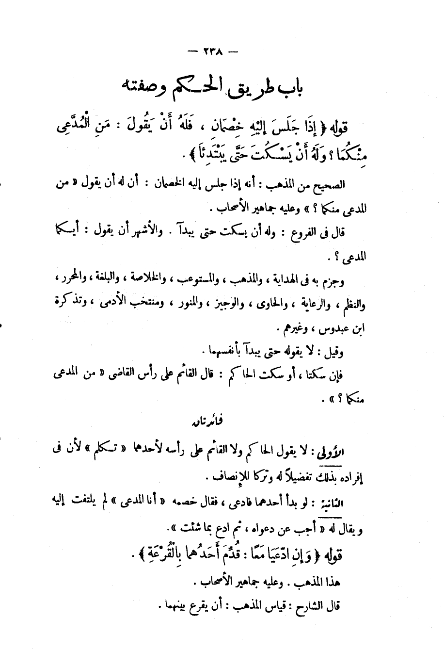 ِ قَوْلُهُ (إذَا جَلَسَ إلَيْهِ خَصْمَانِ، فَلَهُ أَنْ يَقُولَ: مَنْ الْمُدَّعِي مِنْكُمَا؟ وَلَهُ أَنْ يَسْكُتَ حَتَّى يَبْتَدِئَا) الصَّحِيحُ مِنْ الْمَذْهَبِ: أَنَّهُ إذَا جَلَسَ إلَيْهِ الْخَصْمَانِ: أَنَّ لَهُ أَنْ يَقُولَ " مَنْ الْمُدَّعِي مِنْكُمَا؟ " وَعَلَيْهِ جَمَاهِيرُ الْأَصْحَابِ. قَالَ فِي الْفُرُوعِ: وَلَهُ أَنْ يَسْكُتَ حَتَّى يَبْدَأَ. وَالْأَشْهَرُ أَنْ يَقُولَ: أَيُّكُمَا الْمُدَّعِي؟ . وَجَزَمَ بِهِ فِي الْهِدَايَةِ، وَالْمُذْهَبِ، وَالْمُسْتَوْعِبِ، وَالْخُلَاصَةِ، وَالْبُلْغَةِ، وَالْمُحَرَّرِ، وَالنَّظْمِ، وَالرِّعَايَةِ، وَالْحَاوِي، وَالْوَجِيزِ، وَالْمُنَوِّرِ، وَمُنْتَخَبِ الْأَدَمِيِّ، وَتَذْكِرَةِ ابْنِ عَبْدُوسٍ، وَغَيْرِهِمْ. وَقِيلَ: لَا يَقُولُهُ حَتَّى يَبْدَأَ بِأَنْفُسِهِمَا. فَإِنْ سَكَتَا، أَوْ سَكَتَ الْحَاكِمُ: قَالَ الْقَائِمُ عَلَى رَأْسِ الْقَاضِي " مَنْ الْمُدَّعِي مِنْكُمَا؟ ". فَائِدَتَانِ الْأُولَى: لَا يَقُولُ الْحَاكِمُ وَلَا الْقَائِمُ عَلَى رَأْسِهِ لِأَحَدِهِمَا " تَكَلَّمْ " لِأَنَّ فِي إفْرَادِهِ بِذَلِكَ تَفْضِيلًا لَهُ وَتَرْكًا لِلْإِنْصَافِ.