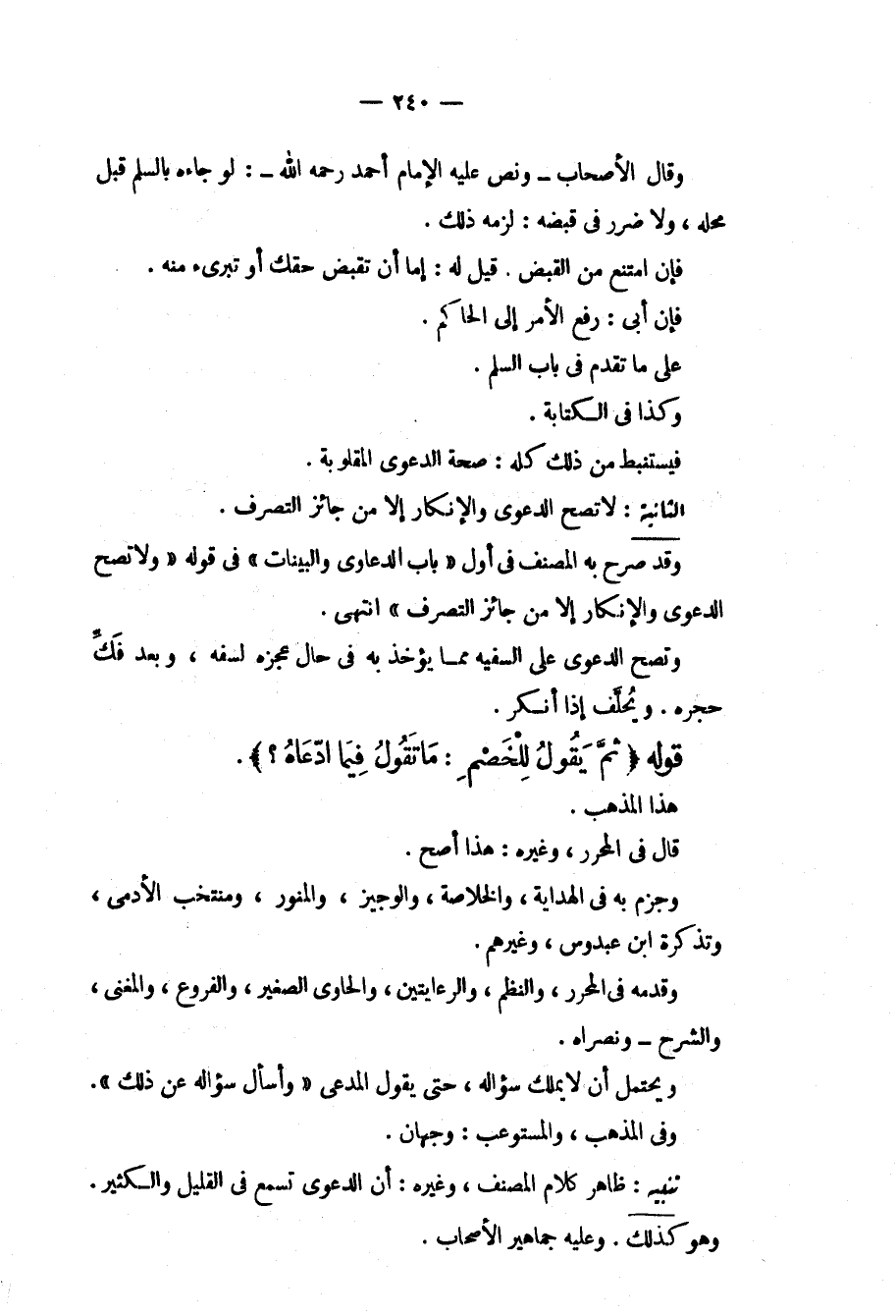 الثَّانِيَةُ: لَا تَصِحُّ الدَّعْوَى وَالْإِنْكَارُ إلَّا مِنْ جَائِزِ التَّصَرُّفِ. وَقَدْ صَرَّحَ بِهِ الْمُصَنِّفُ فِي أَوَّلِ " بَابِ الدَّعَاوَى وَالْبَيِّنَاتِ " فِي قَوْلِهِ " وَلَا تَصِحُّ الدَّعْوَى وَالْإِنْكَارُ إلَّا مِنْ جَائِزِ التَّصَرُّفِ " انْتَهَى. وَتَصِحُّ الدَّعْوَى عَلَى السَّفِيهِ مِمَّا يُؤْخَذُ بِهِ فِي حَالِ عَجْزِهِ لِسَفَهٍ، وَبَعْدَ فَكِّ حَجْرِهِ. وَيَحْلِفُ إذَا أَنْكَرَ. قَوْلُهُ (ثُمَّ يَقُولُ لِلْخَصْمِ: مَا تَقُولُ فِيمَا ادَّعَاهُ؟) . هَذَا الْمَذْهَبُ. قَالَ فِي الْمُحَرَّرِ، وَغَيْرِهِ: هَذَا أَصَحُّ. وَجَزَمَ بِهِ فِي الْهِدَايَةِ، وَالْخُلَاصَةِ، وَالْوَجِيزِ، وَالْمُنَوِّرِ، وَمُنْتَخَبِ الْأَدَمِيِّ، وَتَذْكِرَةِ ابْنِ عَبْدُوسٍ، وَغَيْرِهِمْ. وَقَدَّمَهُ فِي الْمُحَرَّرِ، وَالنَّظْمِ، وَالرِّعَايَتَيْنِ، وَالْحَاوِي الصَّغِيرِ، وَالْفُرُوعِ، وَالْمُغْنِي، وَالشَّرْحِ وَنَصَرَاهُ. وَيُحْتَمَلُ أَنْ لَا يَمْلِكُ سُؤَالَهُ، حَتَّى يَقُولَ الْمُدَّعِي " وَأَسْأَلُ سُؤَالَهُ عَنْ ذَلِكَ ". وَفِي الْمَذْهَبِ، وَالْمُسْتَوْعِبِ: وَجْهَانِ.