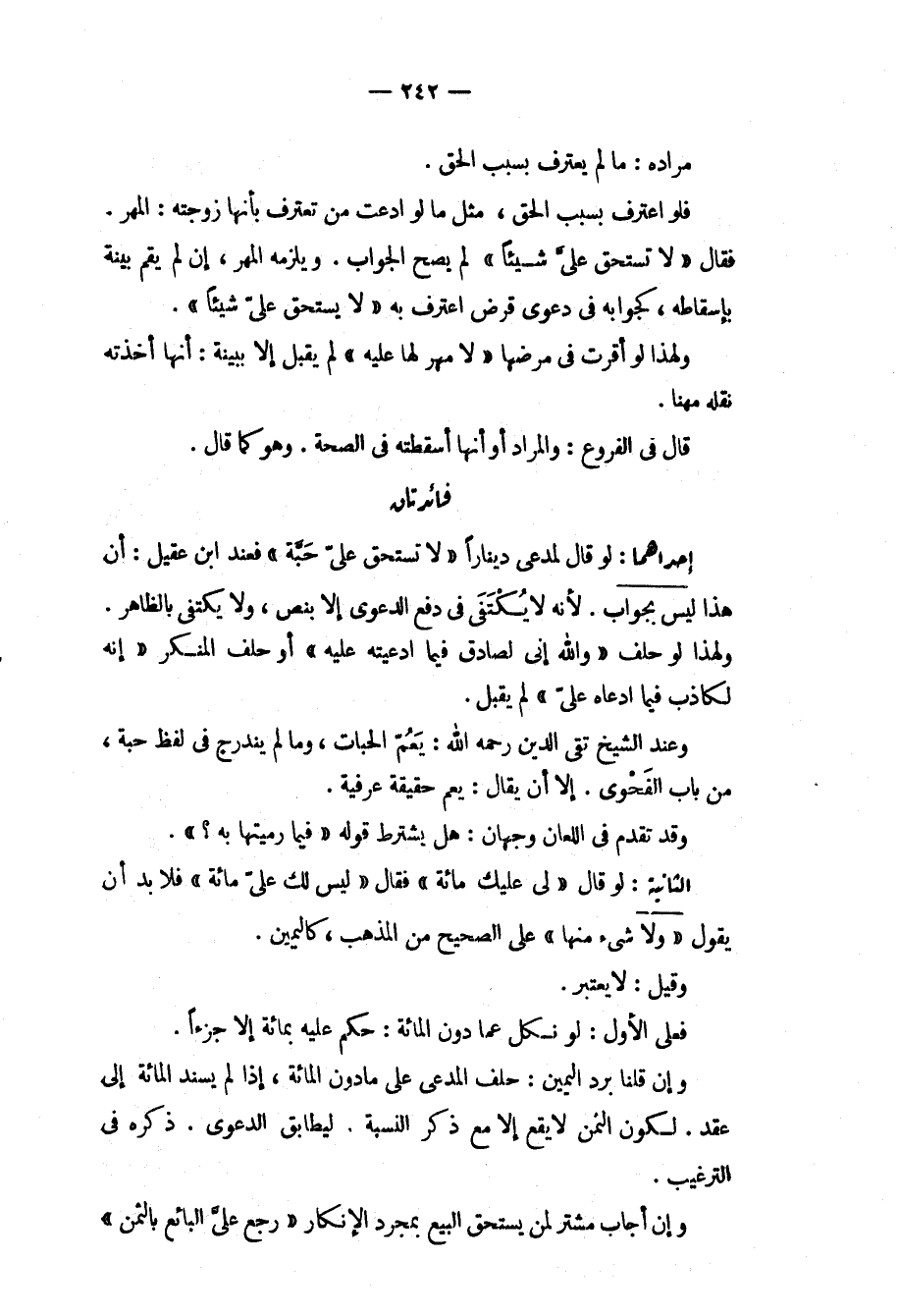 مُرَادُهُ: مَا لَمْ يَعْتَرِفْ بِسَبَبِ الْحَقِّ. فَلَوْ اعْتَرَفَ بِسَبَبِ الْحَقِّ، مِثْلَ مَا لَوْ ادَّعَتْ مَنْ تَعْتَرِفُ بِأَنَّهَا زَوْجَتُهُ: الْمَهْرَ. فَقَالَ " لَا تَسْتَحِقُّ عَلَيَّ شَيْئًا " لَمْ يَصِحَّ الْجَوَابُ. وَيَلْزَمُهُ الْمَهْرُ، إنْ لَمْ يُقِمْ بَيِّنَةً بِإِسْقَاطِهِ، كَجَوَابِهِ فِي دَعْوَى قَرْضٍ اعْتَرَفَ بِهِ " لَا يَسْتَحِقُّ عَلَيَّ شَيْئًا ". وَلِهَذَا لَوْ أَقَرَّتْ فِي مَرَضِهَا " لَا مَهْرَ لَهَا عَلَيْهِ " لَمْ يُقْبَلْ إلَّا بِبَيِّنَةٍ: أَنَّهَا أَخَذَتْهُ نَقَلَهُ مُهَنَّا. قَالَ فِي الْفُرُوعِ: وَالْمُرَادُ أَوْ أَنَّهَا أَسْقَطَتْهُ فِي الصِّحَّةِ. وَهُوَ كَمَا قَالَ. فَائِدَتَانِ