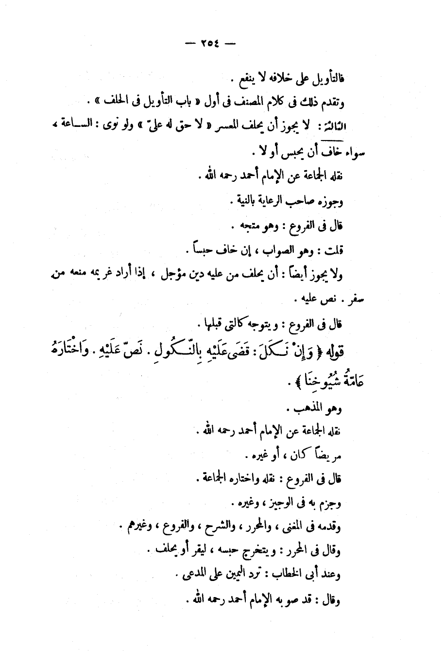 الثَّالِثَةُ: لَا يَجُوزُ أَنْ يَحْلِفَ الْمُعْسِرُ " لَا حَقَّ لَهُ عَلَيَّ " وَلَوْ نَوَى: السَّاعَةَ، سَوَاءٌ خَافَ أَنْ يُحْبَسَ أَوْ لَا. نَقَلَهُ الْجَمَاعَةُ عَنْ الْإِمَامِ أَحْمَدَ - رَحِمَهُ اللَّهُ -. وَجَوَّزَهُ صَاحِبُ الرِّعَايَةِ بِالنِّيَّةِ. قَالَ فِي الْفُرُوعِ: وَهُوَ مُتَّجَهٌ. قُلْت: وَهُوَ الصَّوَابُ، إنَّ خَافَ حَبْسًا. وَلَا يَجُوزُ أَيْضًا: أَنْ يَحْلِفَ مَنْ عَلَيْهِ دَيْنٌ مُؤَجَّلٌ، إذَا أَرَادَ غَرِيمُهُ مَنْعَهُ مِنْ سَفَرٍ. نَصَّ عَلَيْهِ. قَالَ فِي الْفُرُوعِ: وَيُتَوَجَّهُ كَاَلَّتِي قَبْلَهَا