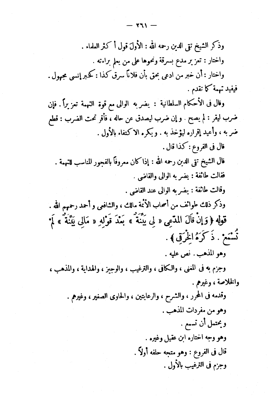 وَذَكَرَ الشَّيْخُ تَقِيُّ الدِّينِ - رَحِمَهُ اللَّهُ -: الْأَوَّلَ قَوْلُ أَكْثَرِ الْعُلَمَاءِ. وَاخْتَارَ: تَعْزِيرَ مُدَّعٍ بِسَرِقَةٍ وَنَحْوِهَا عَلَى مَنْ يُعْلَمْ بَرَاءَتُهُ. وَاخْتَارَ: أَنَّ خَبَرَ مَنْ ادَّعَى بِحَقٍّ بِأَنَّ فُلَانًا سَرَقَ كَذَا: كَخَبَرِ إنْسِيٍّ مَجْهُولٍ. فَيُفِيدُ تُهْمَةً كَمَا تَقَدَّمَ. وَقَالَ فِي الْأَحْكَامِ السُّلْطَانِيَّةِ: يَضْرِبُهُ الْوَالِي مَعَ قُوَّةِ التُّهْمَةِ تَعْزِيرًا. فَإِنْ ضُرِبَ لِيُقِرَّ: لَمْ يَصِحَّ. وَإِنْ ضُرِبَ لِيَصْدُقَ عَنْ حَالِهِ، فَأَقَرَّ تَحْتَ الضَّرْبِ: قُطِعَ ضَرْبُهُ، وَأُعِيدَ إقْرَارُهُ لِيُؤْخَذَ بِهِ. وَيُكْرَهُ الِاكْتِفَاءُ بِالْأَوَّلِ. قَالَ فِي الْفُرُوعِ: كَذَا قَالَ. قَالَ الشَّيْخُ تَقِيُّ الدِّينِ - رَحِمَهُ اللَّهُ -: إذَا كَانَ مَعْرُوفًا بِالْفُجُورِ الْمُنَاسِبِ لِلتُّهْمَةِ. فَقَالَتْ طَائِفَةٌ: يَضْرِبُهُ الْوَالِي وَالْقَاضِي. وَقَالَتْ طَائِفَةٌ: يَضْرِبُهُ الْوَالِي عِنْدَ الْقَاضِي. وَذَكَرَ ذَلِكَ طَوَائِفُ مِنْ أَصْحَابِ الْأَئِمَّةِ مَالِكٍ، وَالشَّافِعِيِّ وَأَحْمَدَ رَحِمَهُمْ اللَّهُ