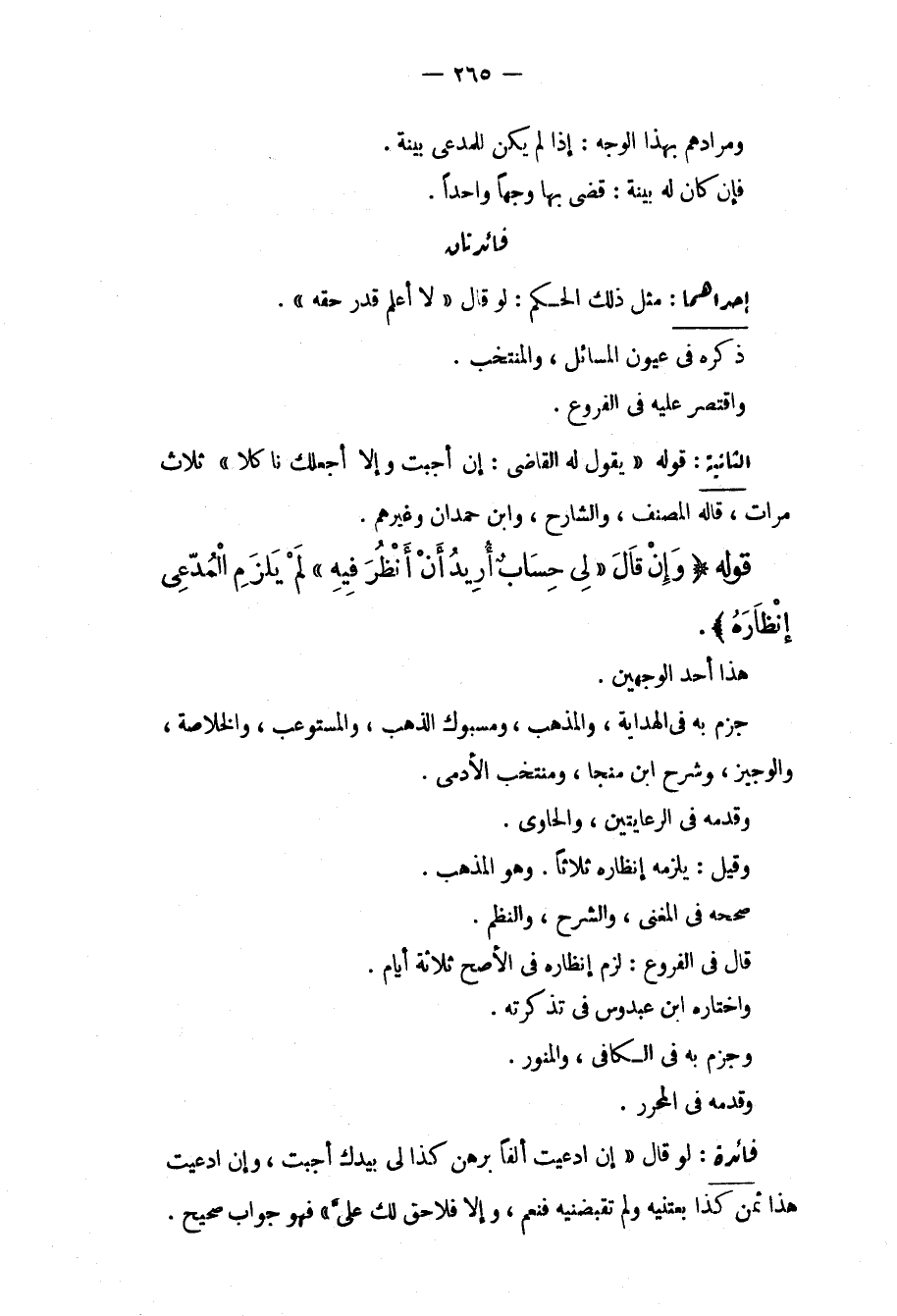 قَوْلُهُ (وَإِنْ قَالَ " لِي حِسَابٌ أُرِيدُ أَنْ أَنْظُرَ فِيهِ " لَمْ يَلْزَمْ الْمُدَّعِي إنْظَارَهُ) . هَذَا أَحَدُ الْوَجْهَيْنِ. جَزَمَ بِهِ فِي الْهِدَايَةِ، وَالْمُذَهَّبِ، وَمَسْبُوكِ الذَّهَبِ، وَالْمُسْتَوْعِبِ، وَالْخُلَاصَةِ، وَالْوَجِيزِ، وَشَرْحِ ابْنِ مُنَجَّا، وَمُنْتَخَبِ الْأَدَمِيِّ. وَقَدَّمَهُ فِي الرِّعَايَتَيْنِ، وَالْحَاوِي. وَقِيلَ: يَلْزَمُهُ إنْظَارُهُ ثَلَاثًا. وَهُوَ الْمَذْهَبُ. صَحَّحَهُ فِي الْمُغْنِي، وَالشَّرْحِ، وَالنَّظْمِ. قَالَ فِي الْفُرُوعِ: لَزِمَ إنْظَارُهُ فِي الْأَصَحِّ ثَلَاثَةَ أَيَّامٍ. وَاخْتَارَهُ ابْنُ عَبْدُوسٍ فِي تَذْكِرَتِهِ. وَجَزَمَ بِهِ فِي الْكَافِي، وَالْمُنَوِّرِ. وَقَدَّمَهُ فِي الْمُحَرَّرِ.