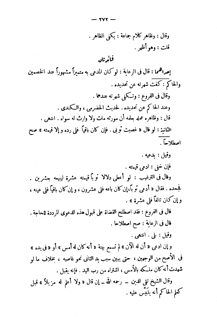 إحْدَاهُمَا: قَالَ فِي الرِّعَايَةِ: لَوْ كَانَ الْمُدَّعَى بِهِ مُتَمَيِّزًا مَشْهُورًا عِنْدَ الْخَصْمَيْنِ وَالْحَاكِمِ: كَفَّتْ شُهْرَتُهُ عَنْ تَحْدِيدِهِ. وَقَالَ فِي الْفُرُوعِ: وَتَكْفِي شُهْرَتُهُ عِنْدَهُمَا. وَعِنْدَ الْحَاكِمِ عَنْ تَحْدِيدِهِ. لِحَدِيثِ الْحَضْرَمِيِّ، وَالْكَنَدِيِّ. قَالَ: وَظَاهِرُهُ عَمَلُهُ بِعِلْمِهِ أَنَّ مُوَرِّثَهُ مَاتَ وَلَا وَارِثَ لَهُ سِوَاهُ. انْتَهَى.