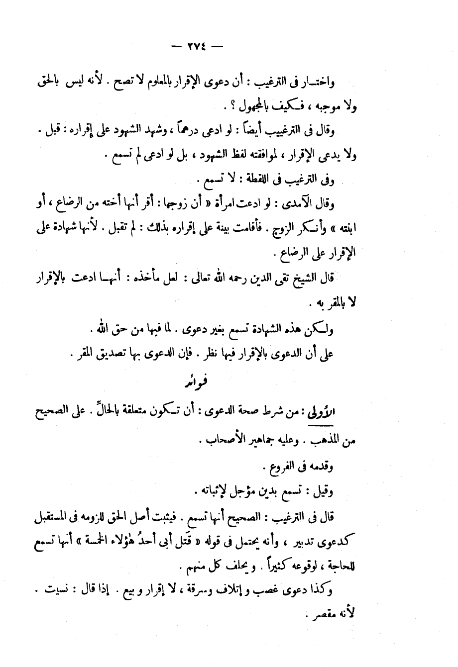 وَقَالَ فِي التَّرْغِيبِ أَيْضًا: لَوْ ادَّعَى دِرْهَمًا، وَشَهِدَ الشُّهُودُ عَلَى إقْرَارِهِ: قُبِلَ. وَلَا يَدَّعِي الْإِقْرَارَ، لِمُوَافَقَتِهِ لَفْظَ الشُّهُودِ، بَلْ لَوْ ادَّعَى لَمْ تُسْمَعْ. وَفِي التَّرْغِيبِ فِي اللُّقَطَةِ: لَا تُسْمَعُ. وَقَالَ الْآمِدِيُّ: لَوْ ادَّعَتْ امْرَأَةٌ " أَنَّ زَوْجَهَا: أَقَرَّ أَنَّهَا أُخْتُهُ مِنْ الرَّضَاعِ، أَوْ ابْنَتَهُ " وَأَنْكَرَ الزَّوْجُ. فَأَقَامَتْ بَيِّنَةً عَلَى إقْرَارِهِ بِذَلِكَ: لَمْ تُقْبَلْ. لِأَنَّهَا شَهَادَةٌ عَلَى الْإِقْرَارِ عَلَى الرَّضَاعِ. قَالَ الشَّيْخُ تَقِيُّ الدِّينِ - رَحِمَهُ اللَّهُ تَعَالَى -: لَعَلَّ مَأْخَذَهُ: أَنَّهَا ادَّعَتْ بِالْإِقْرَارِ لَا بِالْمُقَرِّ بِهِ. وَلَكِنْ هَذِهِ الشَّهَادَةُ تُسْمَعُ بِغَيْرِ دَعْوَى. لِمَا فِيهَا مِنْ حَقِّ اللَّهِ. عَلَى أَنَّ الدَّعْوَى بِالْإِقْرَارِ فِيهَا نَظَرٌ. فَإِنَّ الدَّعْوَى بِهَا تَصْدِيقُ الْمُقِرِّ. فَوَائِدُ