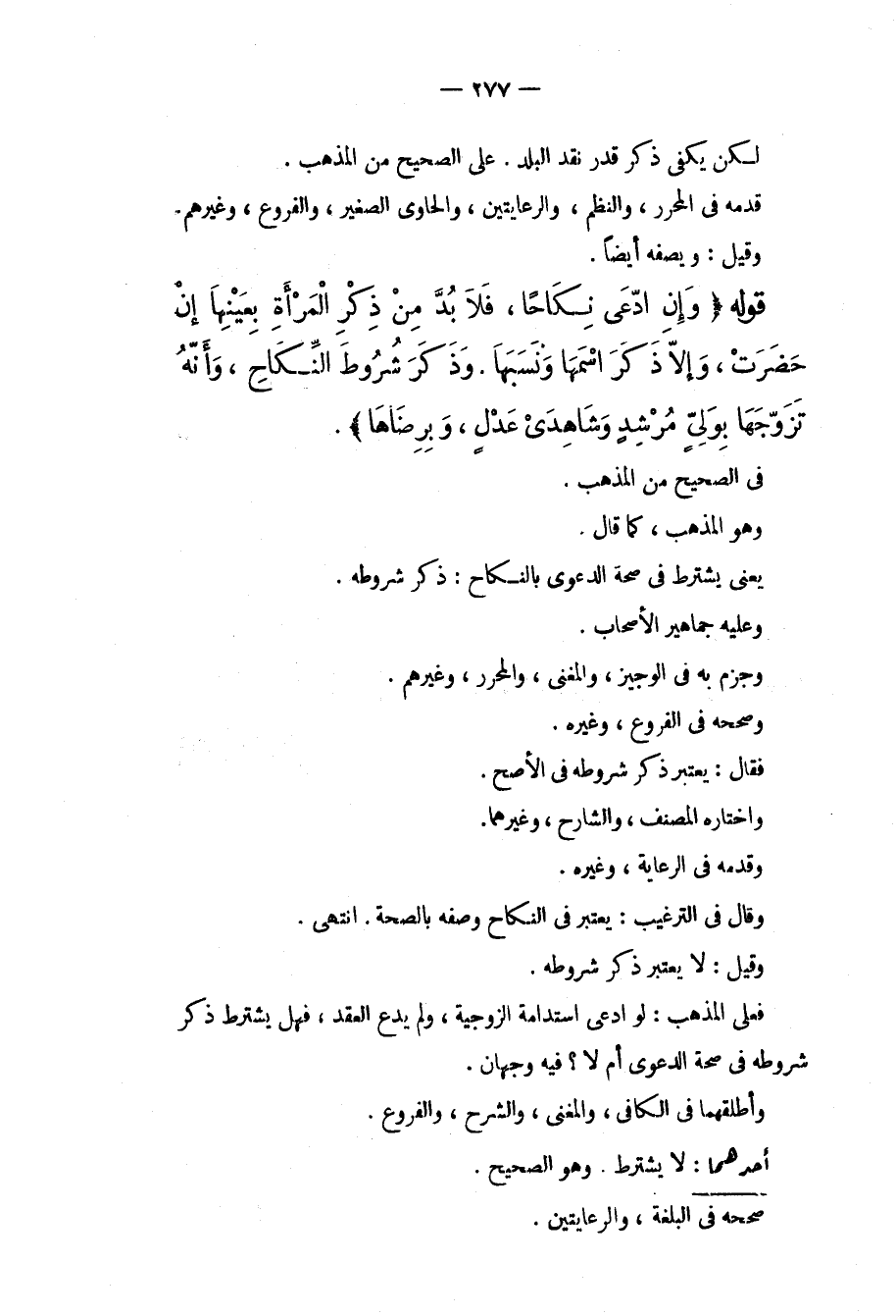 قَوْلُهُ وَإِنْ ادَّعَى نِكَاحًا، فَلَا بُدَّ مِنْ ذِكْرِ الْمَرْأَةِ بِعَيْنِهَا إنْ حَضَرَتْ، وَإِلَّا ذَكَرَ اسْمَهَا وَنَسَبَهَا. وَذَكَرَ شُرُوطَ النِّكَاحِ، وَأَنَّهُ تَزَوَّجَهَا بِوَلِيٍّ مُرْشِدٍ وَشَاهِدَيْ عَدْلٍ، وَبِرِضَاهَا. فِي الصَّحِيحِ مِنْ الْمَذْهَبِ. وَهُوَ الْمَذْهَبُ، كَمَا قَالَ يَعْنِي يُشْتَرَطُ فِي صِحَّةِ الدَّعْوَى بِالنِّكَاحِ: ذِكْرُ شُرُوطِهِ. وَعَلَيْهِ جَمَاهِيرُ الْأَصْحَابِ. وَجَزَمَ بِهِ فِي الْوَجِيزِ، وَالْمُغْنِي، وَالْمُحَرَّرِ، وَغَيْرِهِمْ. وَصَحَّحَهُ فِي الْفُرُوعِ، وَغَيْرِهِ. فَقَالَ: يُعْتَبَرُ ذِكْرُ شُرُوطِهِ فِي الْأَصَحِّ. وَاخْتَارَهُ الْمُصَنِّفُ، وَالشَّارِحُ، وَغَيْرُهُمَا. وَقَدَّمَهُ فِي الرِّعَايَةِ، وَغَيْرِهِ. وَقَالَهُ فِي التَّرْغِيبِ: يُعْتَبَرُ فِي النِّكَاحِ وَصْفُهُ بِالصِّحَّةِ. انْتَهَى. وَقِيلَ: لَا يُعْتَبَرُ ذِكْرُ شُرُوطِهِ. فَعَلَى الْمَذْهَبِ: لَوْ ادَّعَى اسْتِدَامَةَ الزَّوْجِيَّةِ، وَلَمْ يَدَّعِ الْعَقْدَ، فَهَلْ يُشْتَرَطُ ذِكْرُ شُرُوطِهِ فِي صِحَّةِ الدَّعْوَى أَمْ لَا؟ فِيهِ وَجْهَانِ. وَأَطْلَقَهُمَا فِي الْكَافِي، وَالْمُغْنِي، وَالشَّرْحِ، وَالْفُرُوعِ.