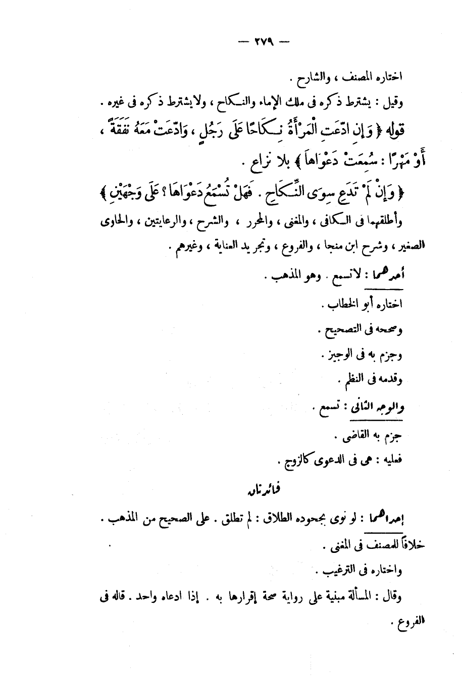 قَوْلُهُ (وَإِنْ ادَّعَتْ الْمَرْأَةُ نِكَاحًا عَلَى رَجُلٍ، وَادَّعَتْ مَعَهُ نَفَقَةً، أَوْ مَهْرًا: سُمِعَتْ دَعْوَاهَا) بِلَا نِزَاعٍ. (وَإِنْ لَمْ تَدَّعِ سِوَى النِّكَاحِ. فَهَلْ تُسْمَعُ دَعْوَاهَا؟ عَلَى وَجْهَيْنِ) وَأَطْلَقَهُمَا فِي الْكَافِي، وَالْمُغْنِي، وَالْمُحَرَّرِ، وَالشَّرْحِ، وَالرِّعَايَتَيْنِ، وَالْحَاوِي الصَّغِيرِ، وَشَرْحِ ابْنِ مُنَجَّا، وَالْفُرُوعِ، وَتَجْرِيدِ الْعِنَايَةِ، وَغَيْرِهِمْ.