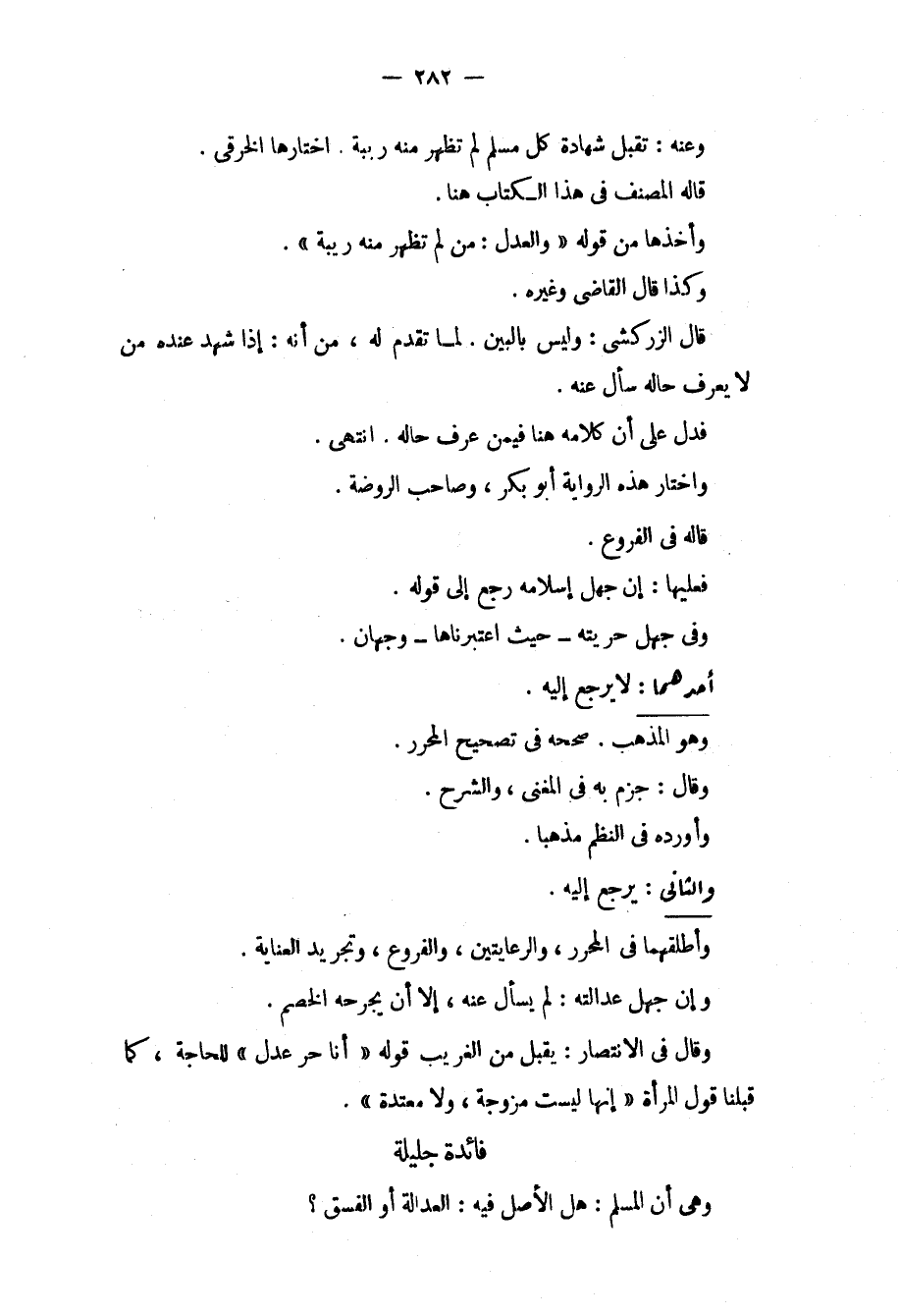 وَعَنْهُ: تُقْبَلُ شَهَادَةُ كُلِّ مُسْلِمٍ لَمْ تَظْهَرْ مِنْهُ رِيبَةٌ اخْتَارَهَا الْخِرَقِيُّ. قَالَهُ الْمُصَنِّفُ فِي هَذَا الْكِتَابِ هُنَا. وَأَخَذَهَا مِنْ قَوْلِهِ " وَالْعَدْلُ: مَنْ لَمْ تَظْهَرْ مِنْهُ رِيبَةٌ ". وَكَذَا قَالَ الْقَاضِي وَغَيْرُهُ. قَالَ الزَّرْكَشِيُّ: وَلَيْسَ بِالْبَيِّنِ. لِمَا تَقَدَّمَ لَهُ، مِنْ أَنَّهُ: إذَا شَهِدَ عِنْدَهُ مَنْ لَا يَعْرِفُ سَأَلَ عَنْهُ. فَدَلَّ عَلَى أَنَّ كَلَامَهُ هُنَا فِيمَنْ عَرَفَ. انْتَهَى. وَاخْتَارَ هَذِهِ الرِّوَايَةَ أَبُو بَكْرٍ، وَصَاحِبُ الرَّوْضَةِ. قَالَهُ فِي الْفُرُوعِ. فَعَلَيْهَا: إنَّ جَهِلَ إسْلَامَهُ رَجَعَ إلَى قَوْلِهِ. وَفِي جَهْلِ حُرِّيَّتِهِ حَيْثُ اعْتَبَرْنَاهَا وَجْهَانِ.